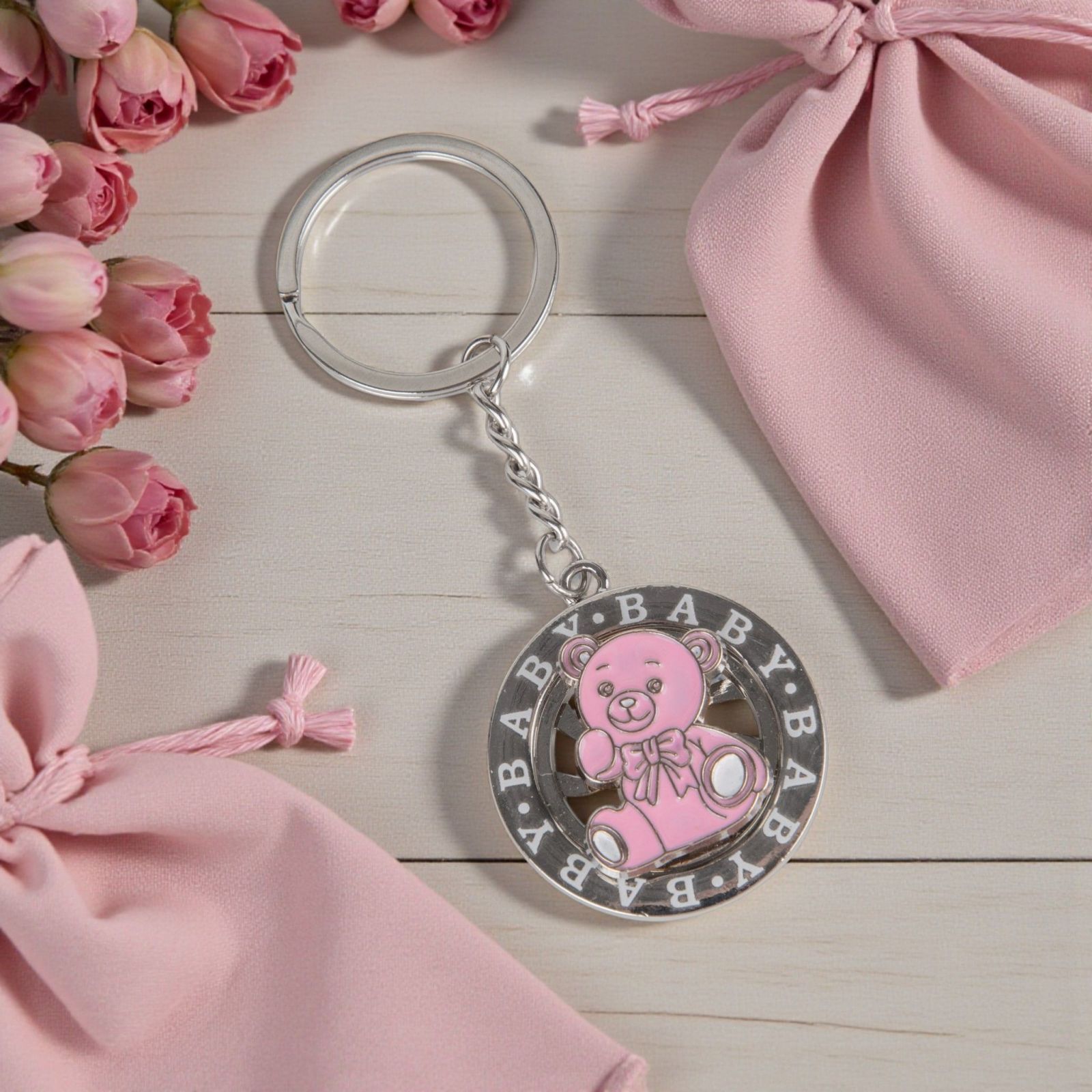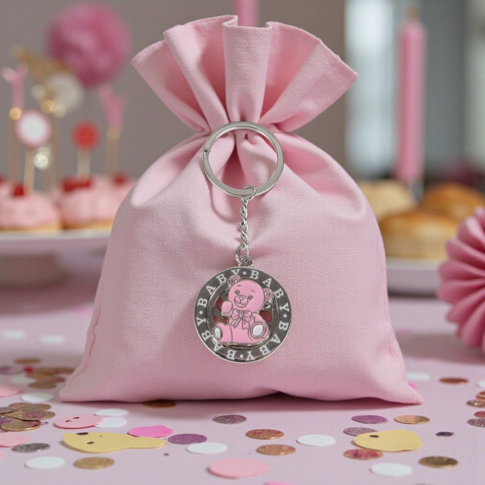 Quando si celebra l'arrivo di una nuova vita, ogni dettaglio conta. La nostra bomboniera portachiavi ruota con scritta "baby" e orsetto rosa è il modo perfetto per condividere la gioia di un evento così speciale come una nascita, un battesimo o il primo compleanno della vostra piccola. Questo dolce pensiero è progettato per rimanere nel cuore degli ospiti, ricordando loro un momento indimenticabile.