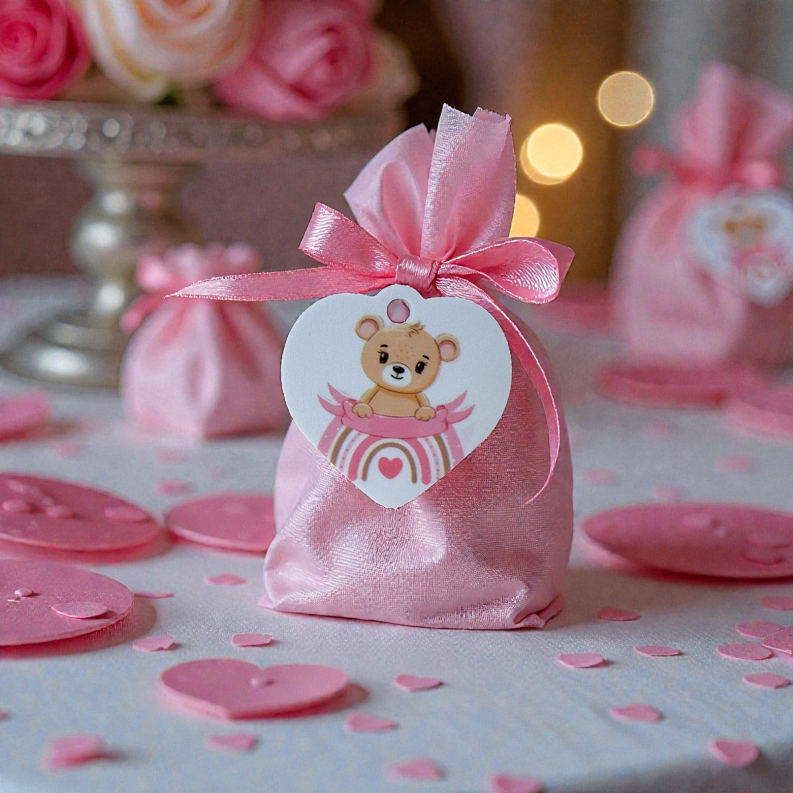 Non lasciare che questi momenti preziosi svaniscano nel tempo. Scegli il nostro ciondolo con orsetto e arcobaleno rosa per regalare un sorriso e un ricordo eterno, perfetto per celebrare l'arrivo della tua piccola gioia. Con questo regalo, ogni invitato porterà a casa un pezzo del tuo amore e della tua felicità.