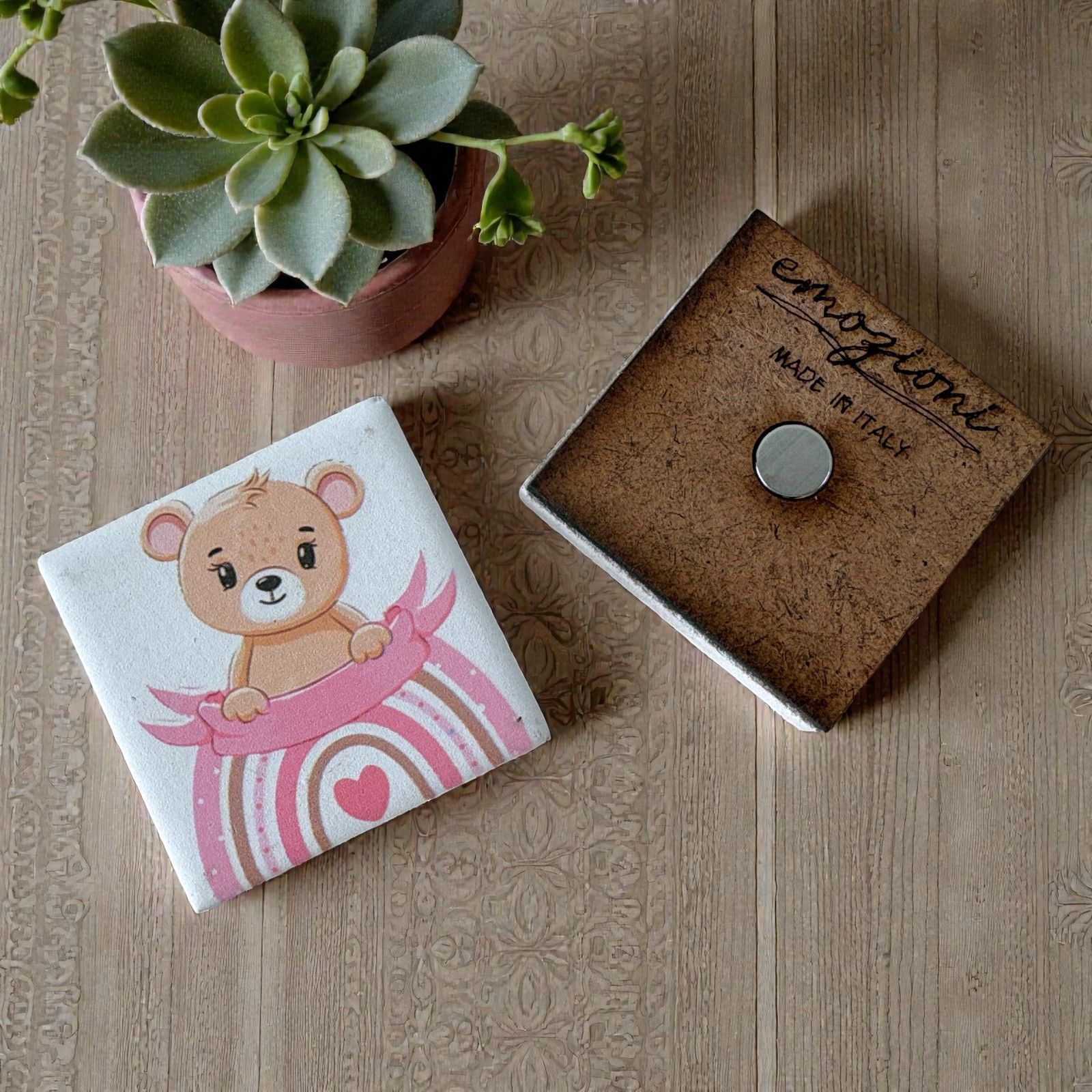 Scopri la dolcezza di un momento indimenticabile con la nostra calamita con orsetto e arcobaleno rosa. Perfetta come bomboniera per la nascita o il battesimo della tua bambina, questo magnete non è solo un oggetto, ma un simbolo di amore e gioia da condividere con gli invitati. Realizzata in resina di alta qualità, questa calamita si trasforma in un prezioso ricordo da custodire per sempre.
