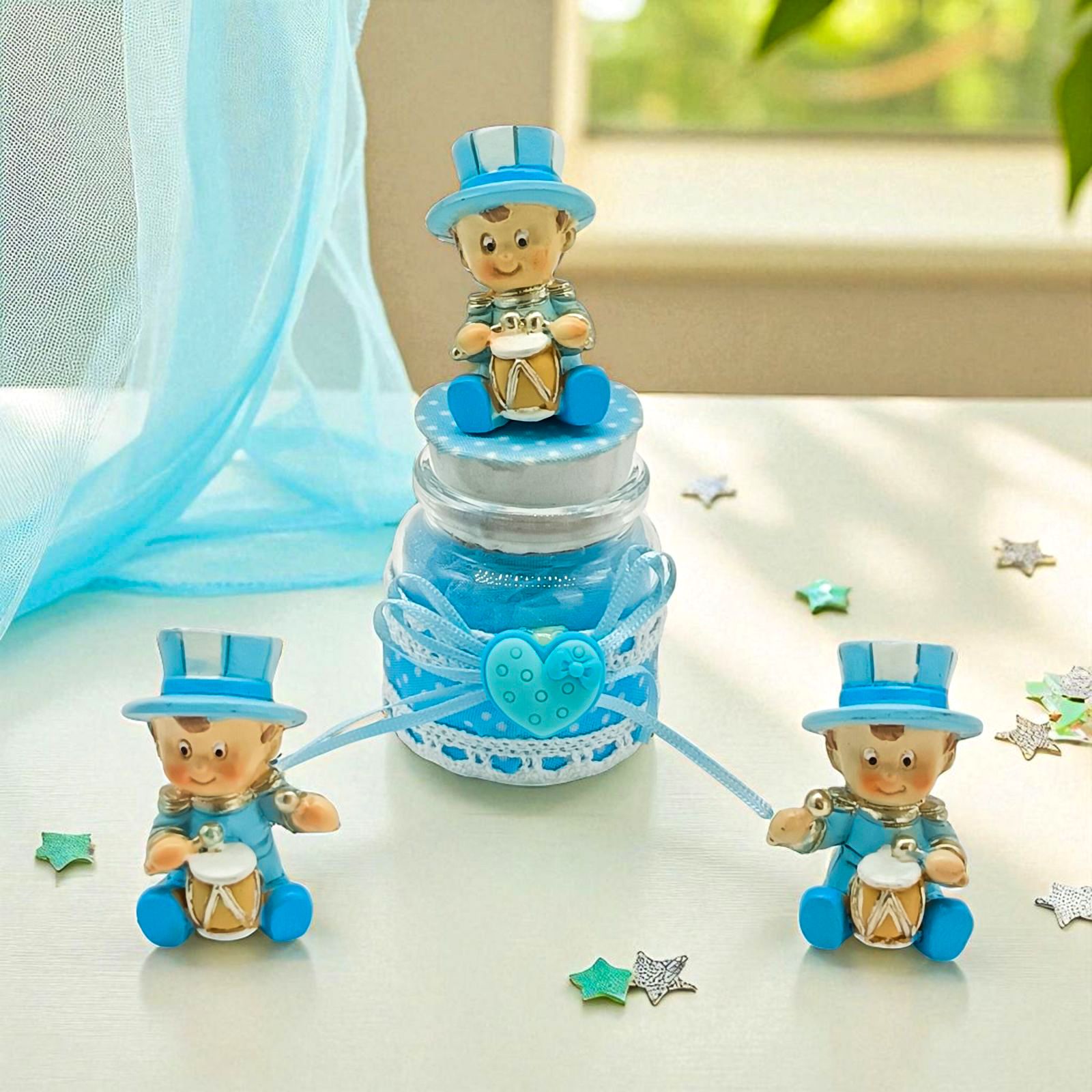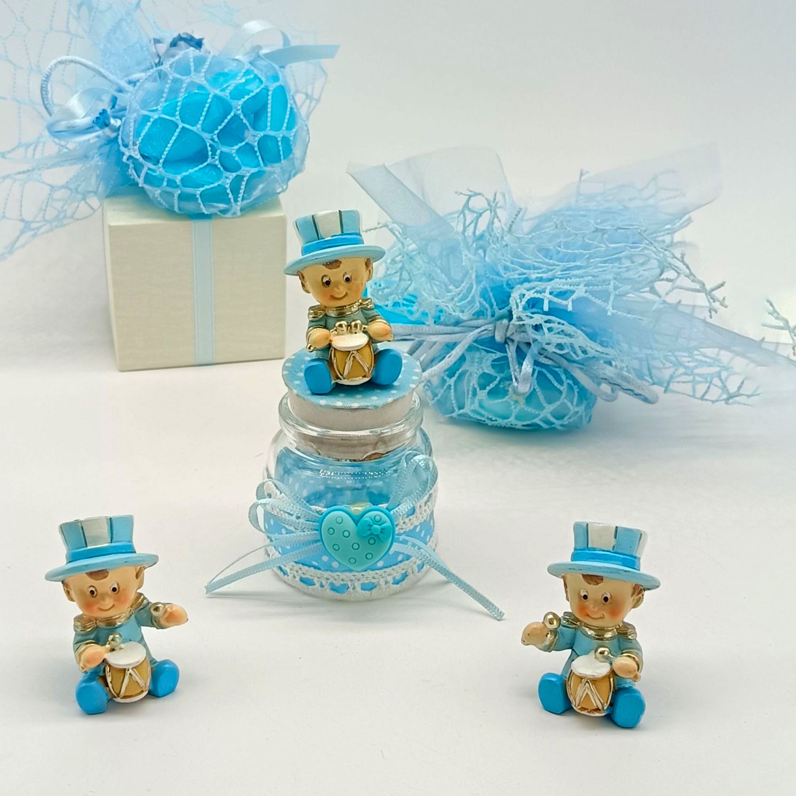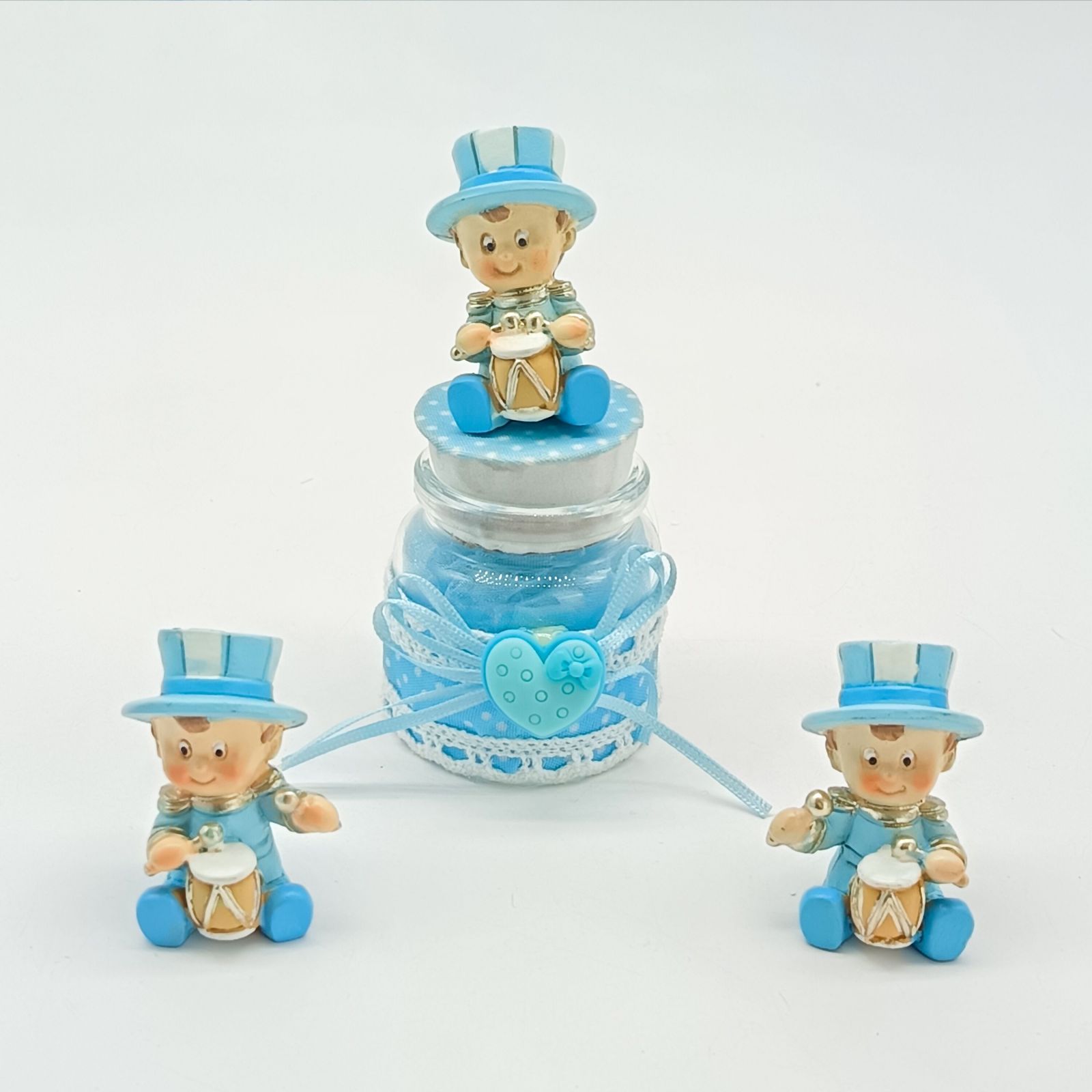 Allegro, dolce e curato nei dettagli: questo portaconfetti è la bomboniera perfetta per la nascita, il battesimo o il primo compleanno di un maschietto. Il barattolino in vetro è decorato con pois, pizzo e un tenero cuoricino, e chiuso da un tappo in sughero con un simpatico bimbo vestito da jolly con tamburo, assortito in 3 pose diverse.