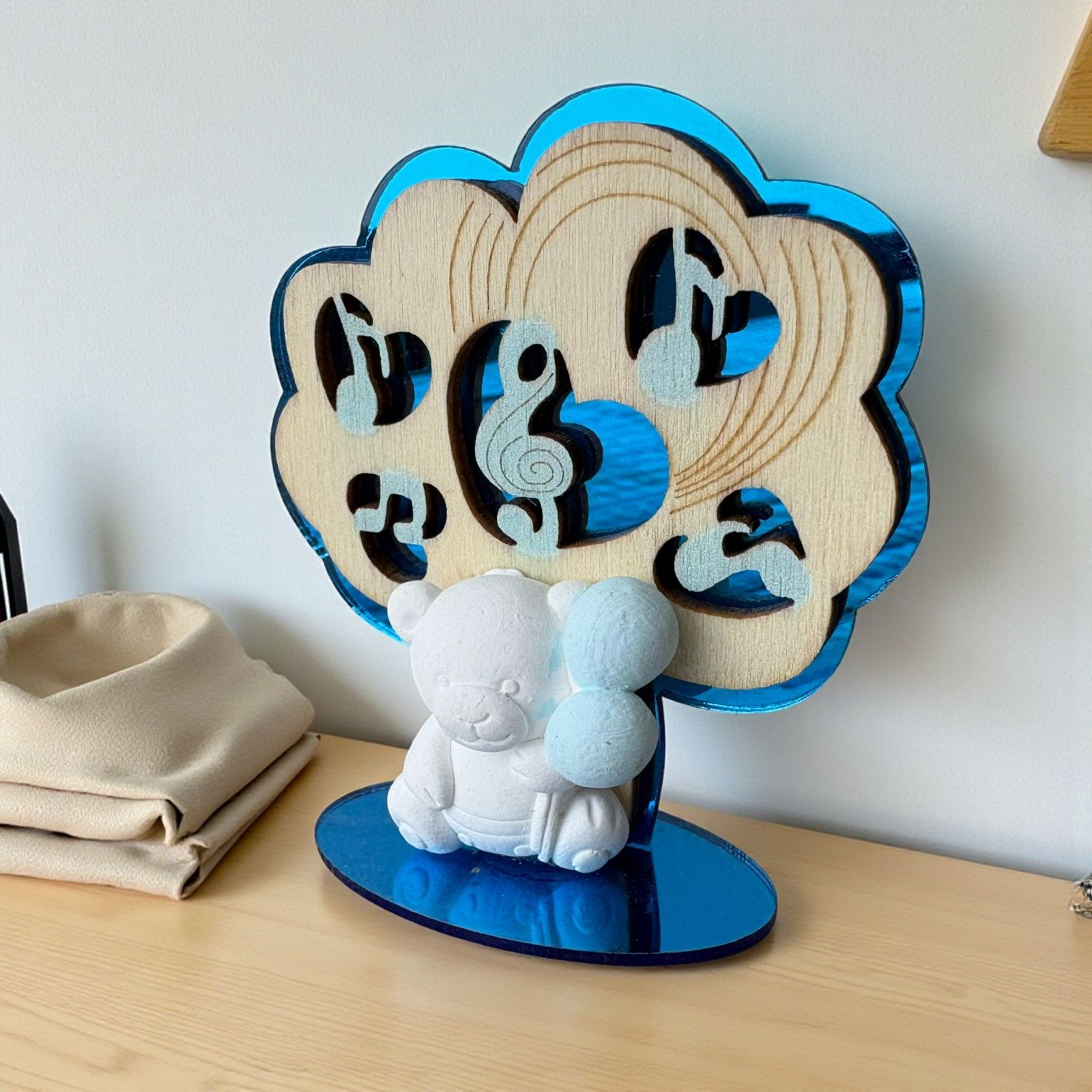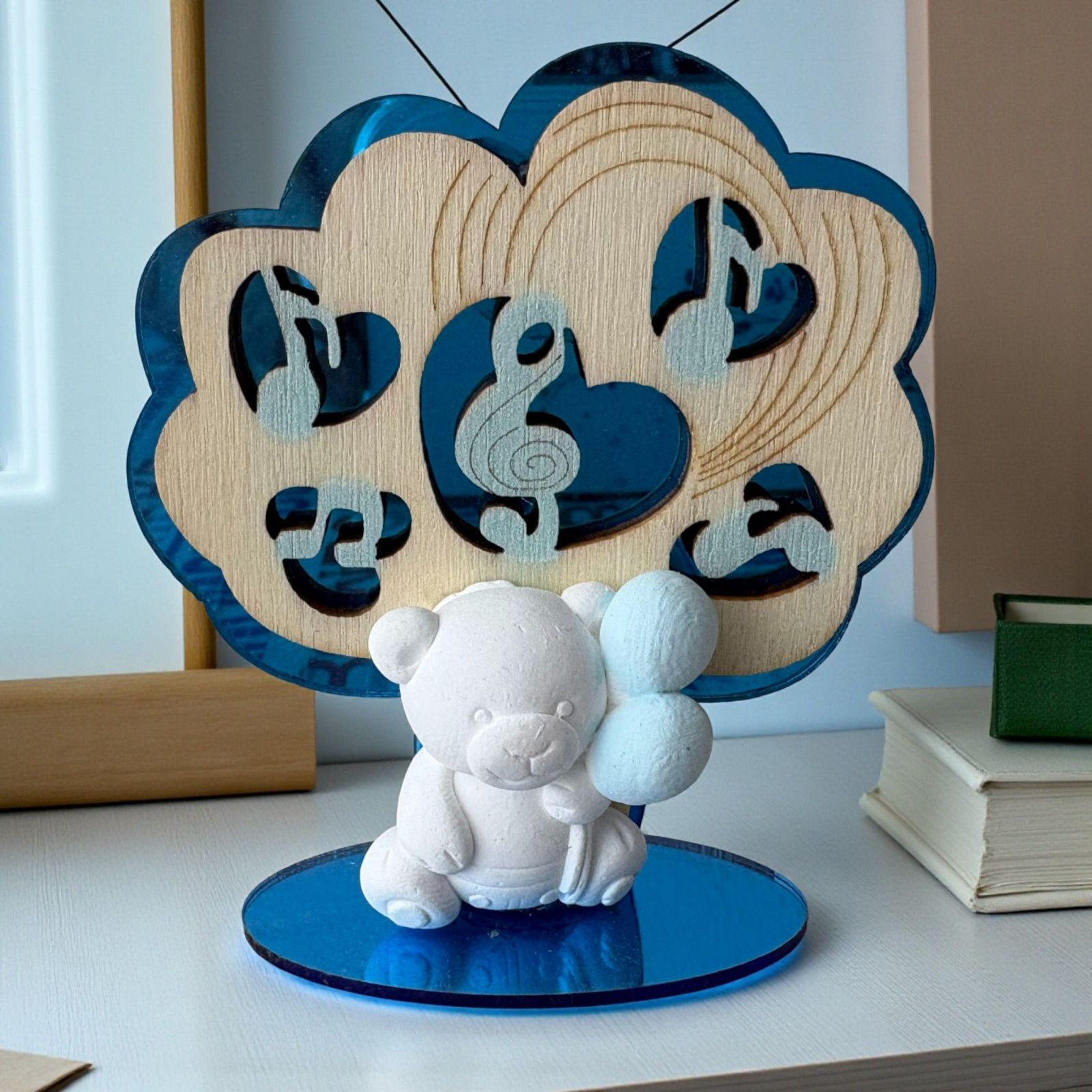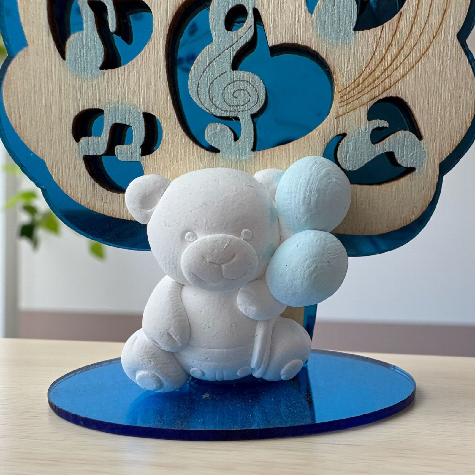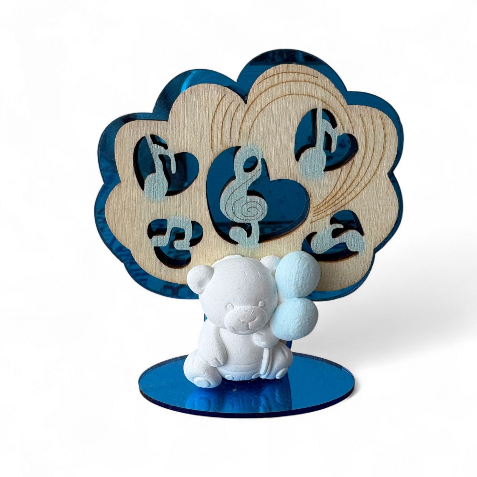 Realizzato con materiali di alta qualità, il fondo e la base in plexiglass blu si abbinano splendidamente alla sagoma a forma di albero in legno, adornata da note musicali celesti. L'orsetto, in gesso bianco, tiene delicatamente dei palloncini celesti, rendendo questa bomboniera una scelta perfetta per aggiungere un tocco di tenerezza ai tuoi eventi speciali.