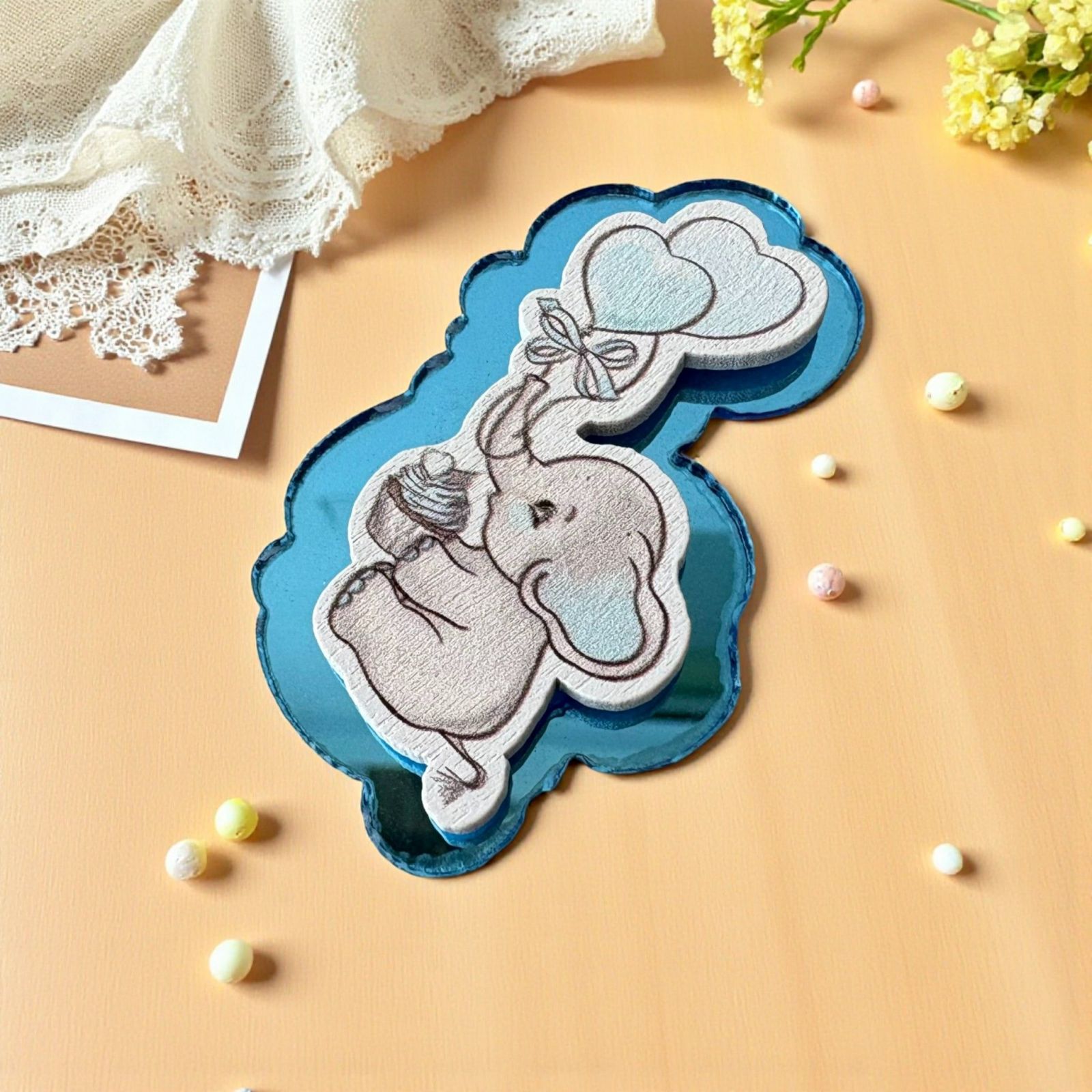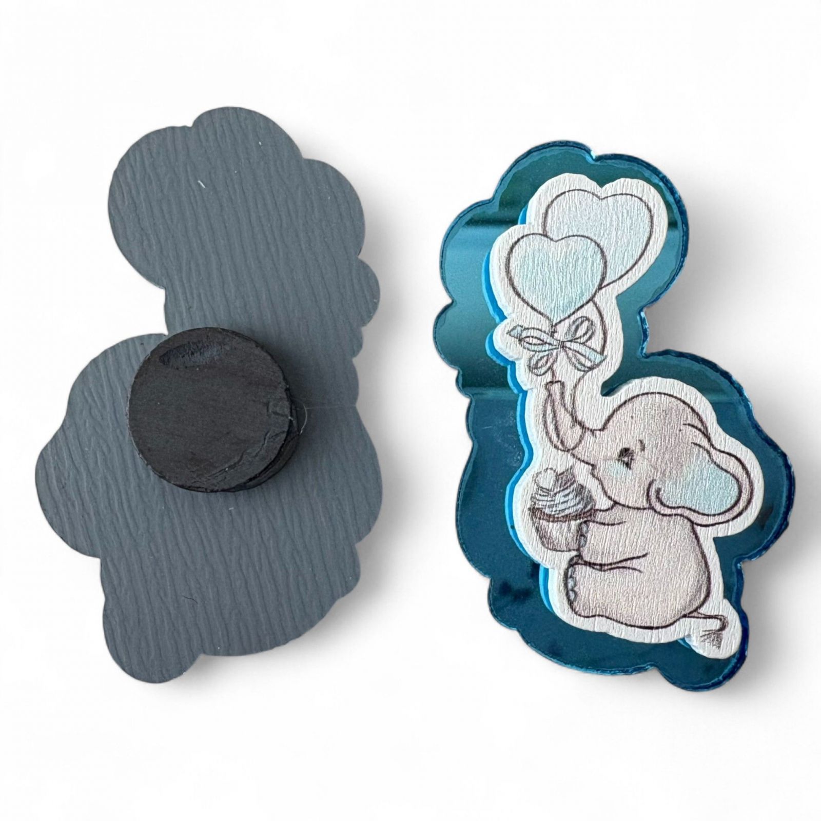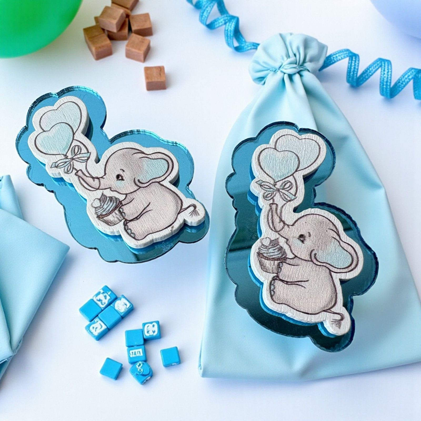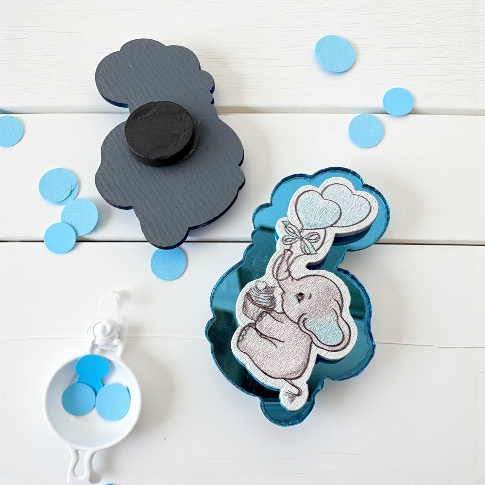 Realizzata in un affascinante colore azzurro specchiato, questa calamita è un vero capolavoro di artigianato. Il design, che unisce il plexiglass e il legno, presenta una dolce sagoma di elefantino accompagnata da delicati palloncini a forma di cuore celesti. Ogni dettaglio è pensato per trasmettere la gioia e la dolcezza di avere un bambino nella propria vita.