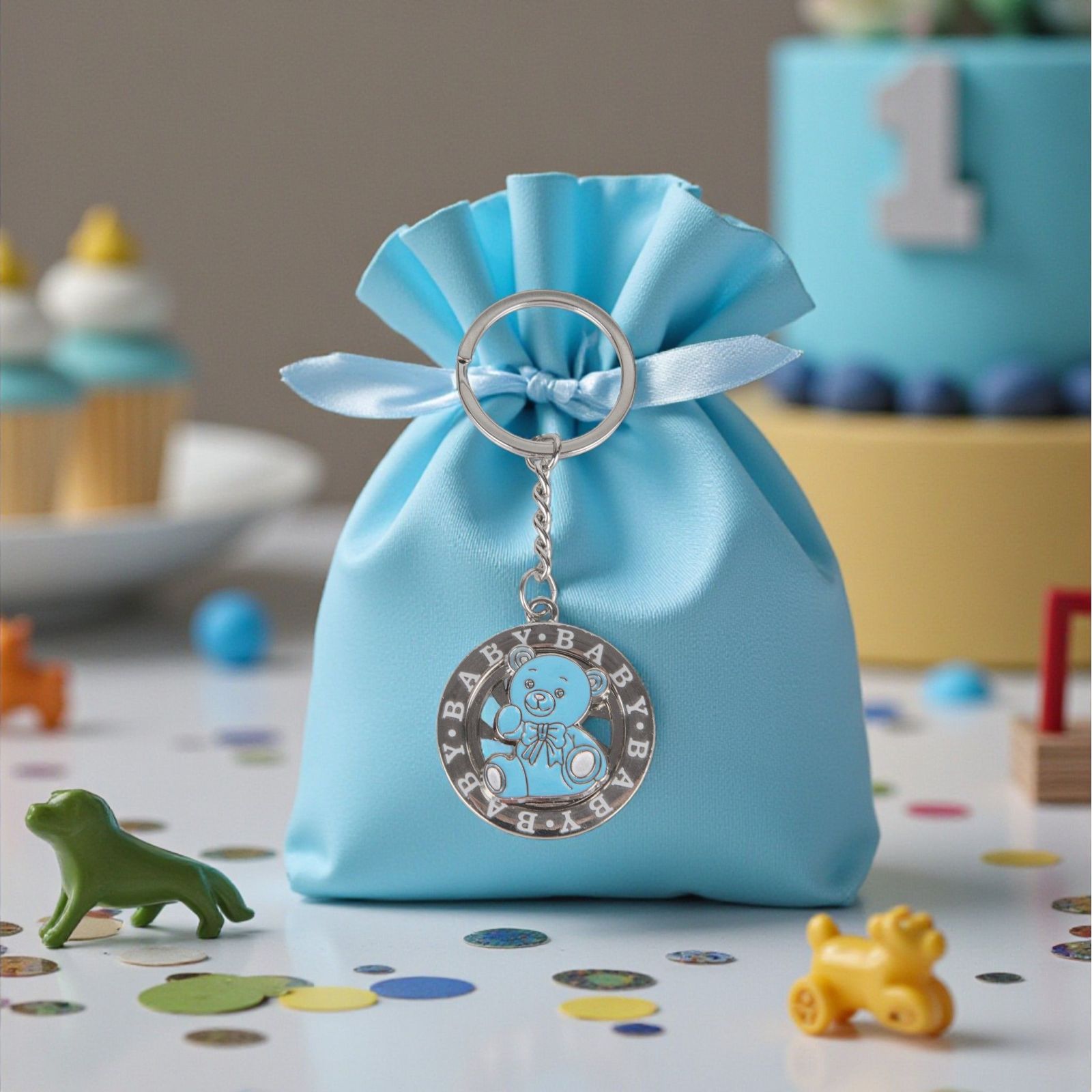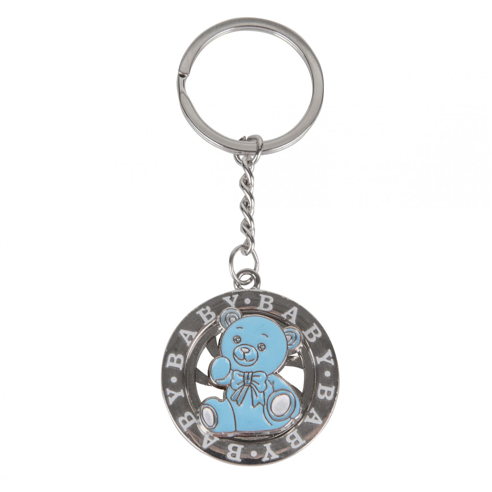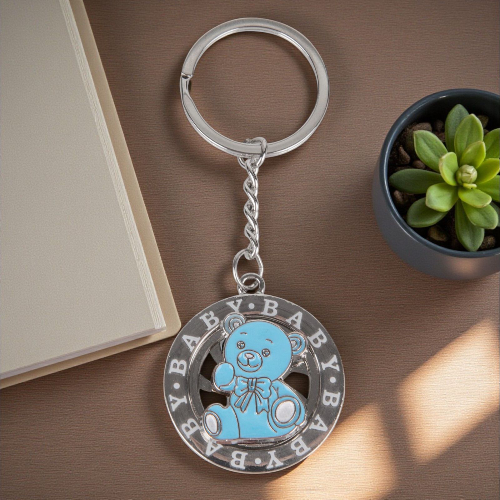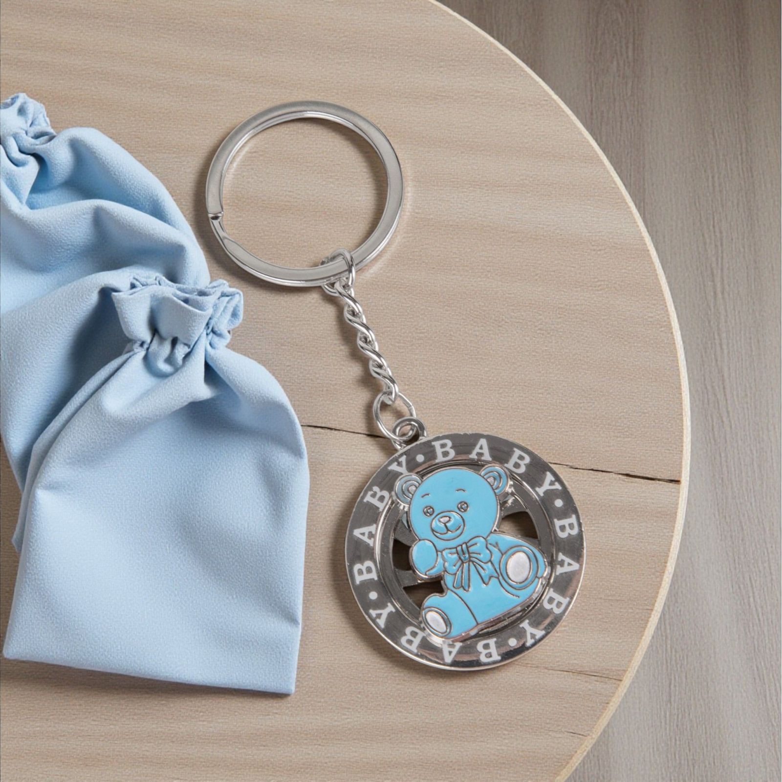 Ogni momento speciale merita di essere celebrato con un tocco di magia. Il nostro portachiavi ruota con la dolce scritta "baby" e un adorabile orsetto celeste azzurro rappresenta un pensiero unico e indimenticabile per festeggiare eventi come la nascita, il battesimo o il primo compleanno del tuo piccolo. Questo raffinato oggetto non è solo un'accessorio, ma un simbolo d'amore e di gioia da condividere con amici e familiari.