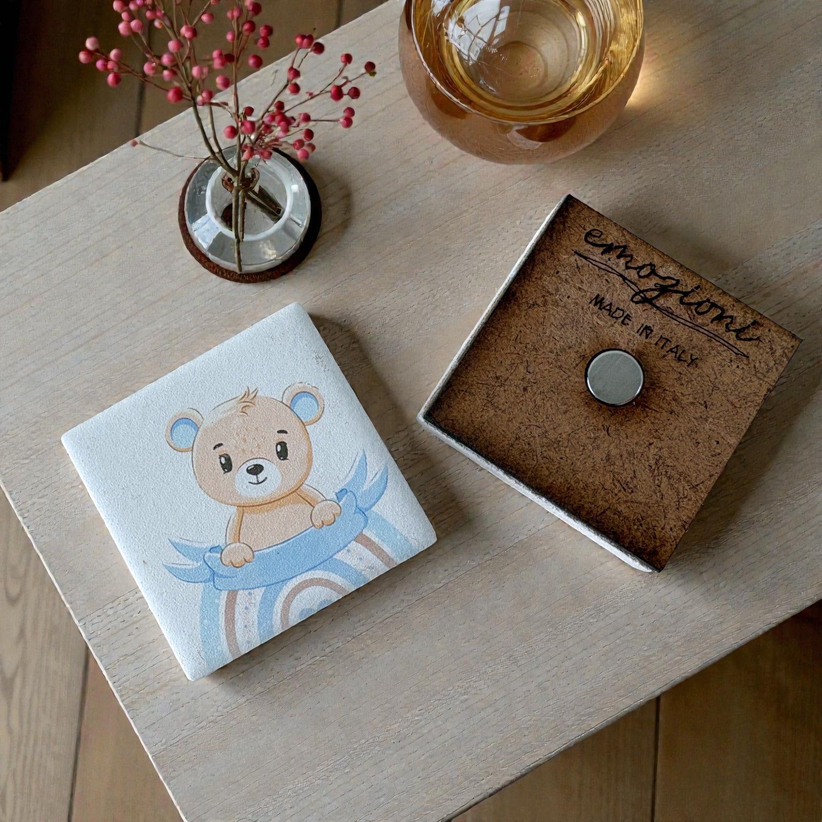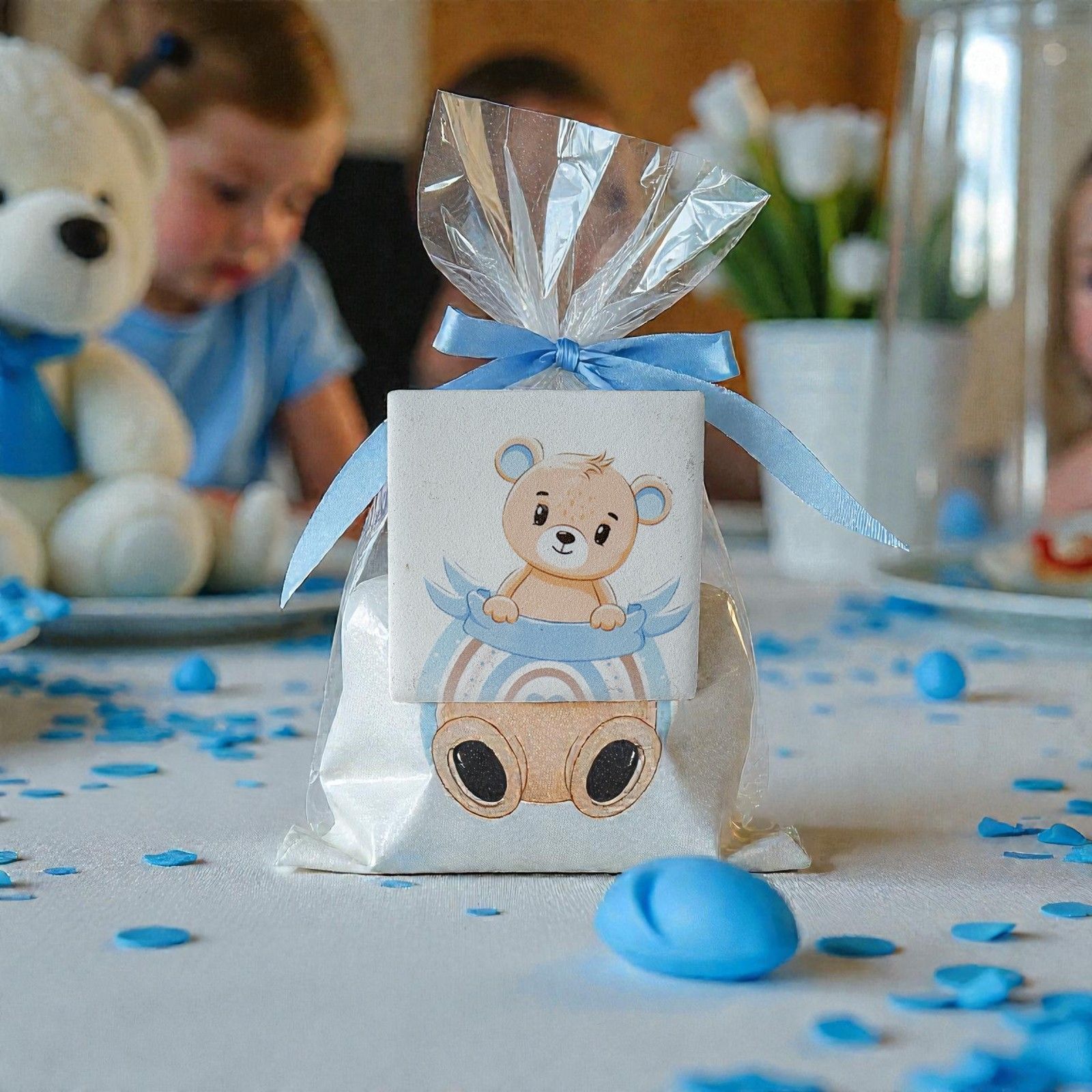 Porta la gioia della nascita e del battesimo con il nostro esclusivo magnete con arcobaleno e orsetto azzurro. Questo adorabile segnaposto è un simbolo di amore e felicità, perfetto per celebrare i momenti più speciali della vita del tuo bambino. Ogni volta che qualcuno lo vedrà, sarà ricordato di quel giorno magico in cui tutto ha avuto inizio, facendo brillare il cuore di tutti i presenti.