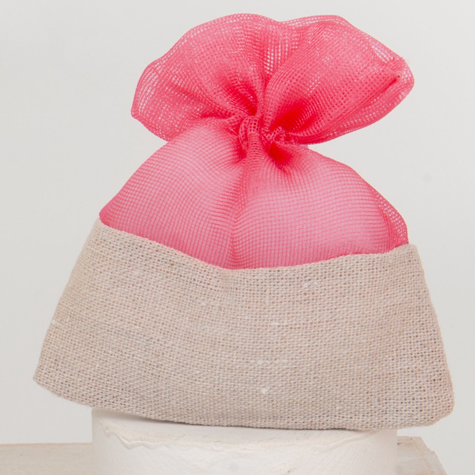Questo elegante sacchetto portaconfetti con tiranti bicolore è perfetto per rendere speciale il tuo evento. Realizzato in morbido cotone, ha dimensioni di circa 10 x 12 cm ed è disponibile nei colori corallo e beige.
