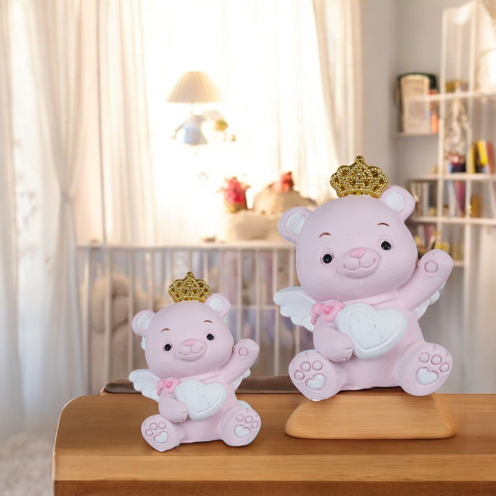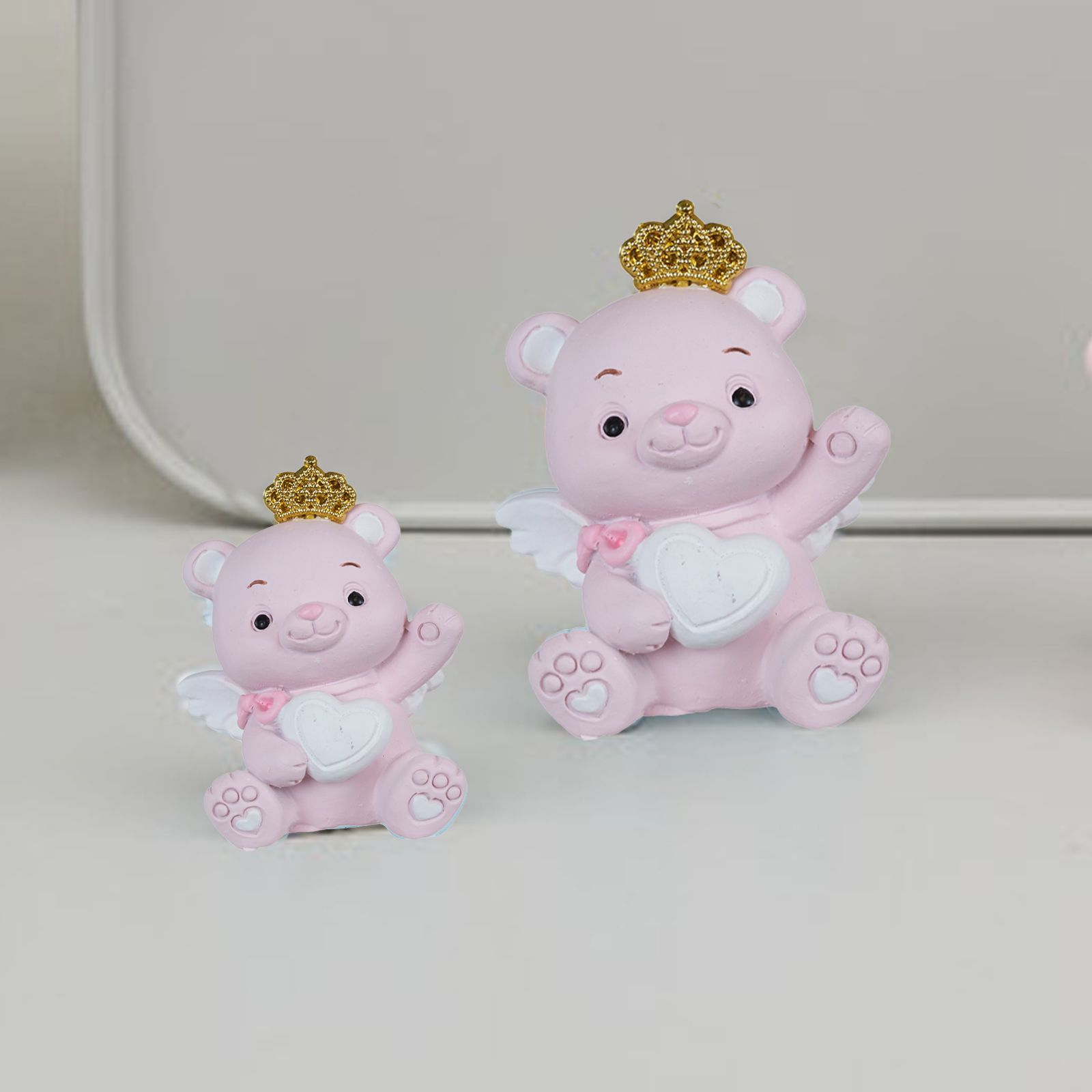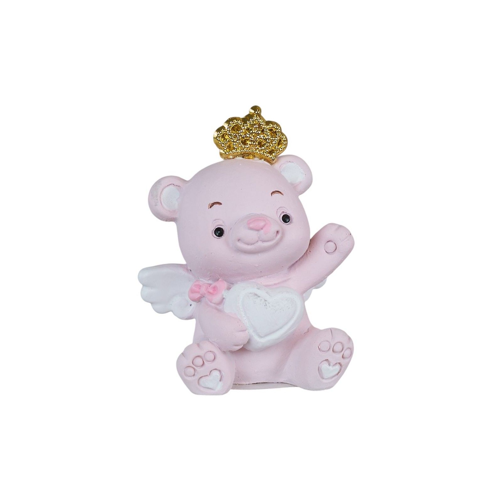 Realizzato in resina di alta qualità, l'Orsetto è disponibile in due dimensioni: Standard (3 x 2,5 x 4 cm) e Grande (4,5 x 4 x 5,5 cm). Il delicato colore rosa con corona dorata aggiunge eleganza e raffinatezza, rendendo questo dono particolare e originale.