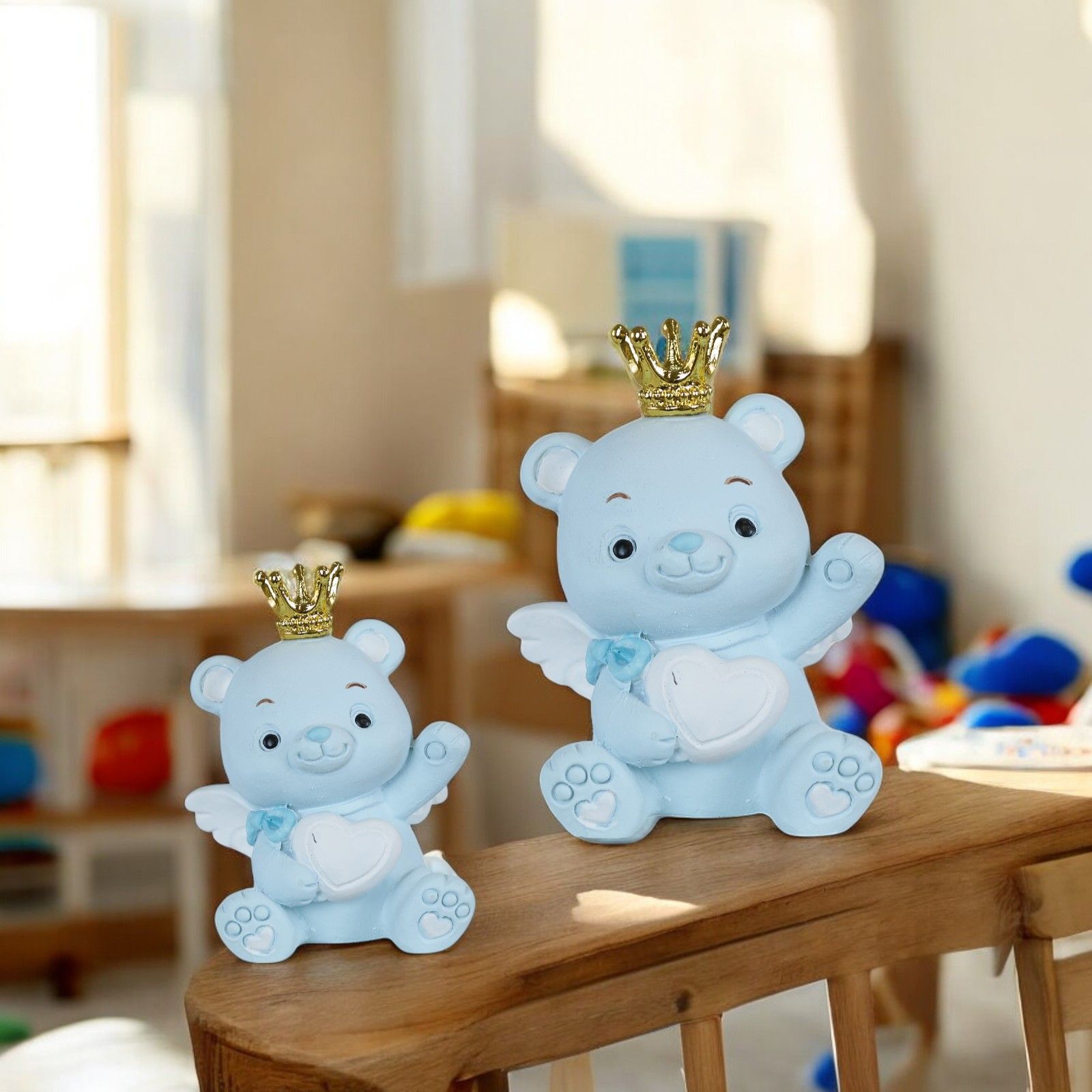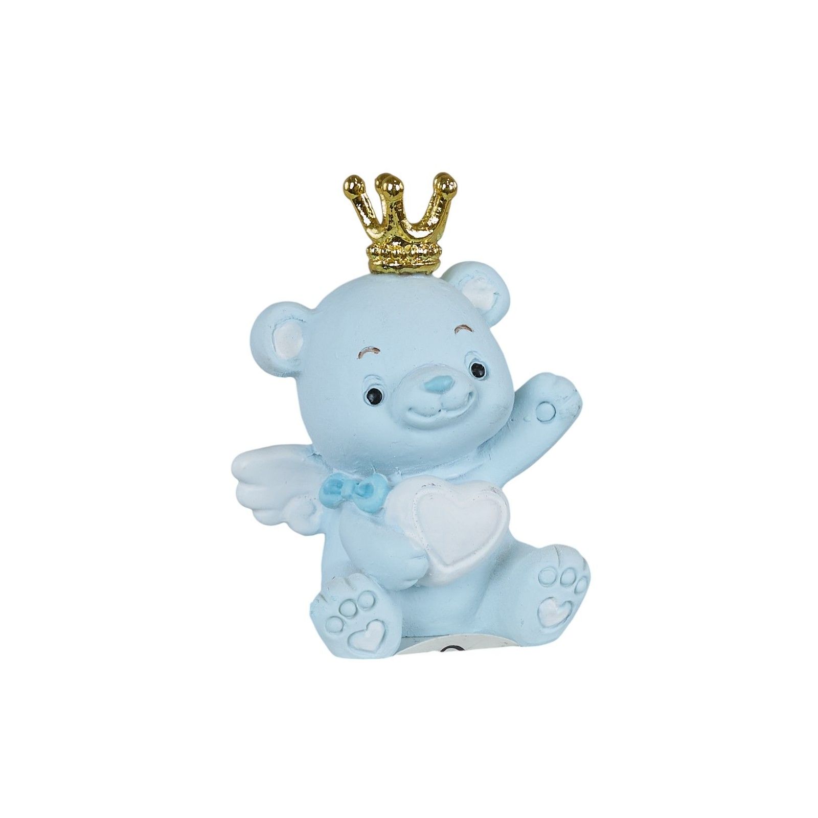 Il dolce orsetto con corona e cuore tra le mani è perfetto per celebrare la nascita, il battesimo, il compleanno o il baby shower. Realizzato in resina di alta qualità, è disponibile in due dimensioni: Standard (3 x 2,5 x 4 cm) e Grande (4,5 x 4 x 5,5 cm). Il colore celeste con corona dorata aggiunge un tocco regale e raffinato.
