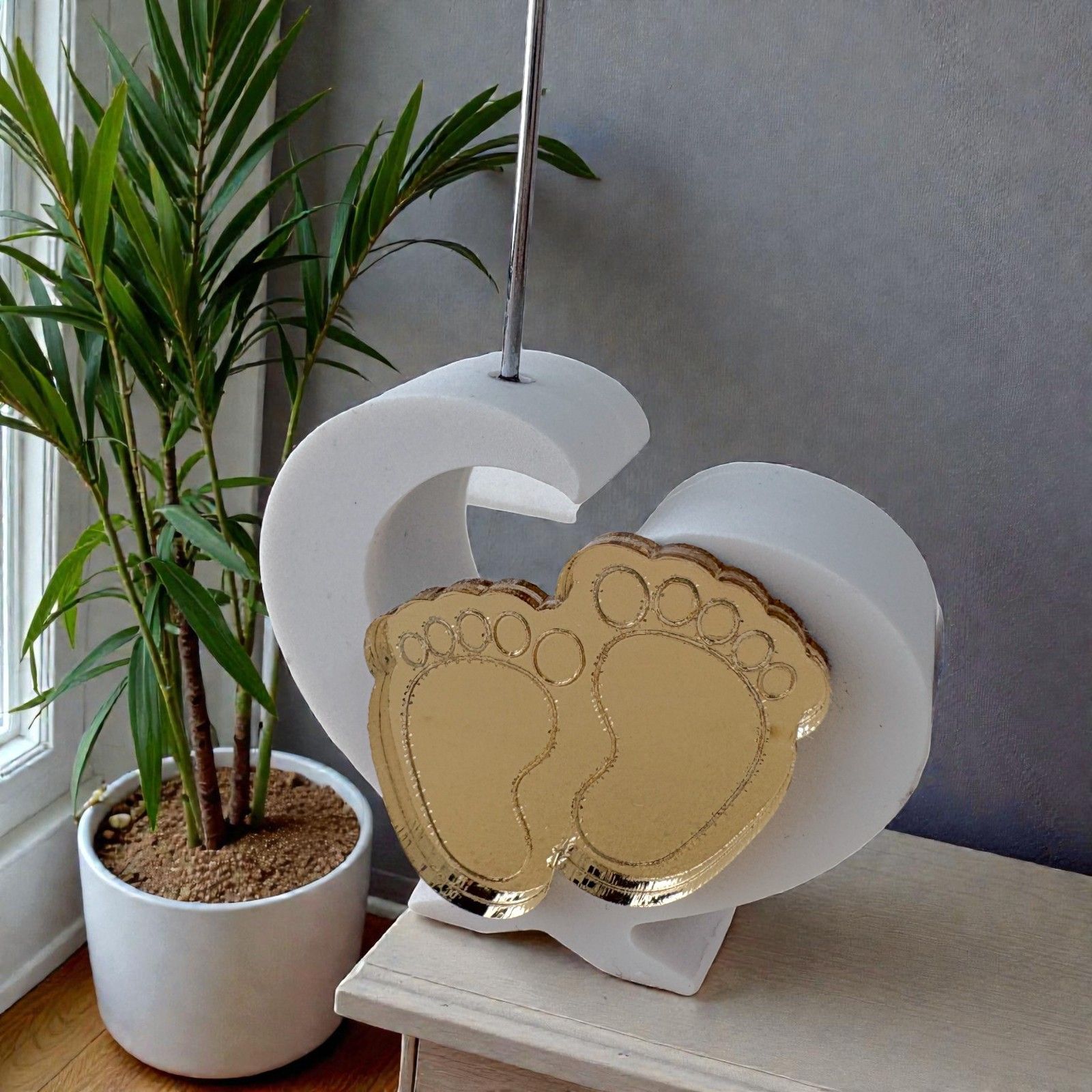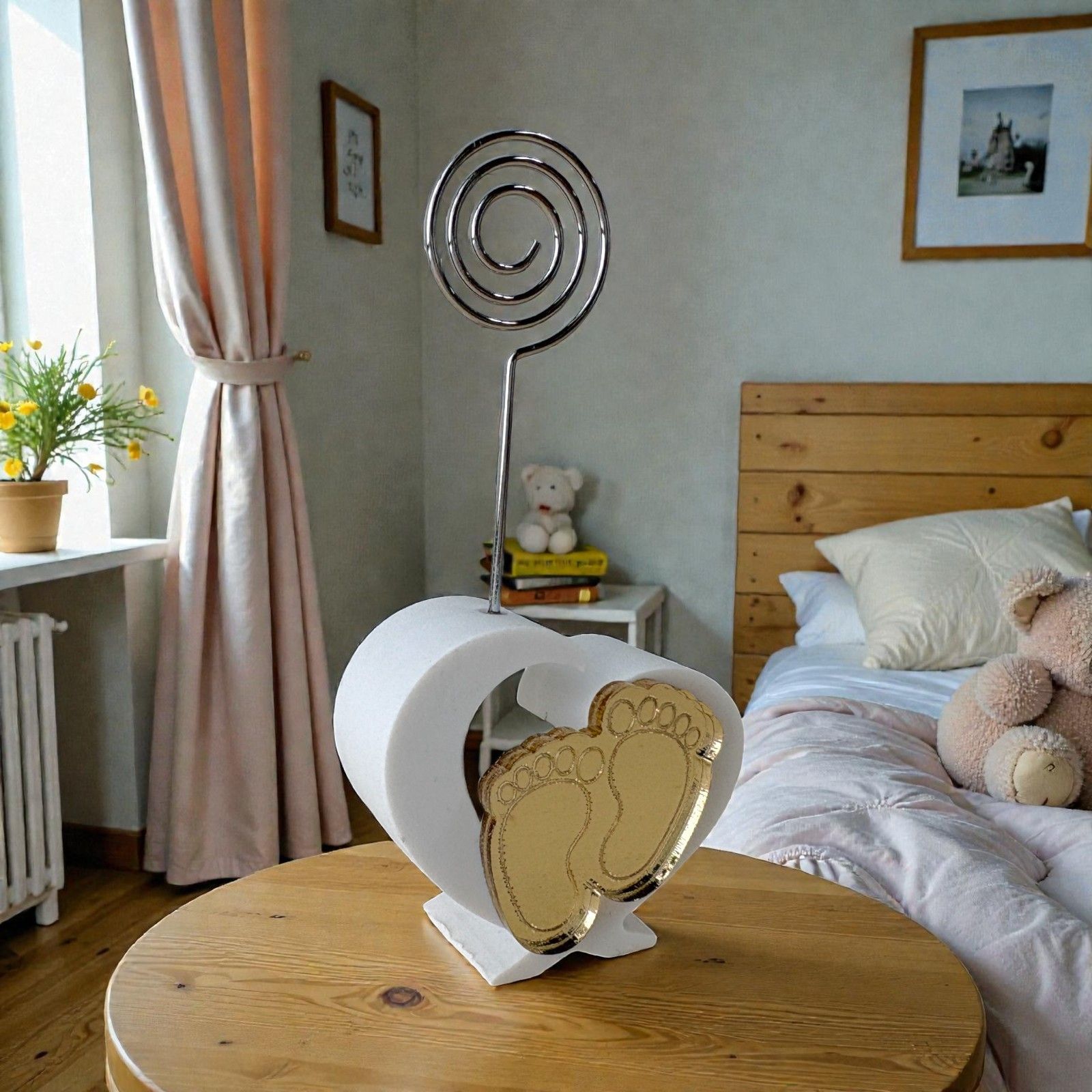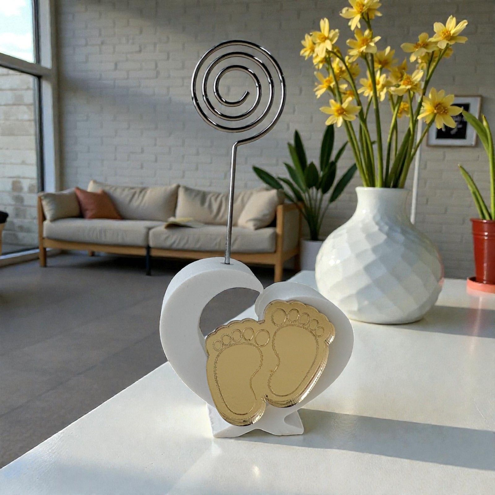 Realizzato in pregiata resina bianca, il portamemo a forma di cuore è elegantemente decorato con due piedini dorati in plexiglass, un tocco che rappresenta i primi passi di un lungo cammino. L'asta in metallo a spirale permette di inserire una foto o un bigliettino, rendendo ogni bomboniera unica e personale. Immagina la gioia degli ospiti nel ricevere un oggetto così significativo, perfetto per ricordare il giorno del battesimo o la celebrazione del primo compleanno.