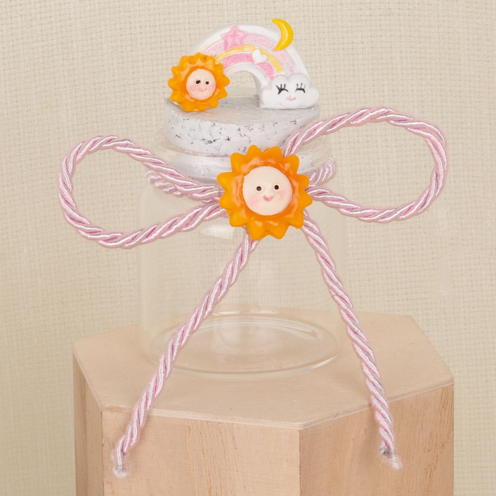 Per un evento speciale come il battesimo di una dolce bimba, non c'è regalo migliore di una bomboniera unica e originale come questo barattolo con tappo decorato con un arcobaleno e una nuvoletta sorridente. La cordicina con fiocco e sole centrale aggiunge un tocco di dolcezza e allegria a questo pensierino che sicuramente sarà apprezzato dagli invitati.