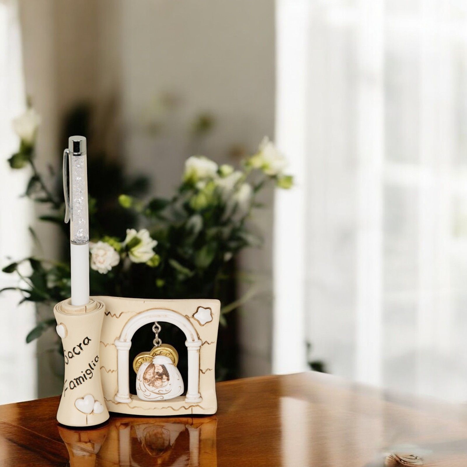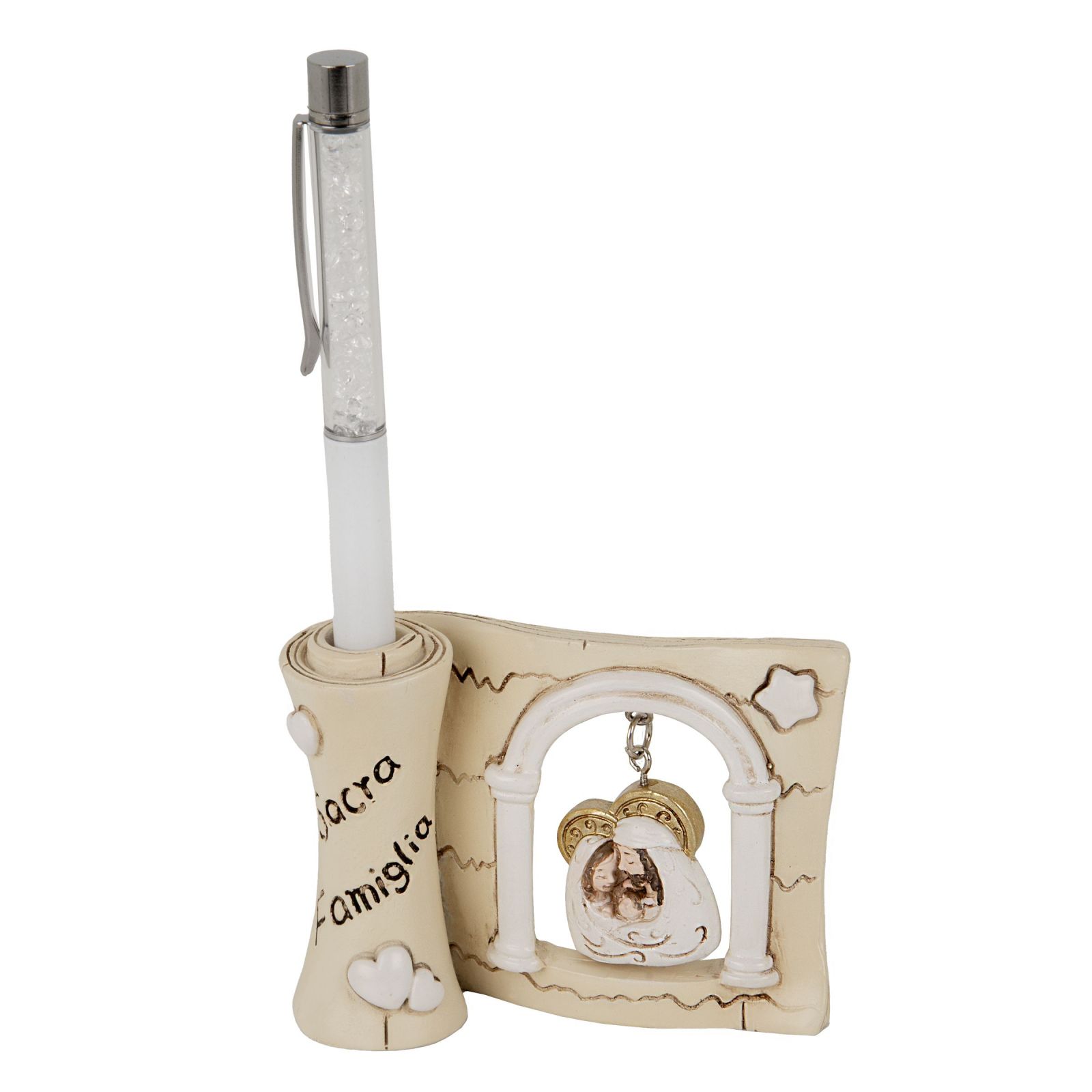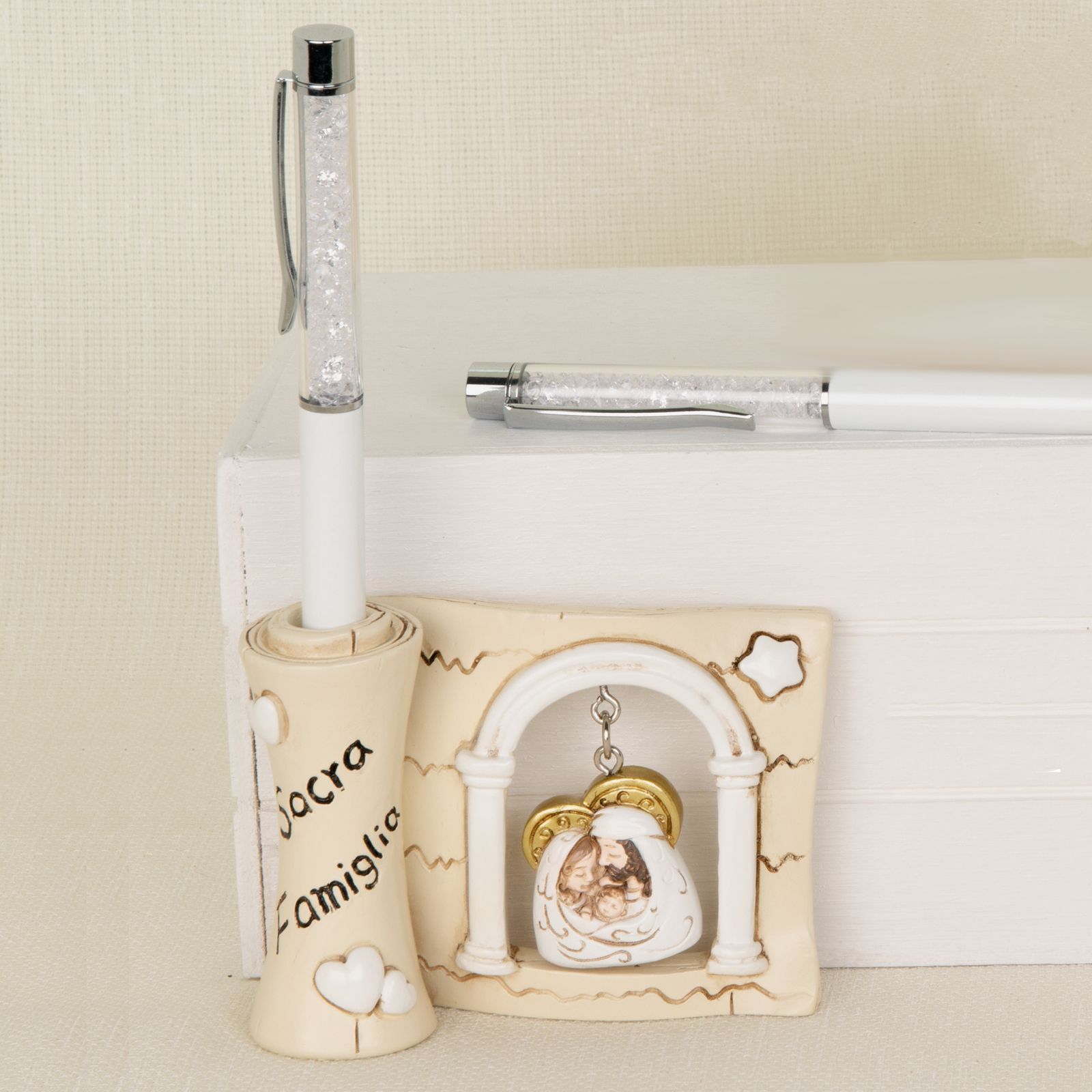 Questa icona sacra a forma di pergamena è un regalo perfetto per eventi speciali come battesimi, comunioni e cresime. Realizzata in resina di alta qualità, questa bomboniera è caratterizzata da colori pastello e misura circa 10 cm di larghezza e 17 cm di altezza. Sul lato destro è presente un ciondolo raffigurante la Sacra Famiglia, mentre sul lato sinistro è presente la scritta "Sacra Famiglia" e un alloggio per inserire la penna in omaggio.
