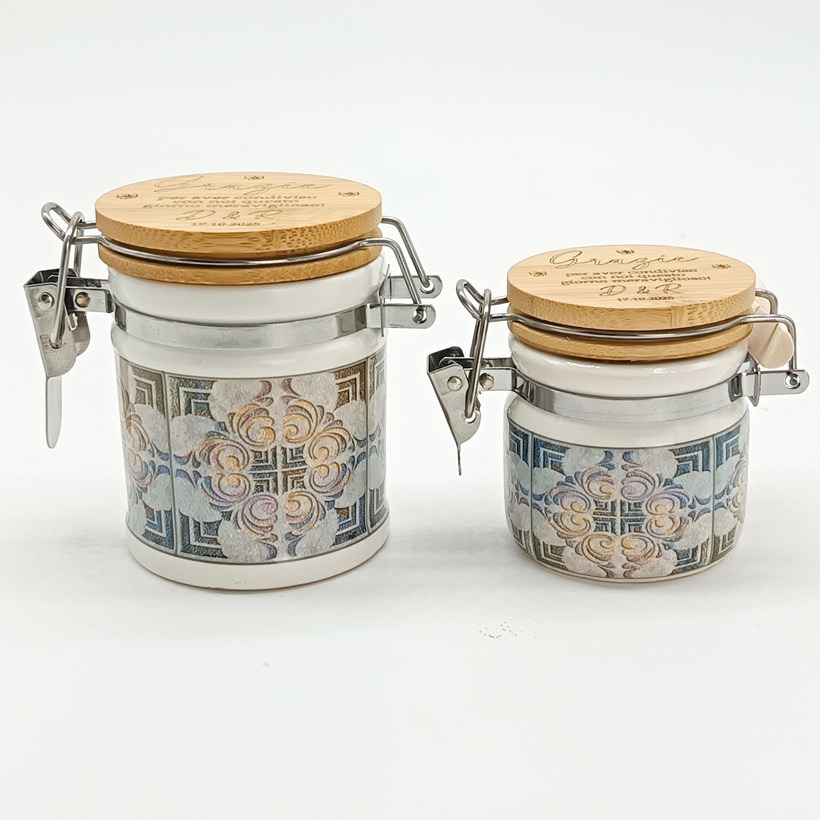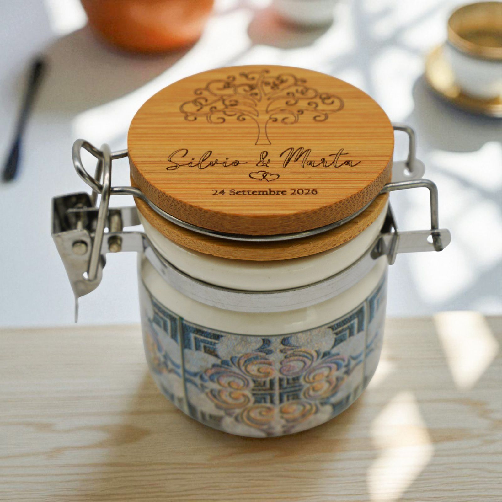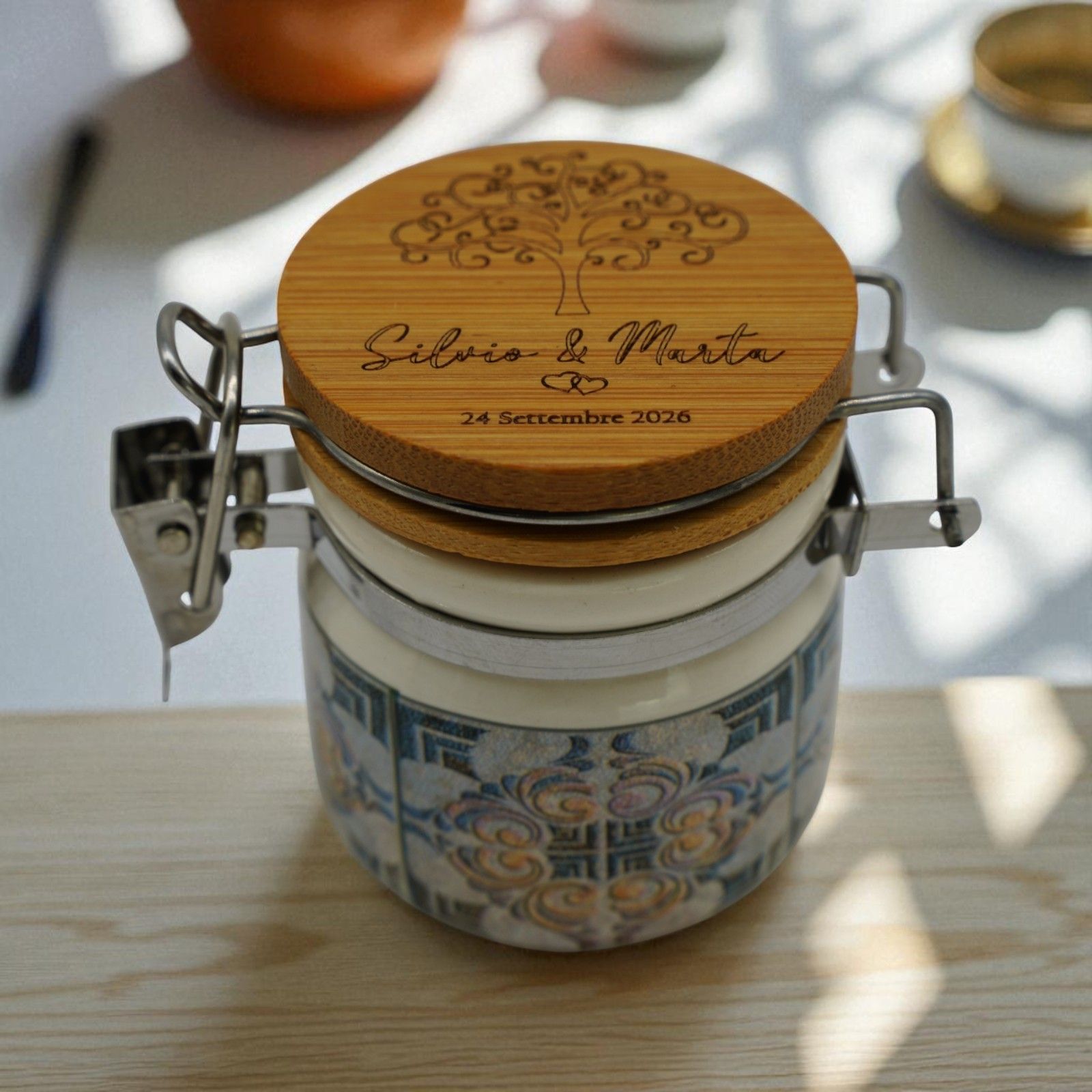 Il colore fantasia maiolica del barattolino e il tappo in legno conferiscono un look elegante e rustico allo stesso tempo, perfetto per qualsiasi tipo di evento. Regalare questa bomboniera significa donare un pezzo unico e personalizzato ai vostri ospiti, simbolo di amore e gratitudine. Un gesto che rimarrà nel cuore di chiunque riceverà questo regalo speciale, ricordando per sempre il vostro giorno indimenticabile.