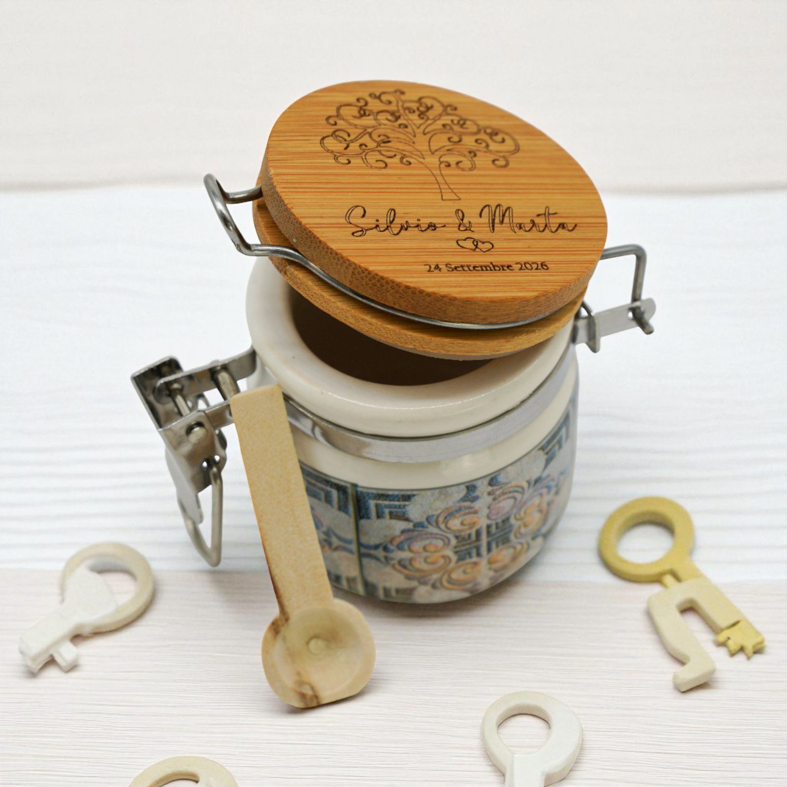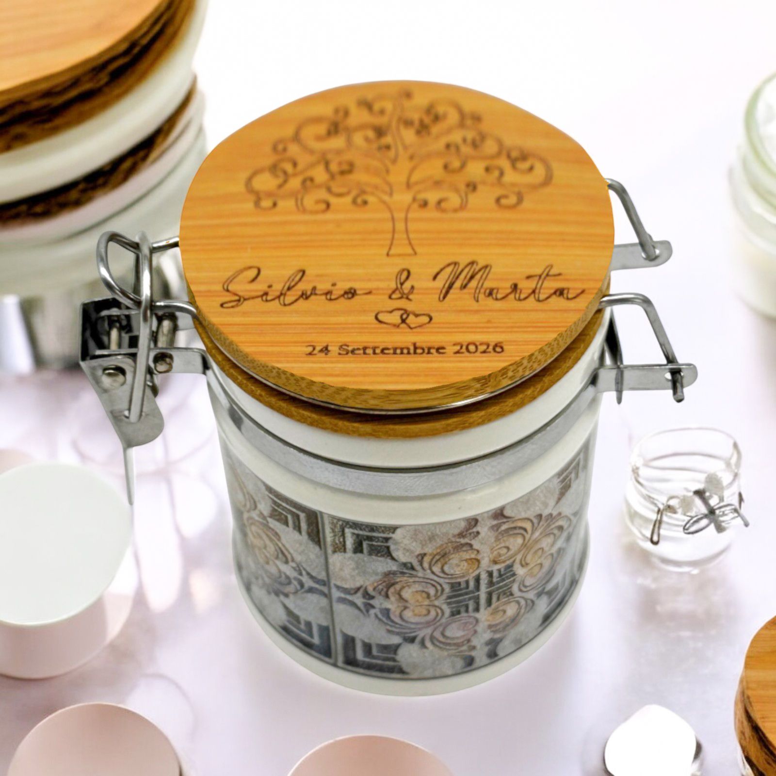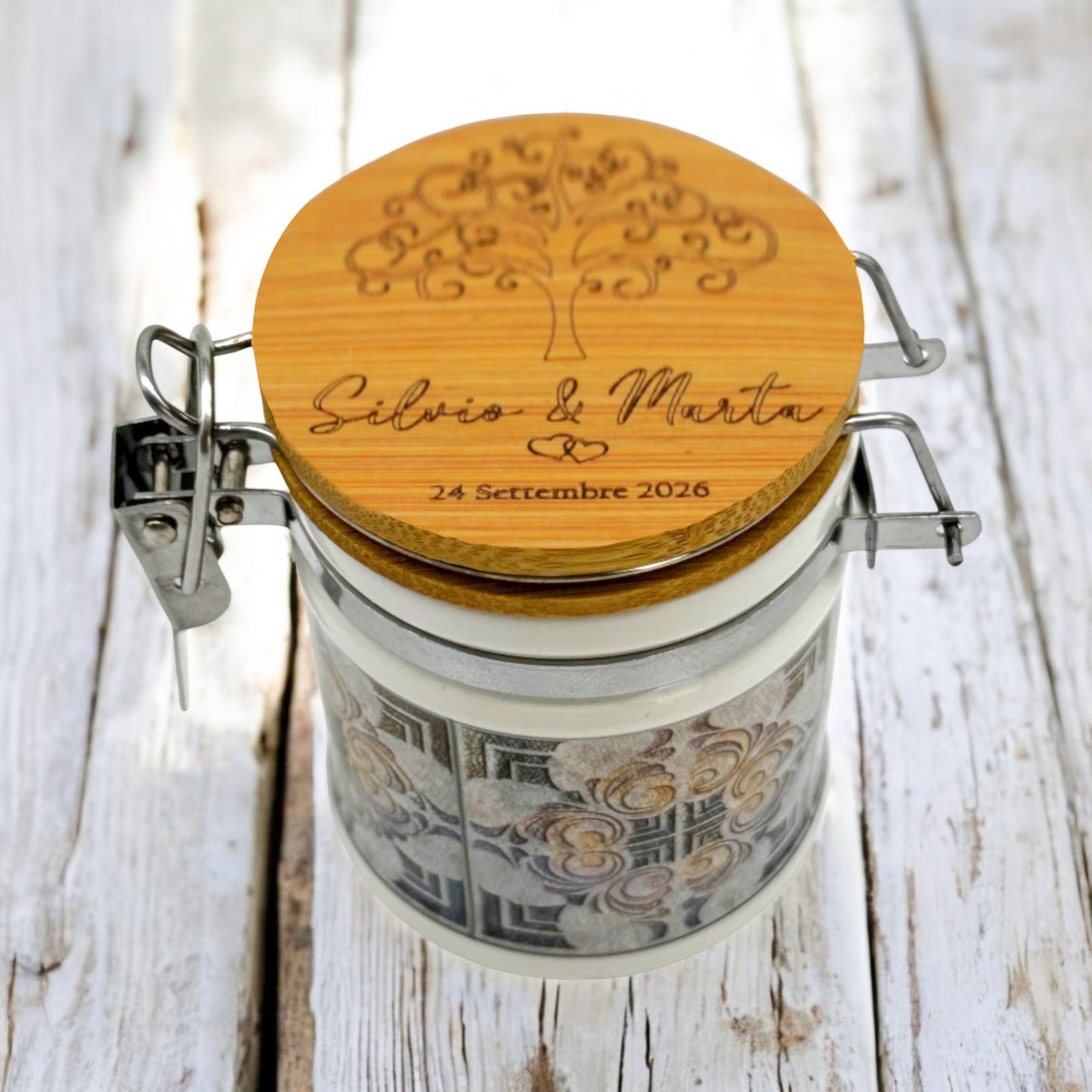 Il barattolino portaconfetti con chiusura ermetica è un'idea originale e unica per bomboniere personalizzate per matrimonio e anniversario. Realizzato con materiali di alta qualità come ceramica e legno, questo barattolino ha un design elegante e raffinato. La particolarità di questo prodotto è il tappo in legno personalizzato con l'albero della vita, il nome degli sposi e la data dell'evento. I cuoricini decorativi aggiungono un tocco romantico e speciale a questa bomboniera, rendendola un regalo indimenticabile per gli ospiti.