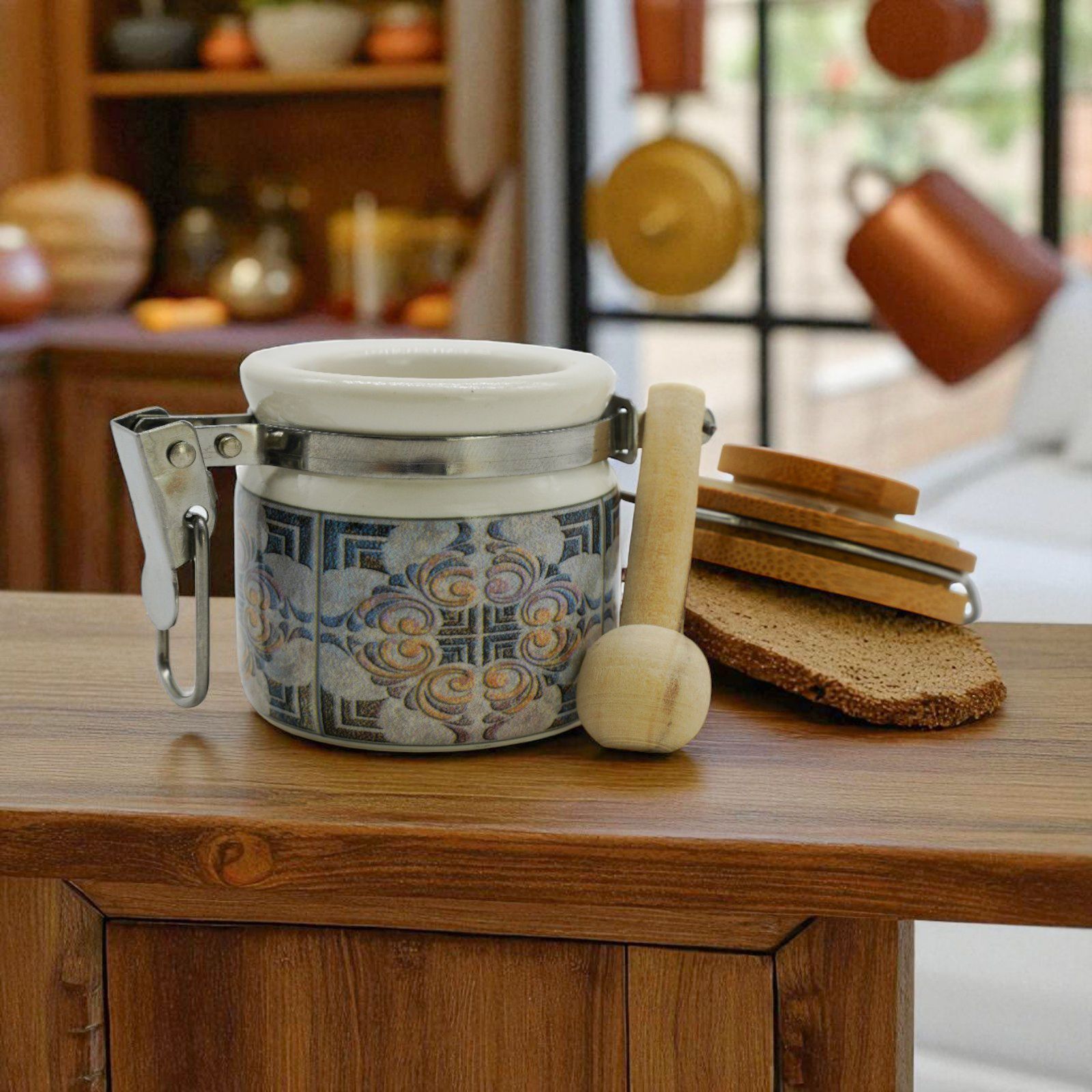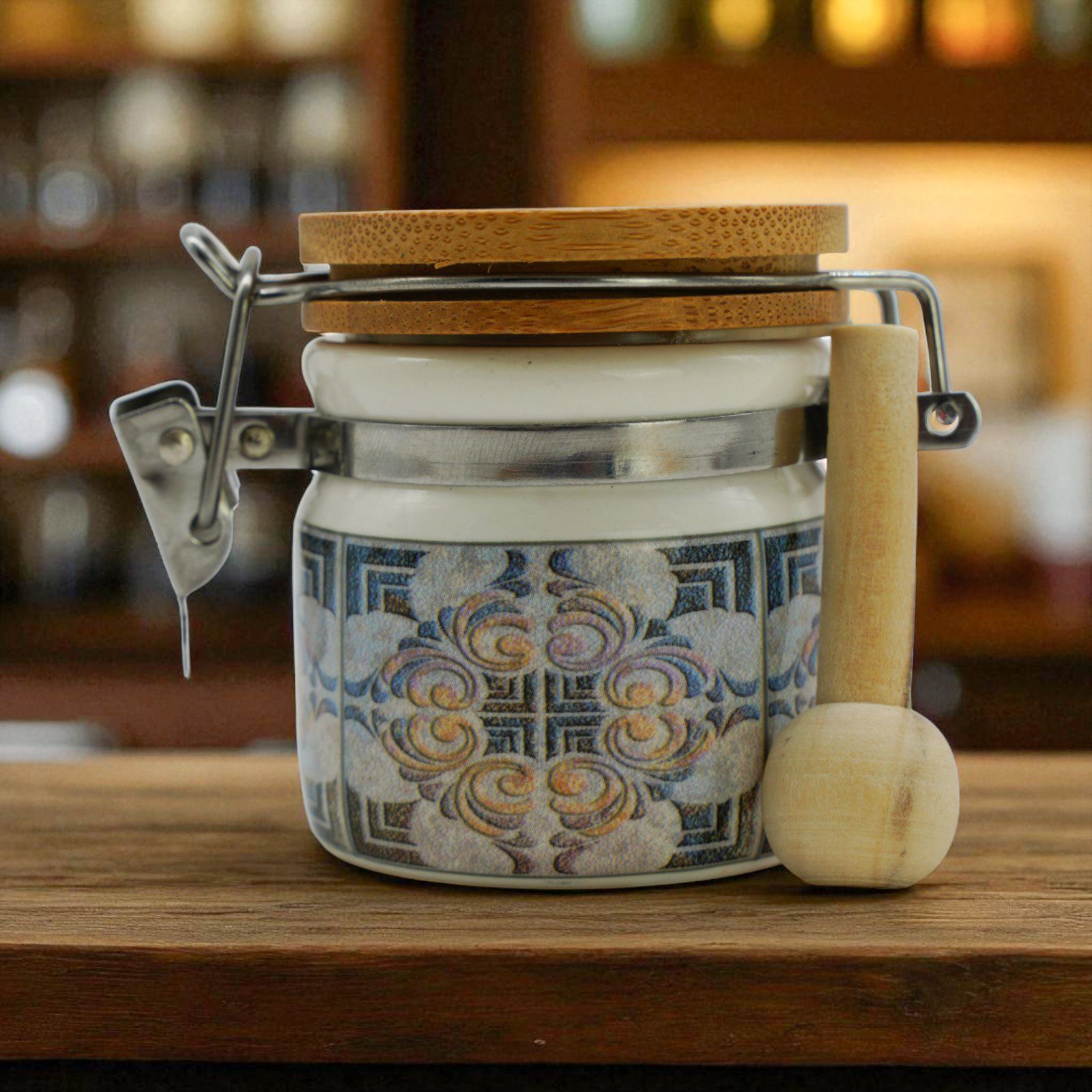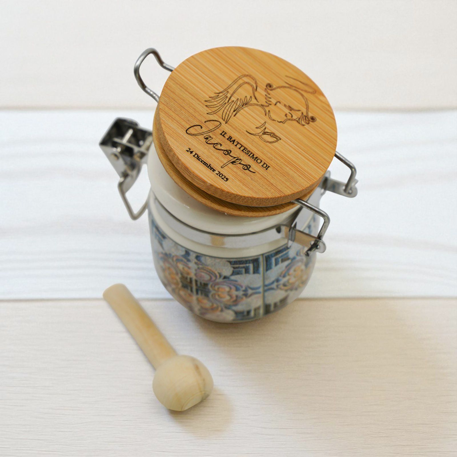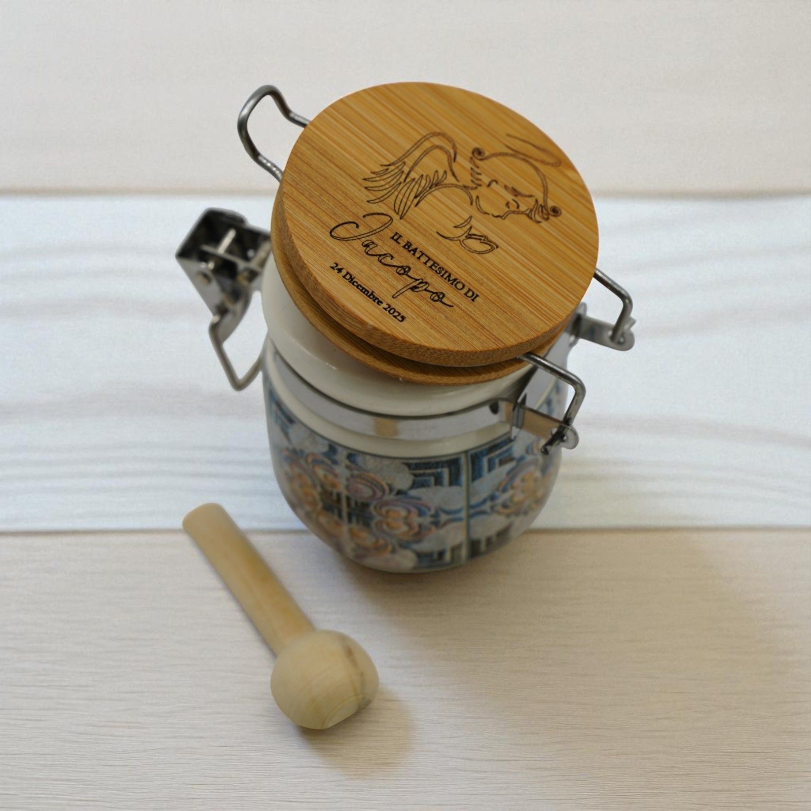 Il barattolo è disponibile in due dimensioni: Standard: h. 6 cm e Grande: h. 8 cm, così da soddisfare ogni esigenza. Puoi scegliere la dimensione desiderata direttamente dal menu a tendina. È decorato con un motivo a fantasia maiolica e un tappo color legno, che lo rende elegante e raffinato. Realizzato in ceramica e legno di alta qualità, questo barattolino può essere utilizzato anche come portaspezie, garantendo un utilizzo pratico e duraturo nel tempo.