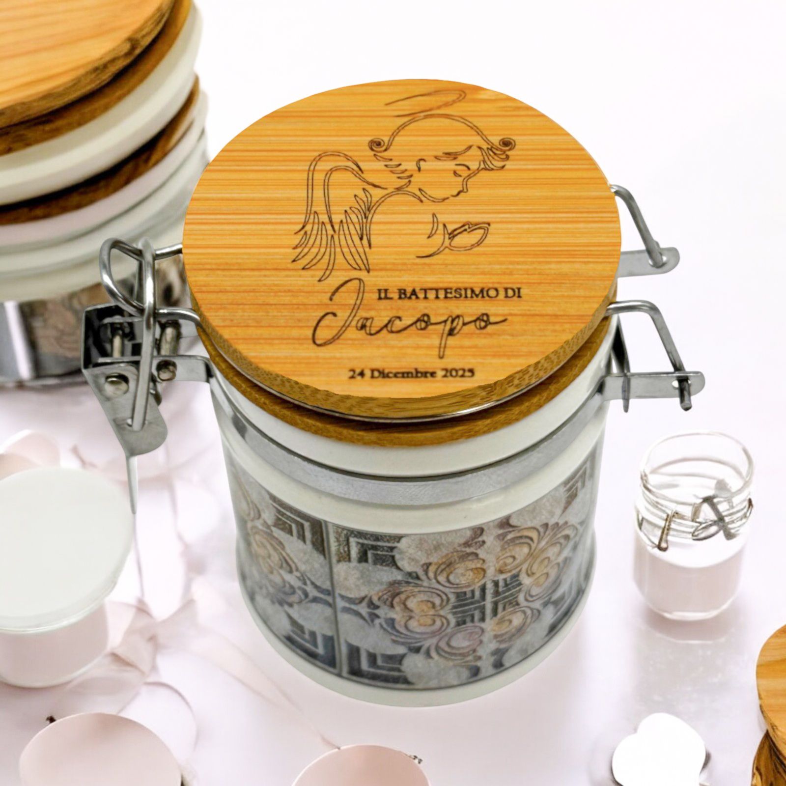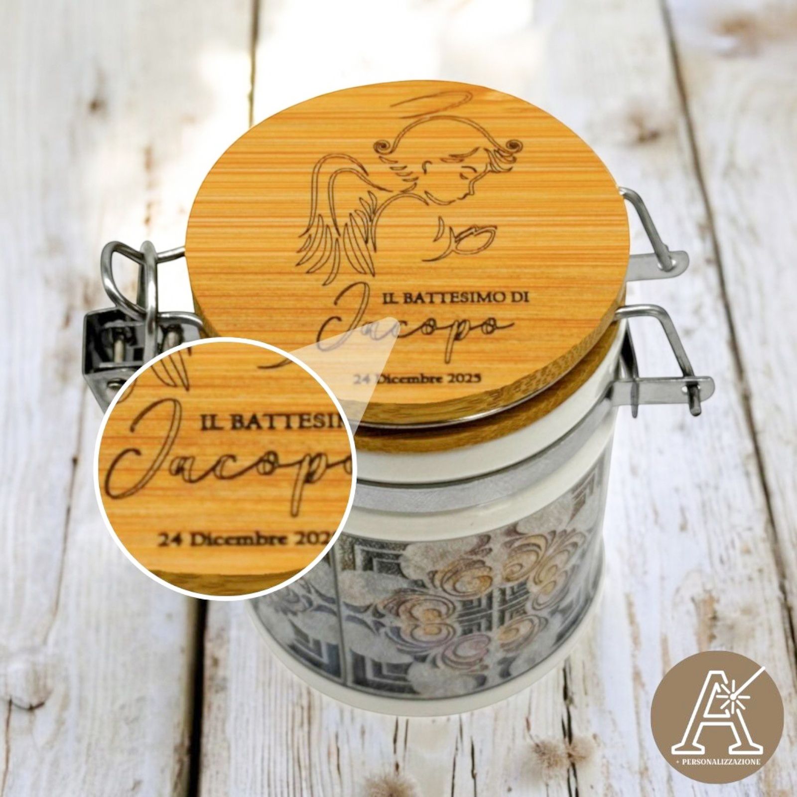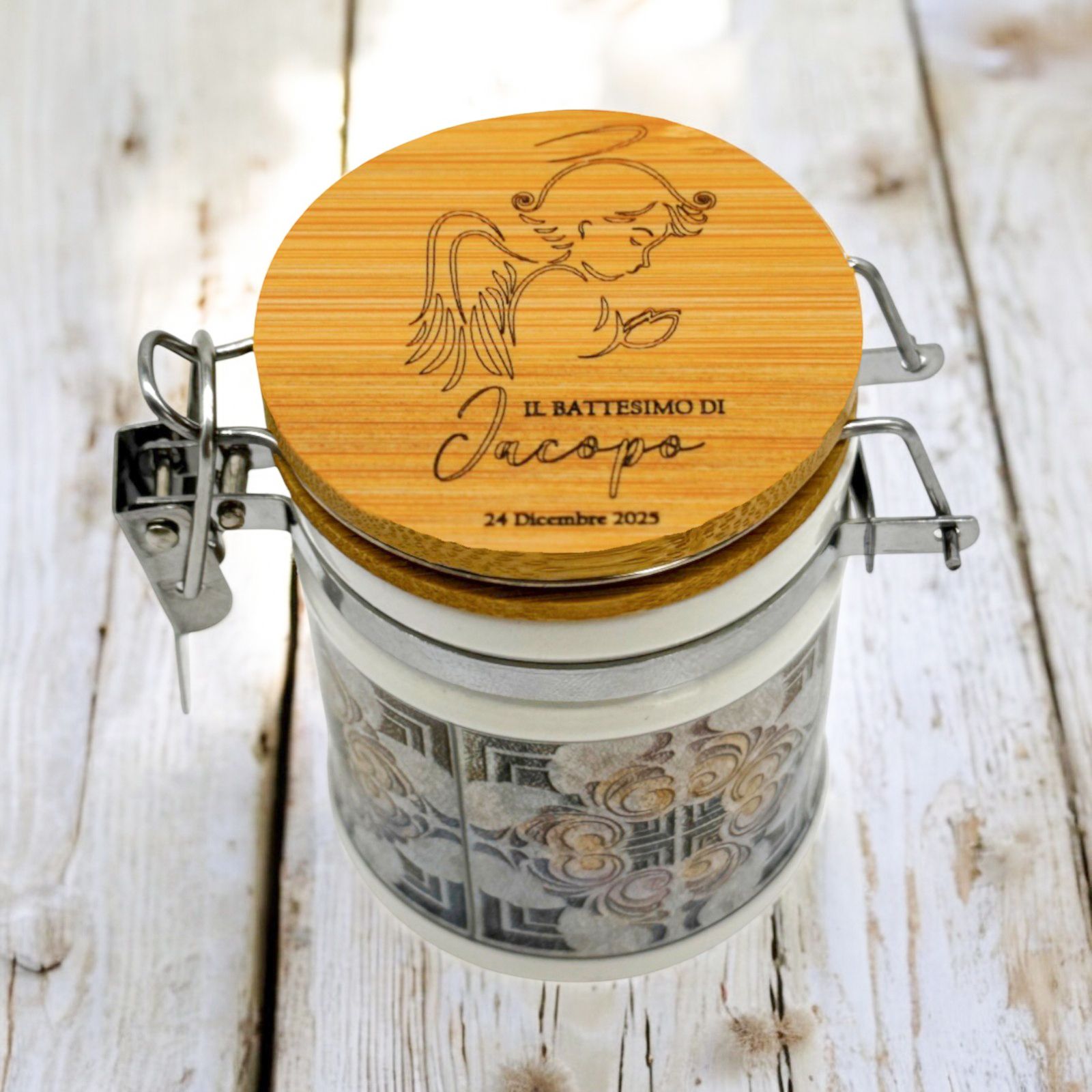 Nel giorno speciale del battesimo o della comunione, regala un'emozione unica con questo barattolo personalizzabile. Inciso con un tenero angioletto in preghiera, con grandi ali e aureola, questo regalo speciale può essere arricchito con il nome e la data del festeggiato. Un'idea originale e unica per una bomboniera indimenticabile.