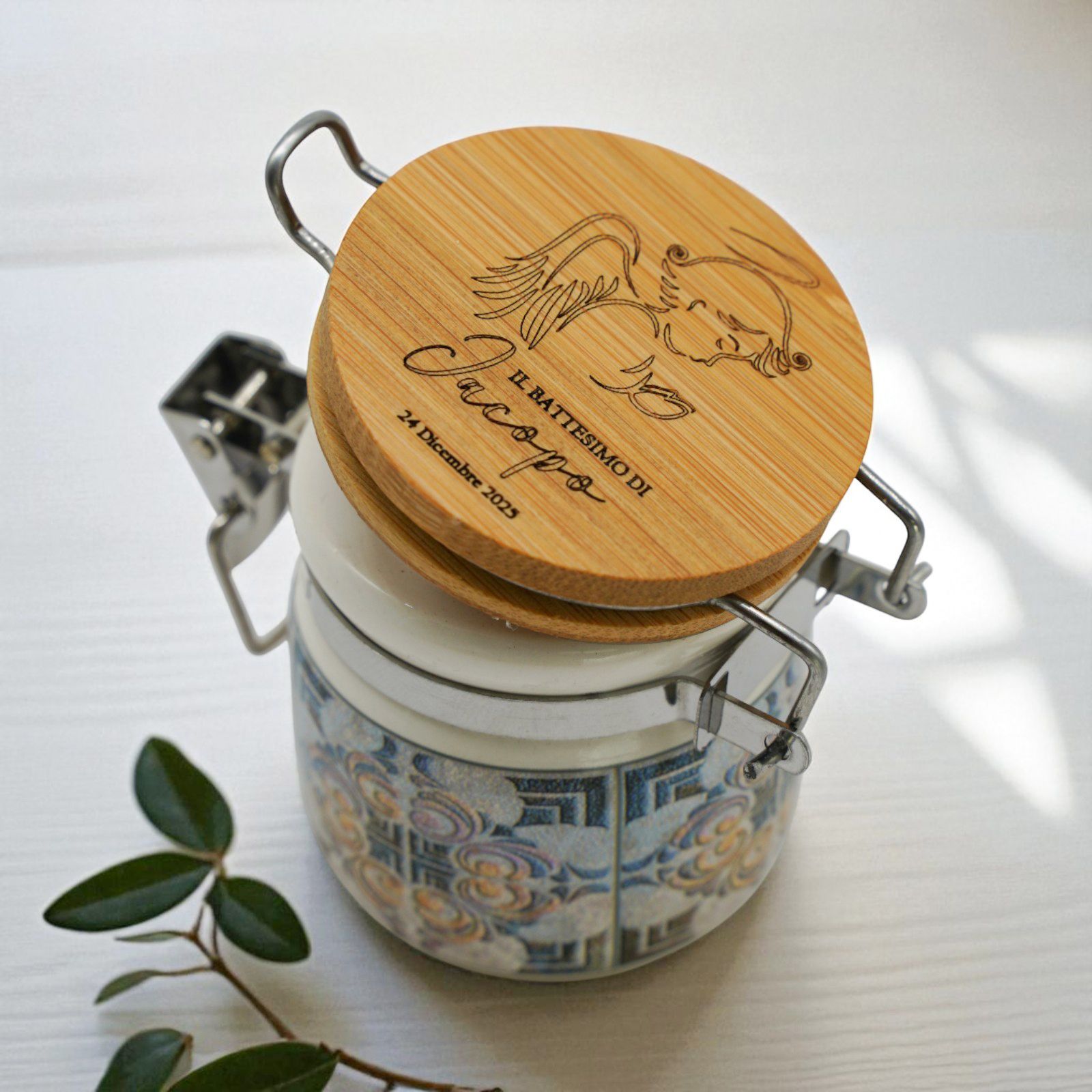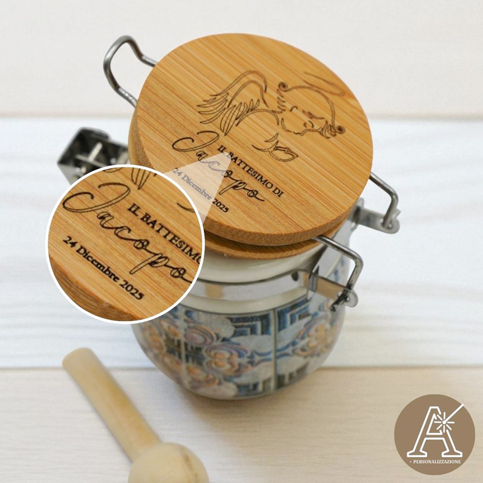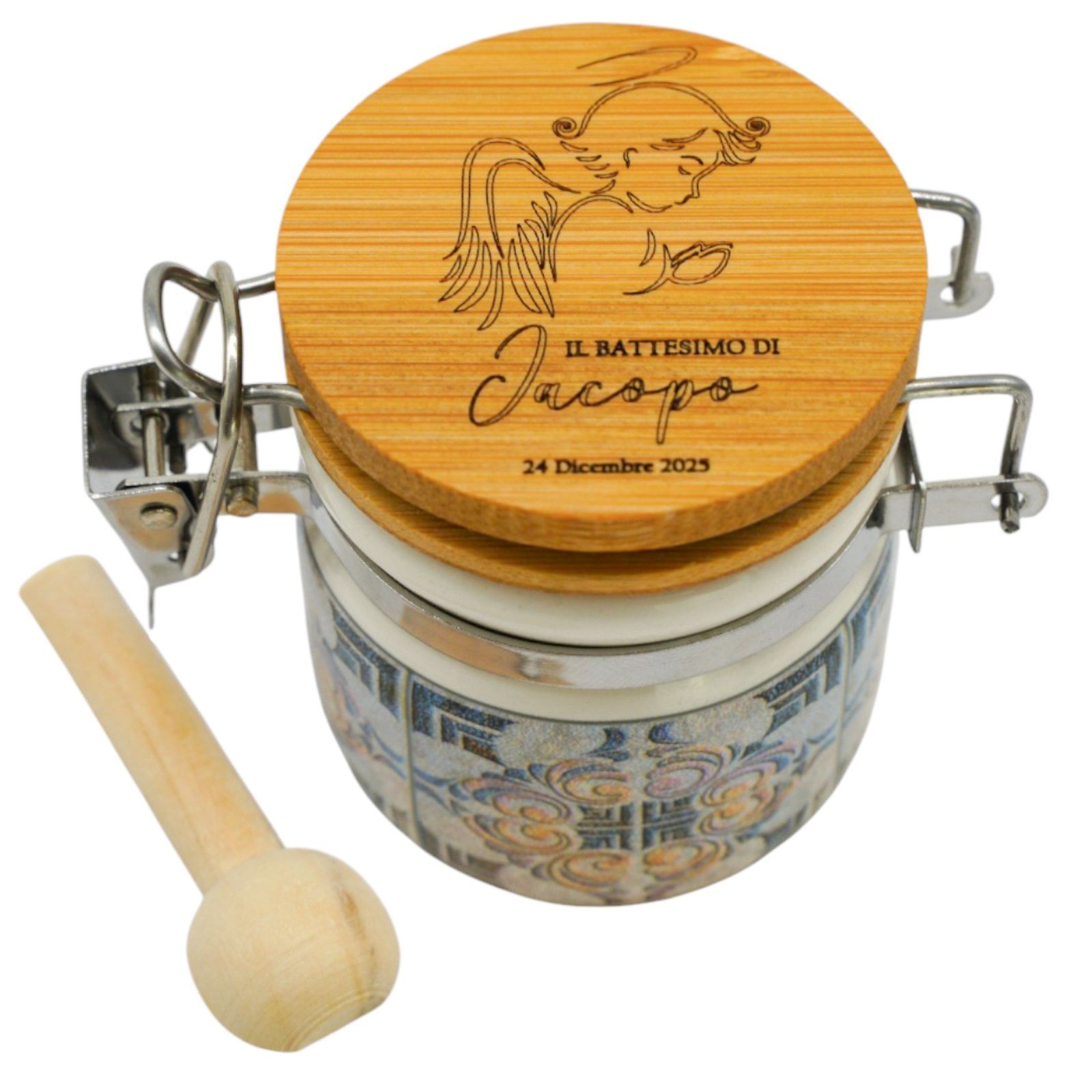 Nel giorno speciale del battesimo o della comunione, regala un'emozione unica con questo barattolo personalizzabile. Inciso con un tenero angioletto in preghiera, con grandi ali e aureola, questo regalo speciale può essere arricchito con il nome e la data del festeggiato. Un'idea originale e unica per una bomboniera indimenticabile.