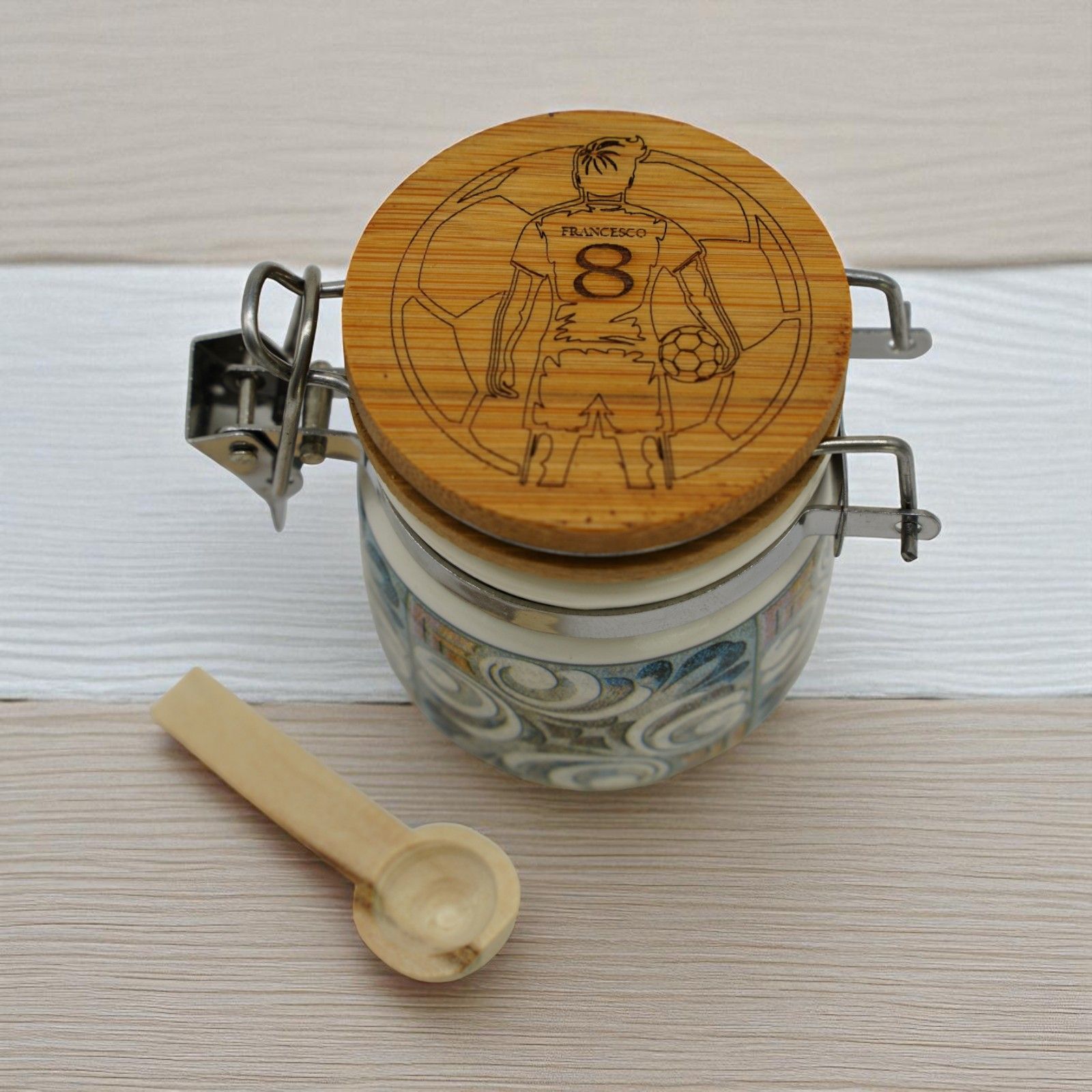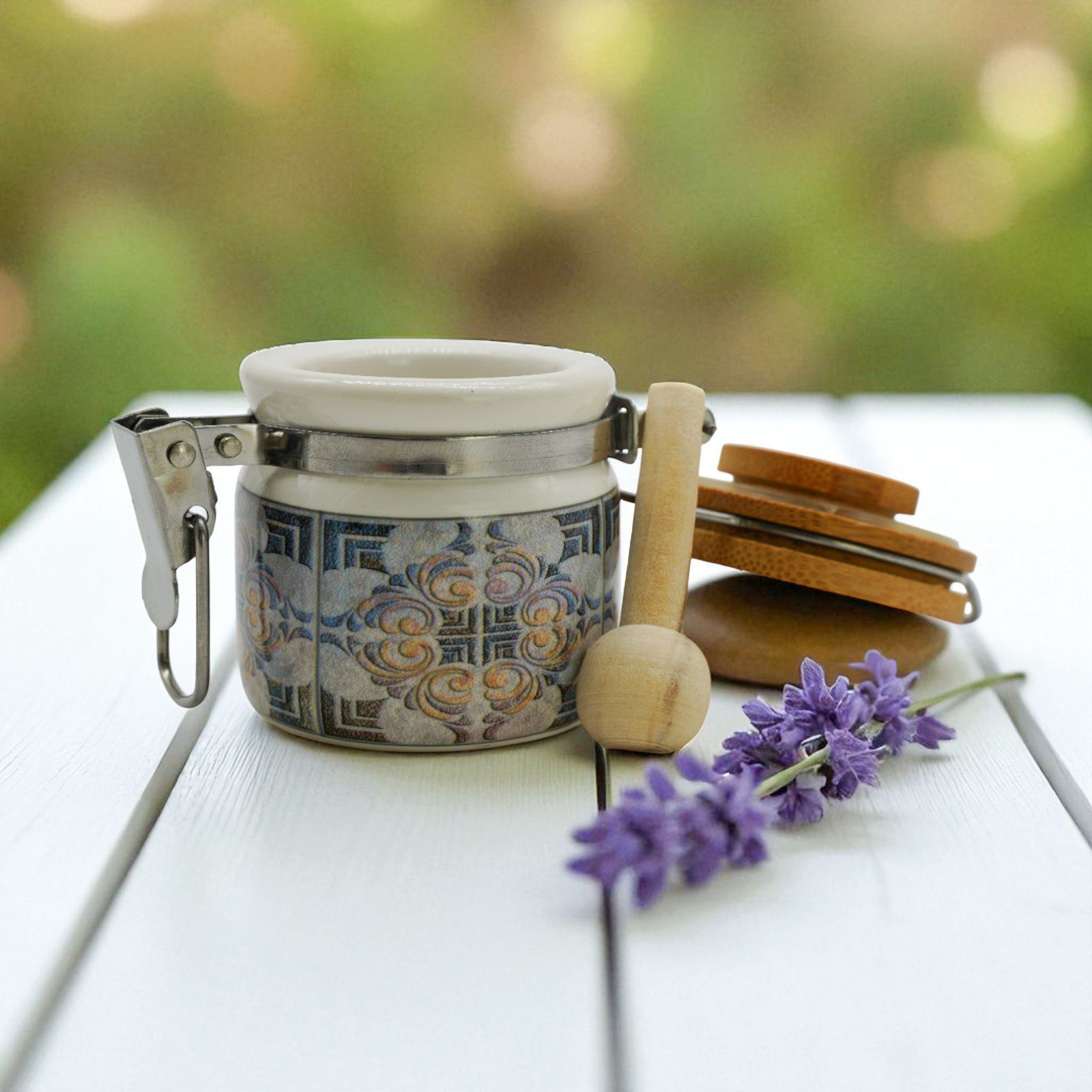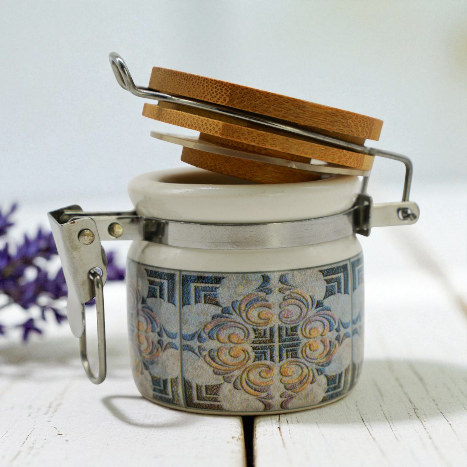 La fantasia in stile maiolica e la finitura effetto legno regalano un aspetto elegante e raffinato. Oltre ad accogliere i confetti, il barattolino può essere riutilizzato come portaspezie o come piccolo contenitore decorativo, rendendolo un dono pratico e duraturo nel tempo.