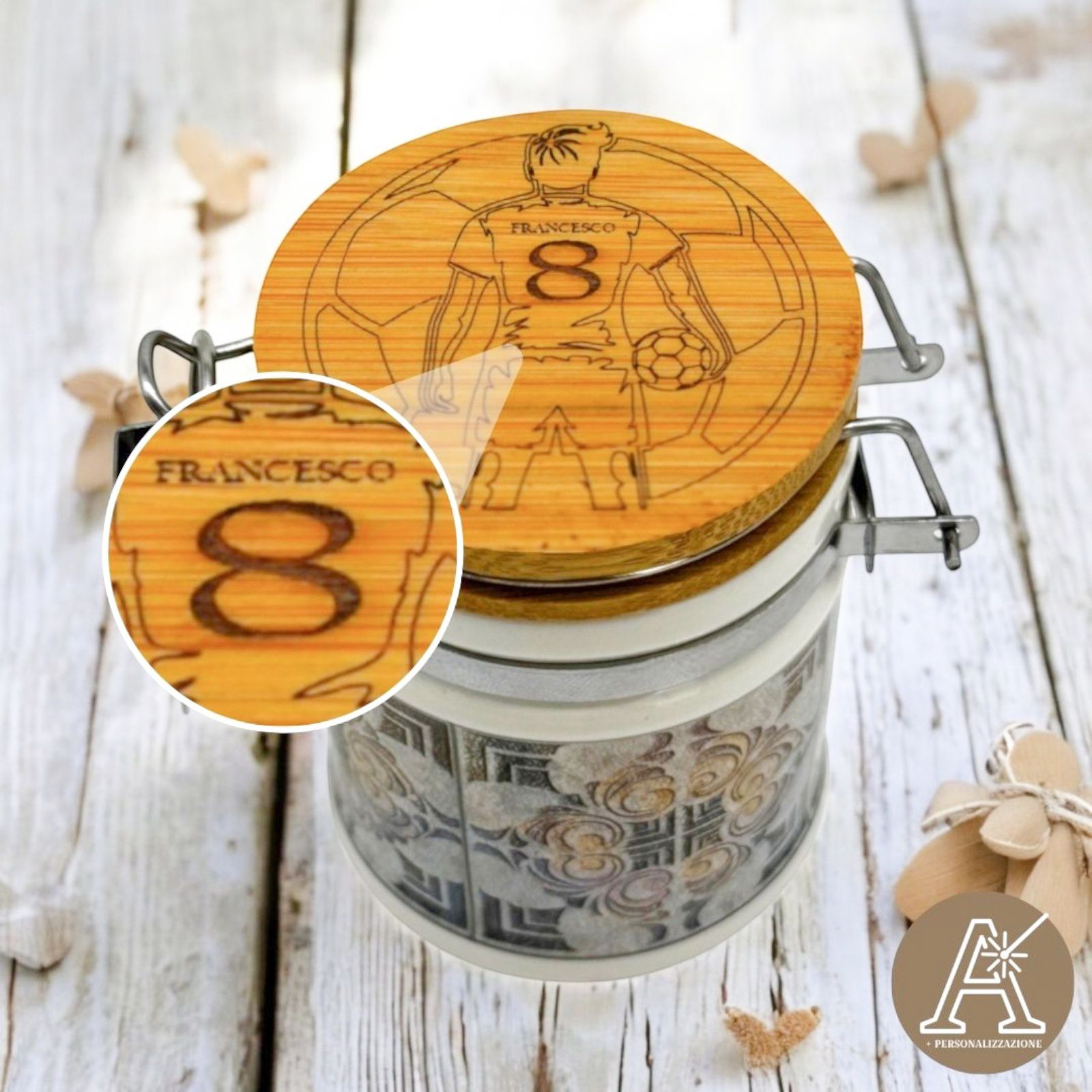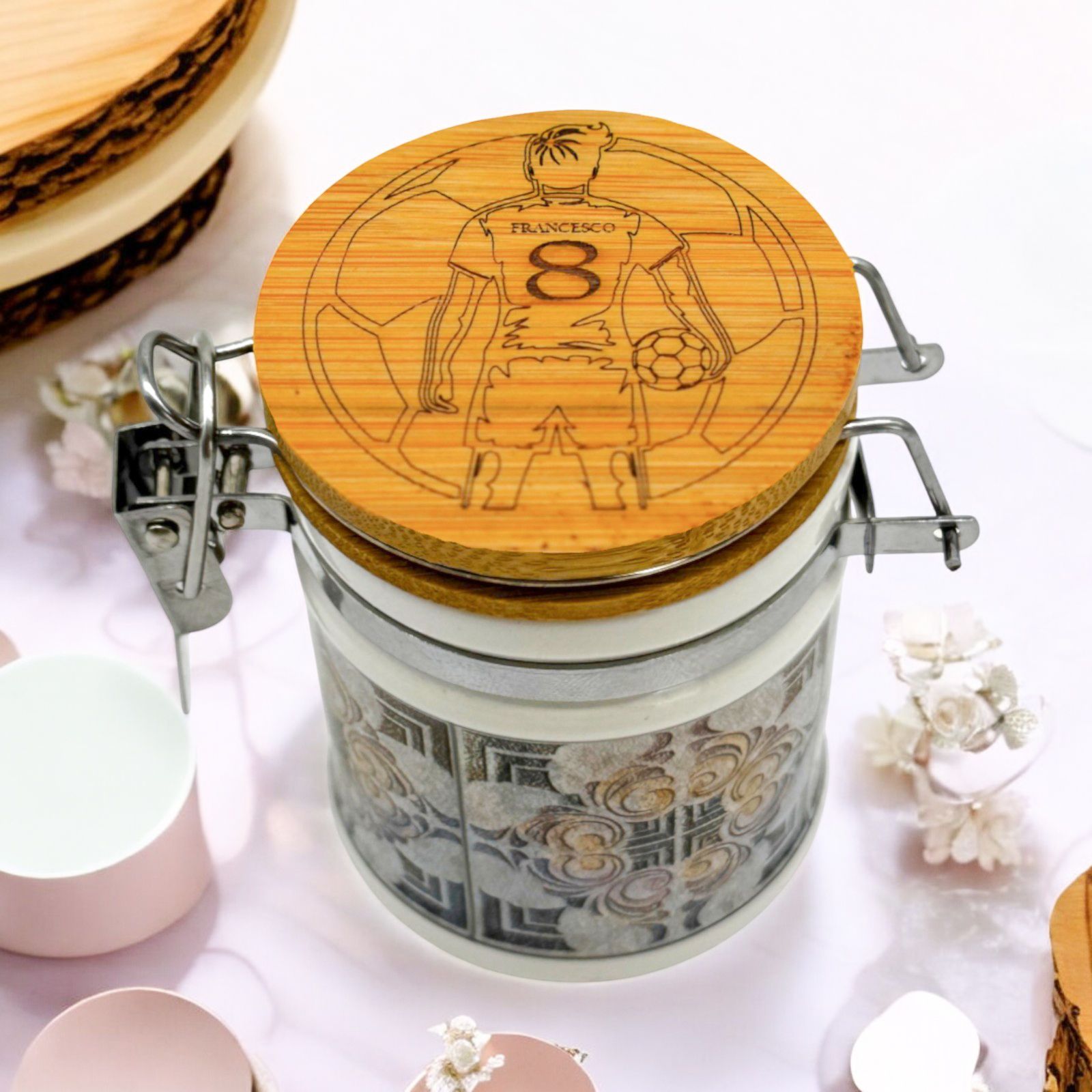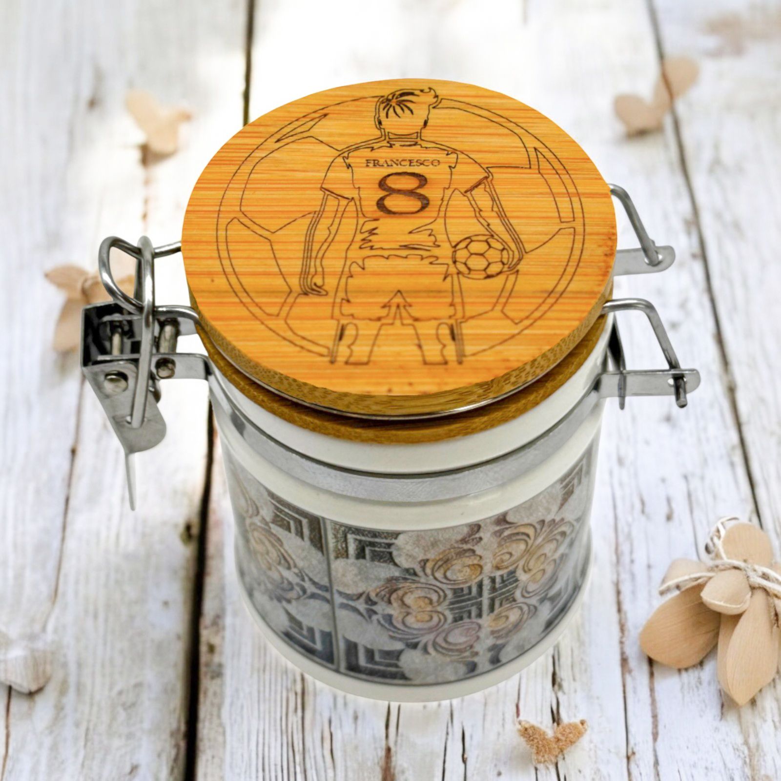 Il barattolino portaconfetti a tema calcio, con decorazione di un calciatore con pallone, è il regalo perfetto per ogni appassionato di sport. Completamente personalizzabile con il nome e il numero di maglia del festeggiato, si trasforma in una bomboniera unica e originale, ideale per compleanni, prime comunioni e diciottesimi.