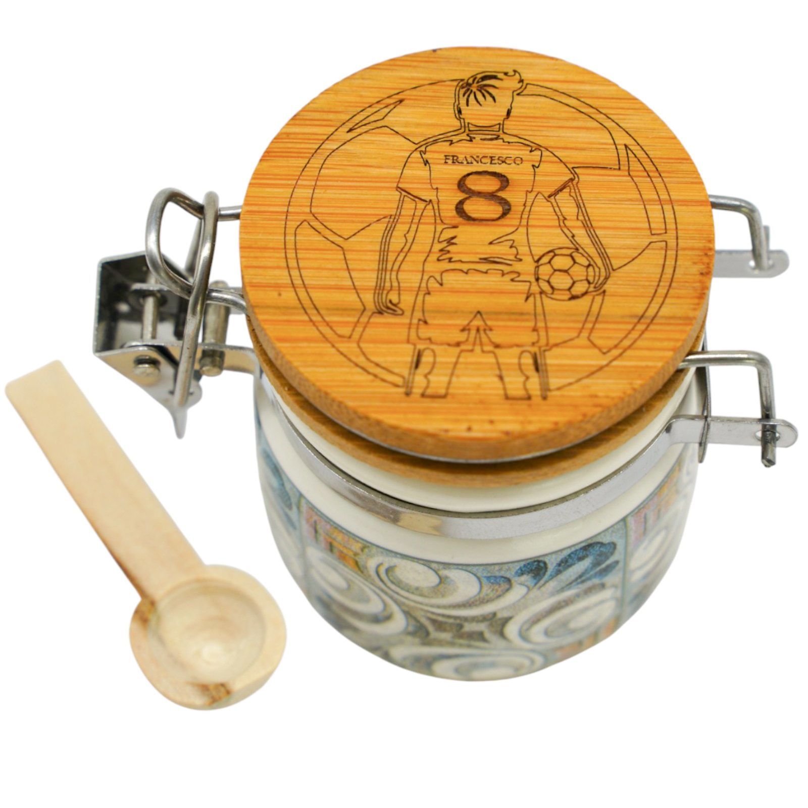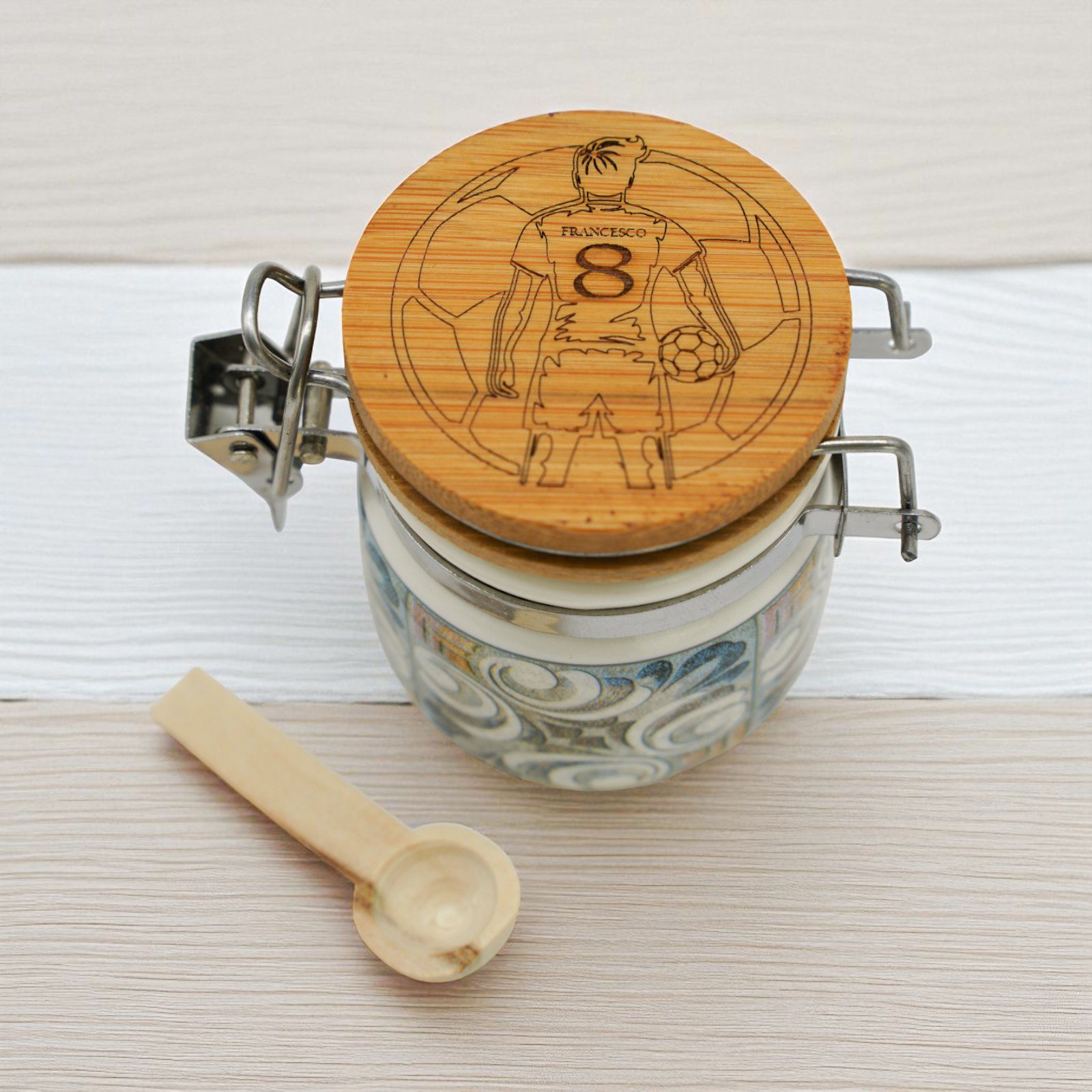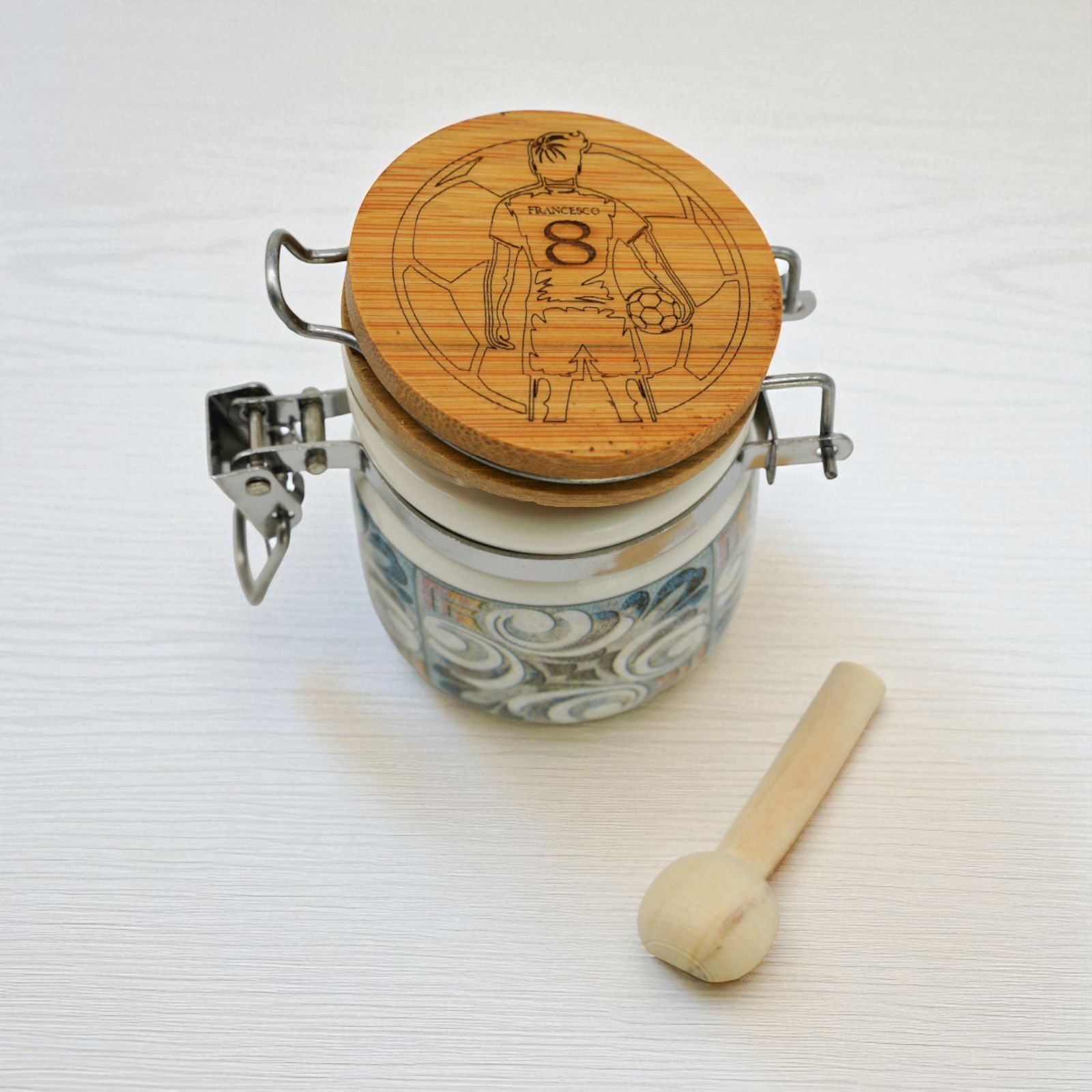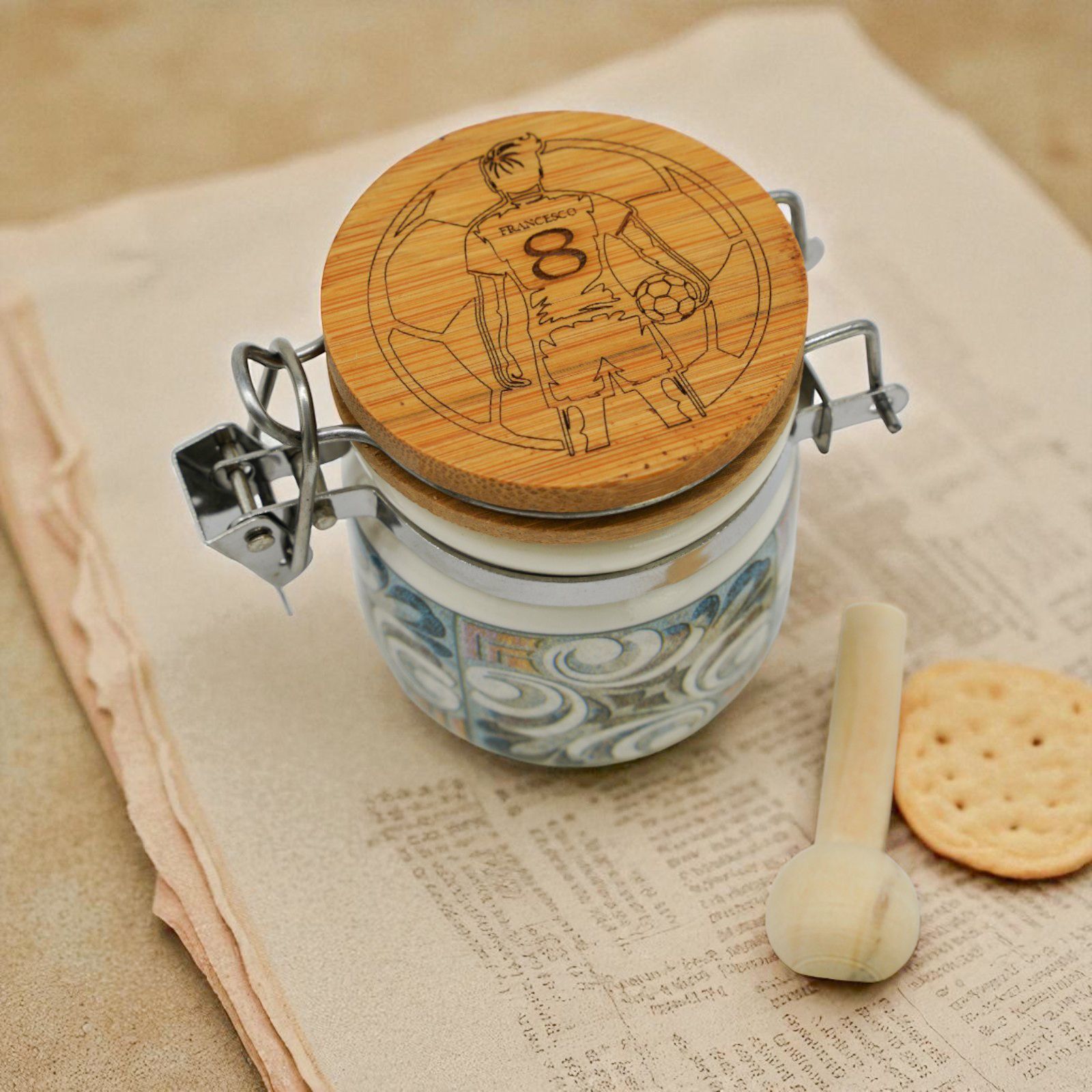 Il barattolino portaconfetti a tema calcio, con decorazione di un calciatore con pallone, è il regalo perfetto per ogni appassionato di sport. Completamente personalizzabile con il nome e il numero di maglia del festeggiato, si trasforma in una bomboniera unica e originale, ideale per compleanni, prime comunioni e diciottesimi.