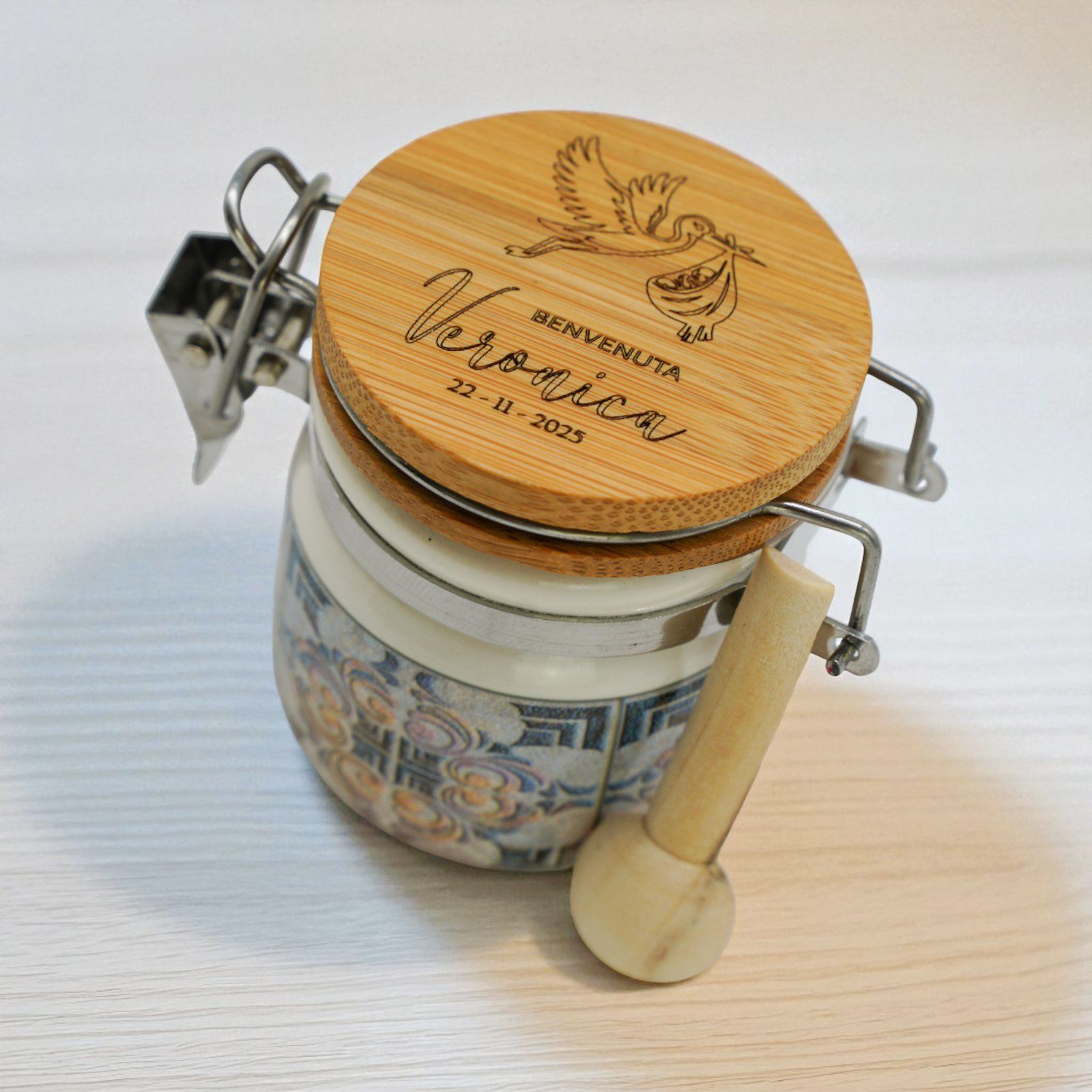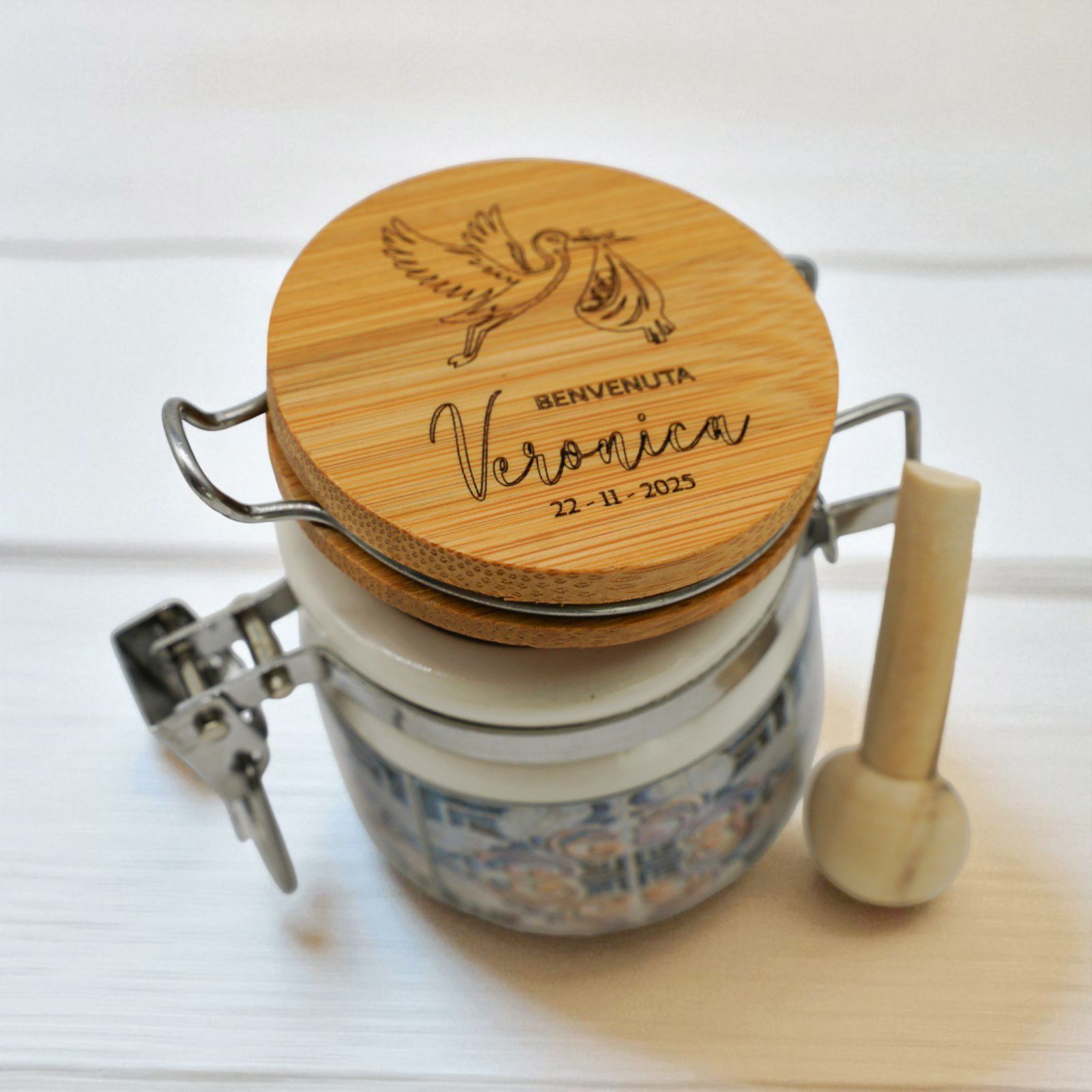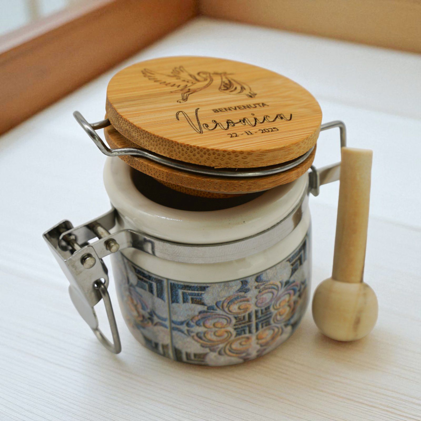 Un barattolino in ceramica con coperchio in legno e chiusura ermetica, decorato con la tenera cicogna con fagottino, è il modo ideale per ringraziare chi ha condiviso con te la gioia della nascita. Perfetto come bomboniere nascita femminuccia o bomboniere nascita maschietto, unisce dolcezza e praticità in un ricordo unico.