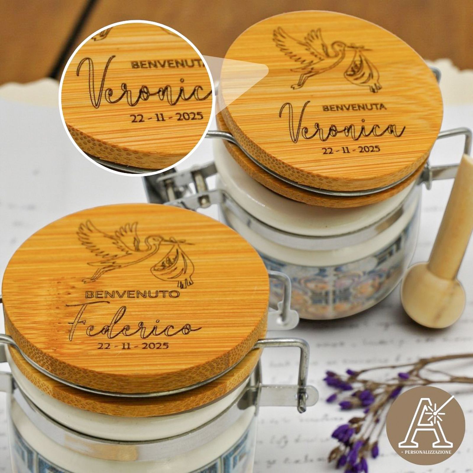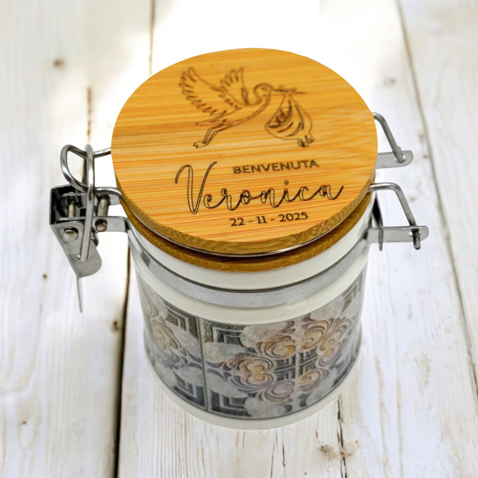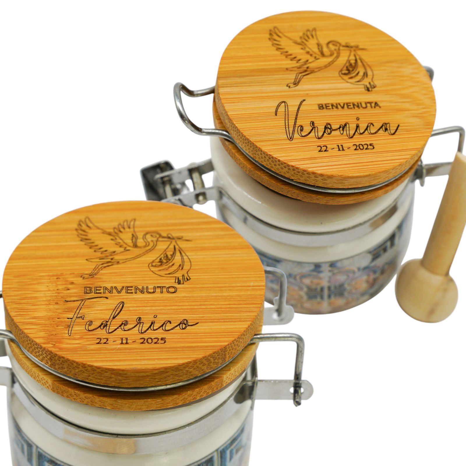 Un barattolino in ceramica con coperchio in legno e chiusura ermetica, decorato con la tenera cicogna con fagottino, è il modo ideale per ringraziare chi ha condiviso con te la gioia della nascita. Perfetto come bomboniere nascita femminuccia o bomboniere nascita maschietto, unisce dolcezza e praticità in un ricordo unico.