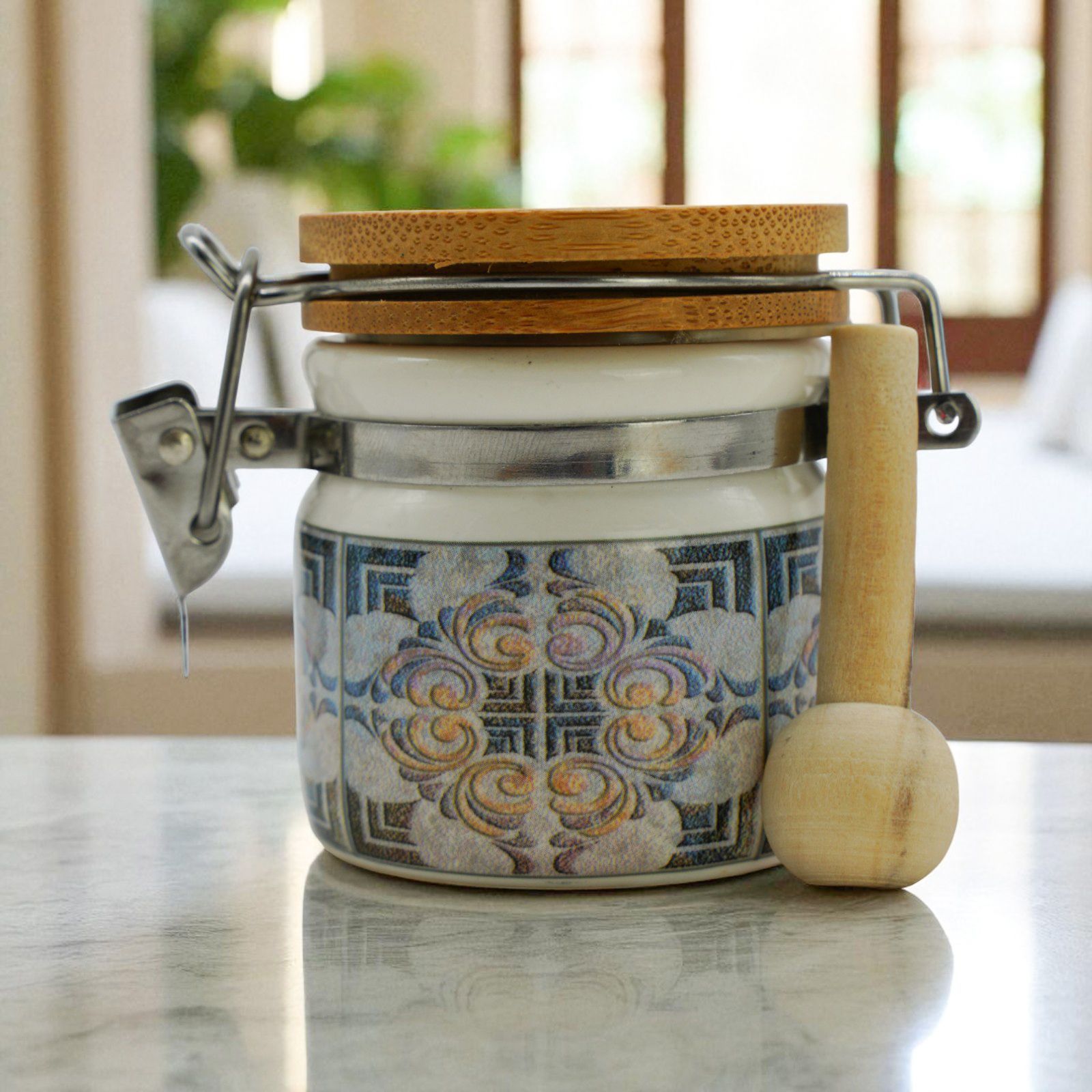 Questo barattolo è compatto ma funzionale. La fantasia maiolica e il tappo in legno naturale lo rendono elegante, mentre la possibilità di incisione con nome, data o una frase speciale lo trasforma in un dono esclusivo. Il barattolino è disponibile in due dimensioni: - Standard: h. 6 cm circa; Grande: h. 8 cm circa.