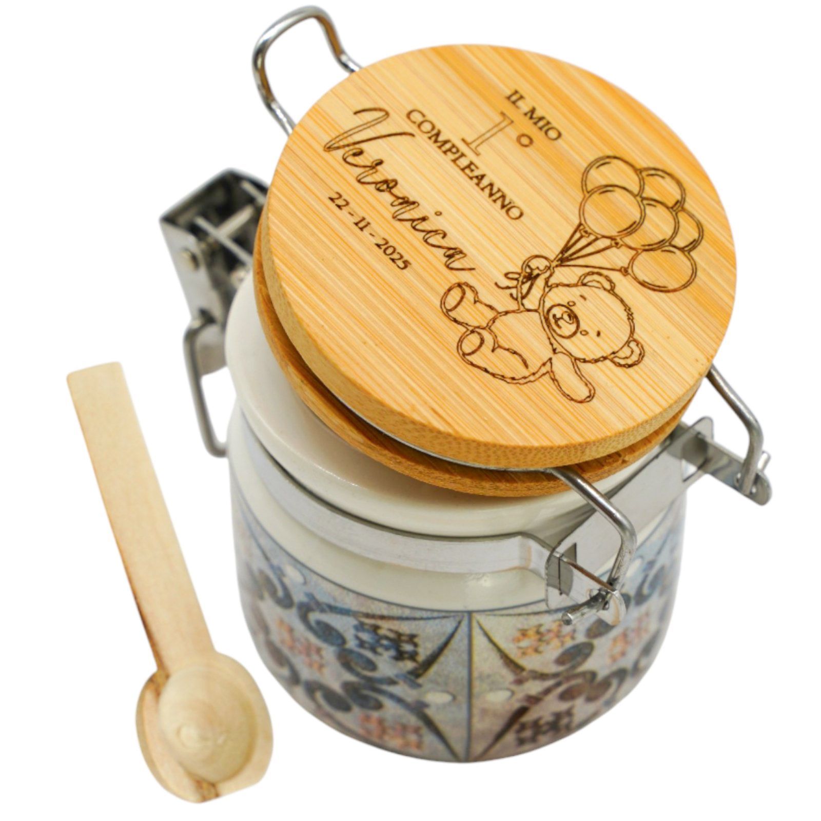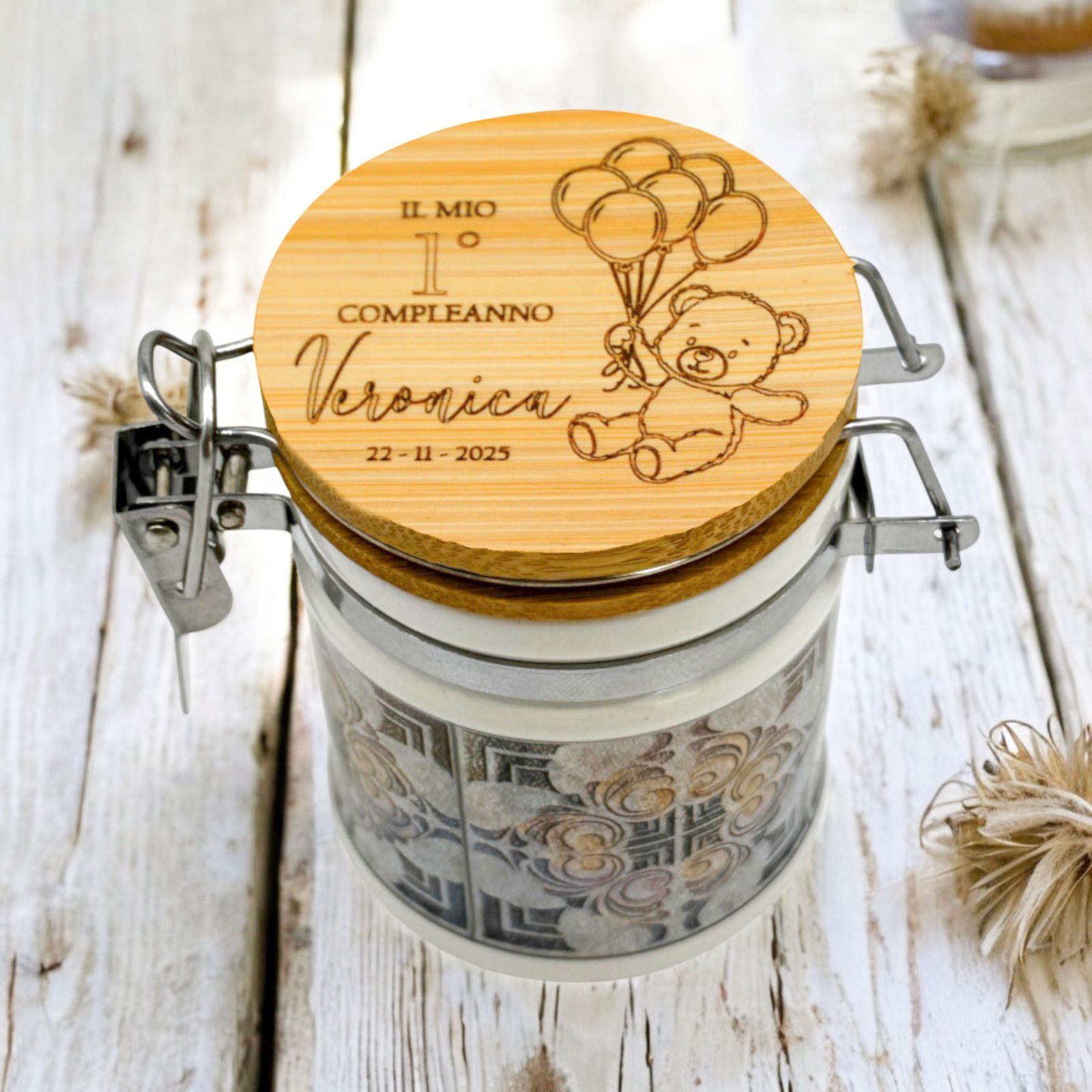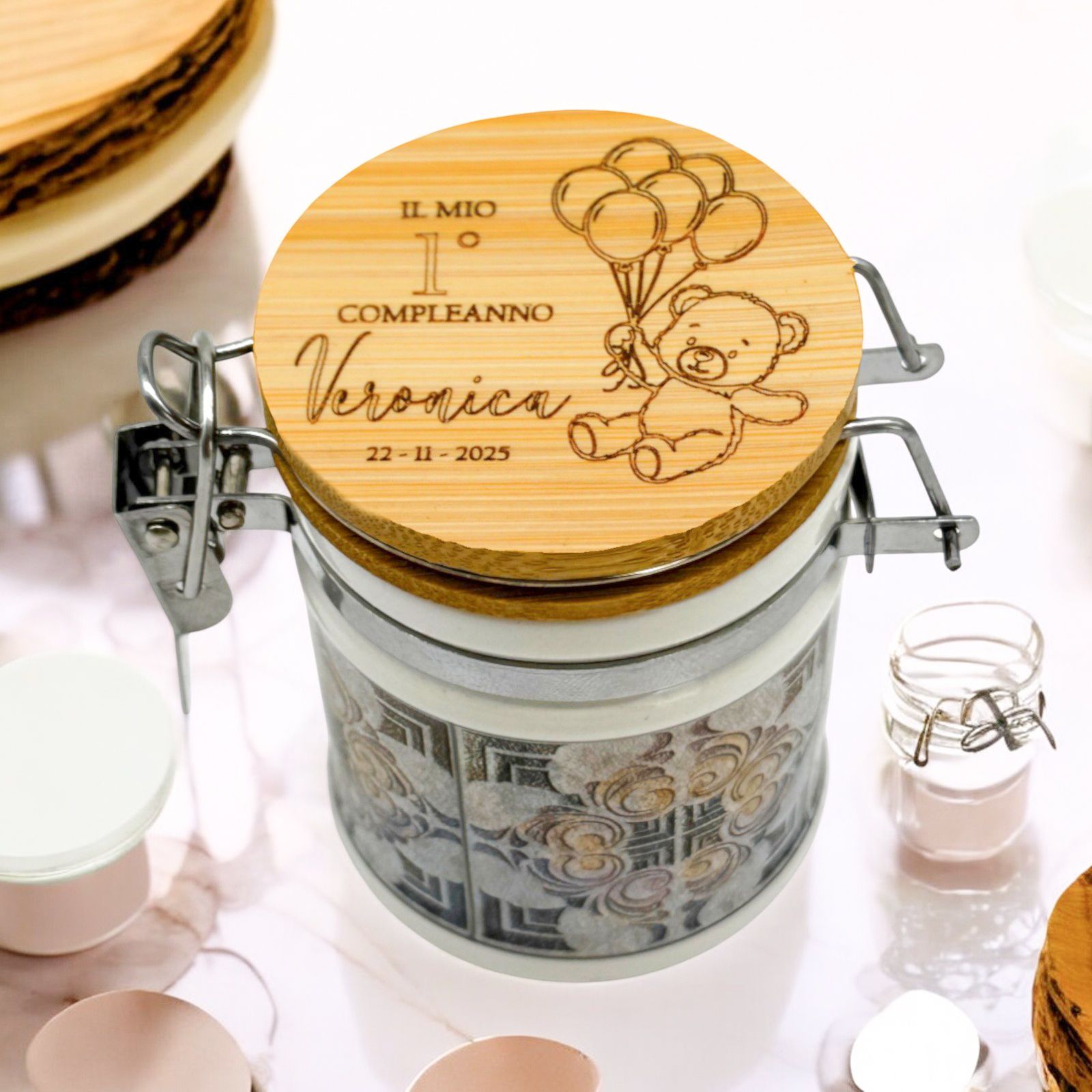 Rendi speciale ogni festa con questo barattolino in ceramica personalizzato! Sul tappo è presente un dolcissimo orsetto con palloncini e spazio per incidere nome, data o evento. Un’idea tenera e originale, perfetta come bomboniera nascita, battesimo o primo compleanno, adatta sia come bomboniera femminuccia che come bomboniera maschietto.