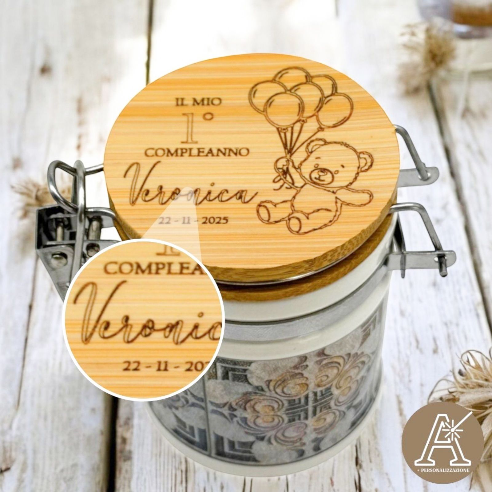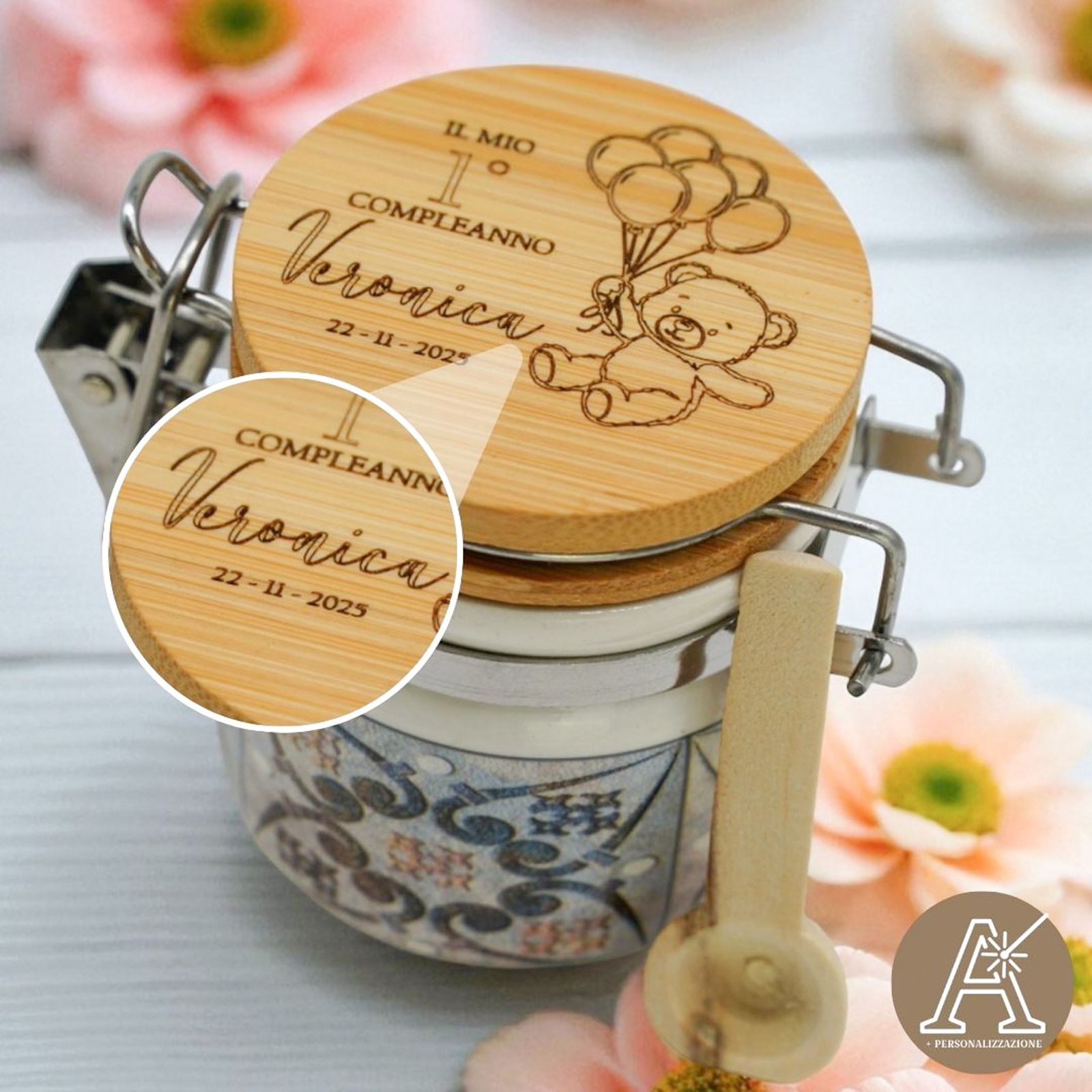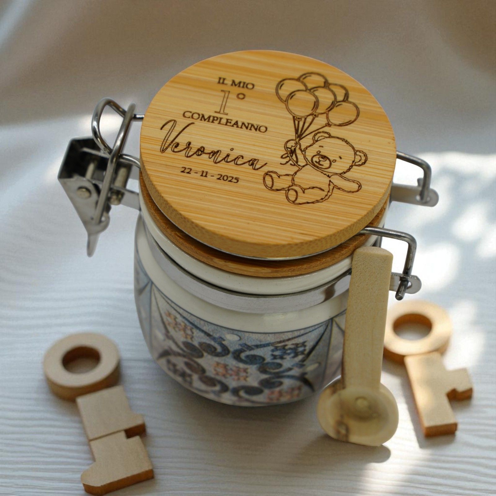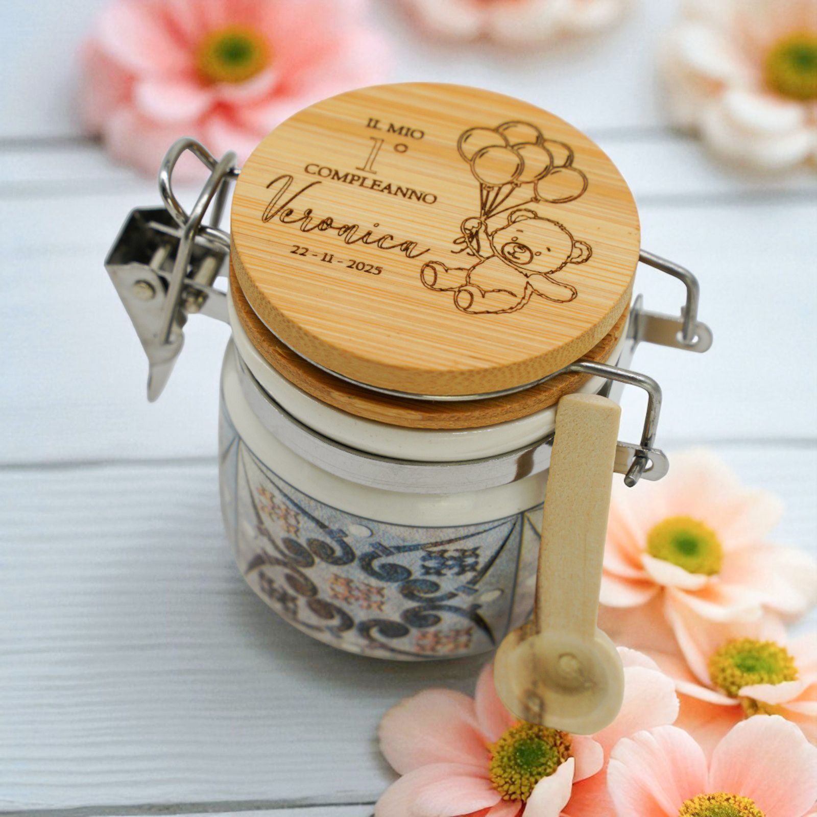Rendi speciale ogni festa con questo barattolino in ceramica personalizzato! Sul tappo è presente un dolcissimo orsetto con palloncini e spazio per incidere nome, data o evento. Un’idea tenera e originale, perfetta come bomboniera nascita, battesimo o primo compleanno, adatta sia come bomboniera femminuccia che come bomboniera maschietto.