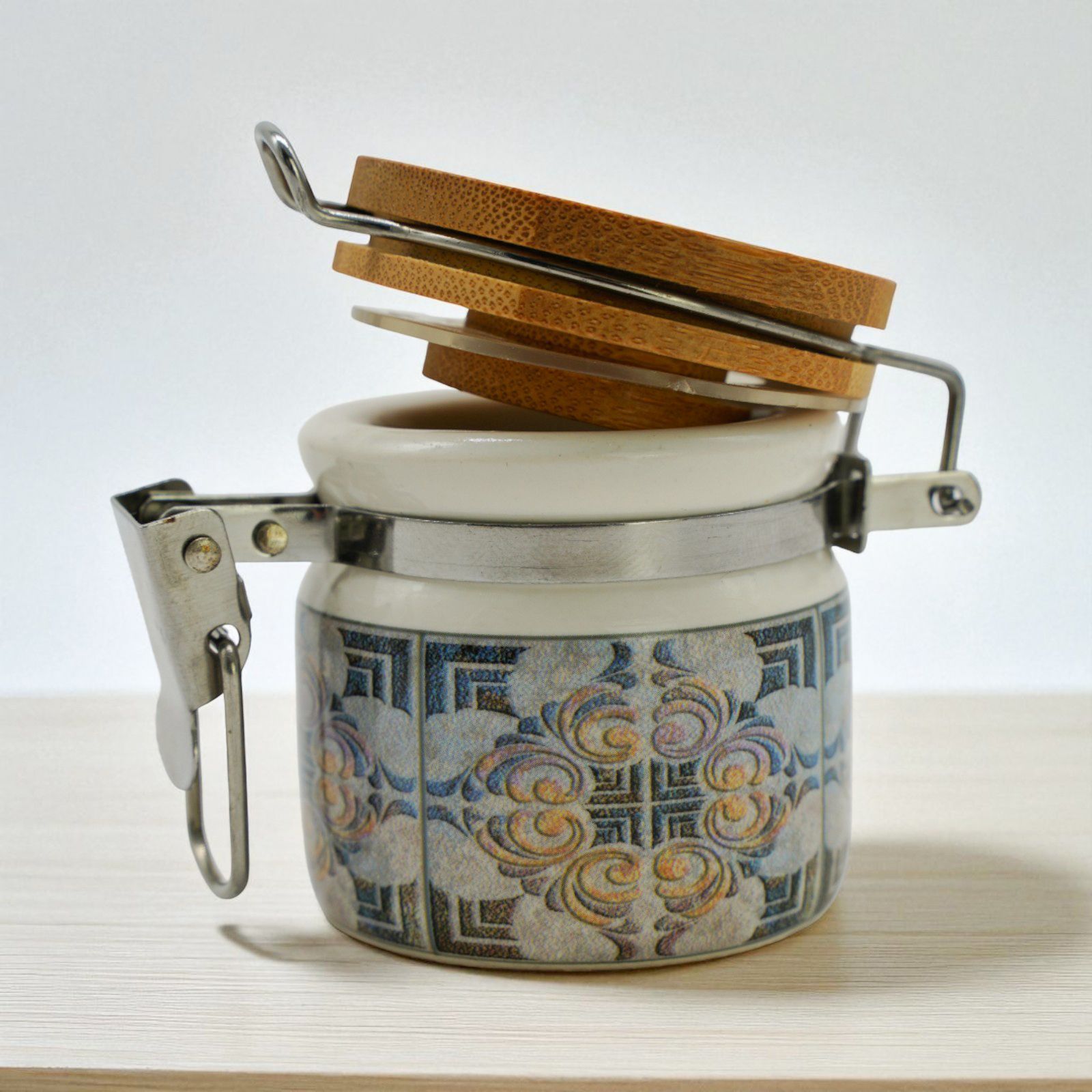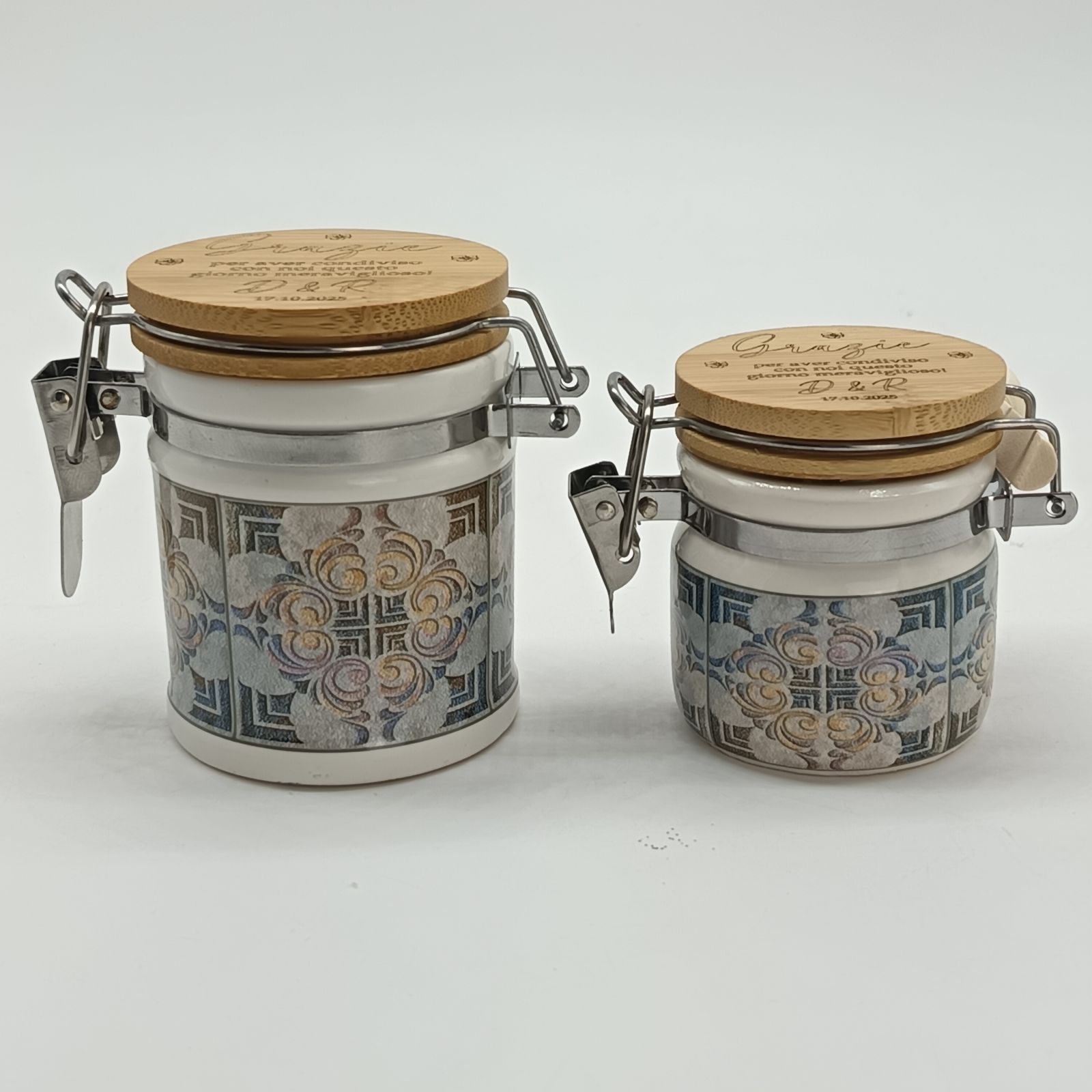 Piccolo ma prezioso, u nisce stile e praticità. La fantasia maiolica e il tappo in legno naturale lo rendono elegante, mentre la personalizzazione lo trasforma in un ricordo unico. Il barattolino è disponibile in due dimensioni: - Standard: h. 6 cm circa; Grande: h. 8 cm circa.