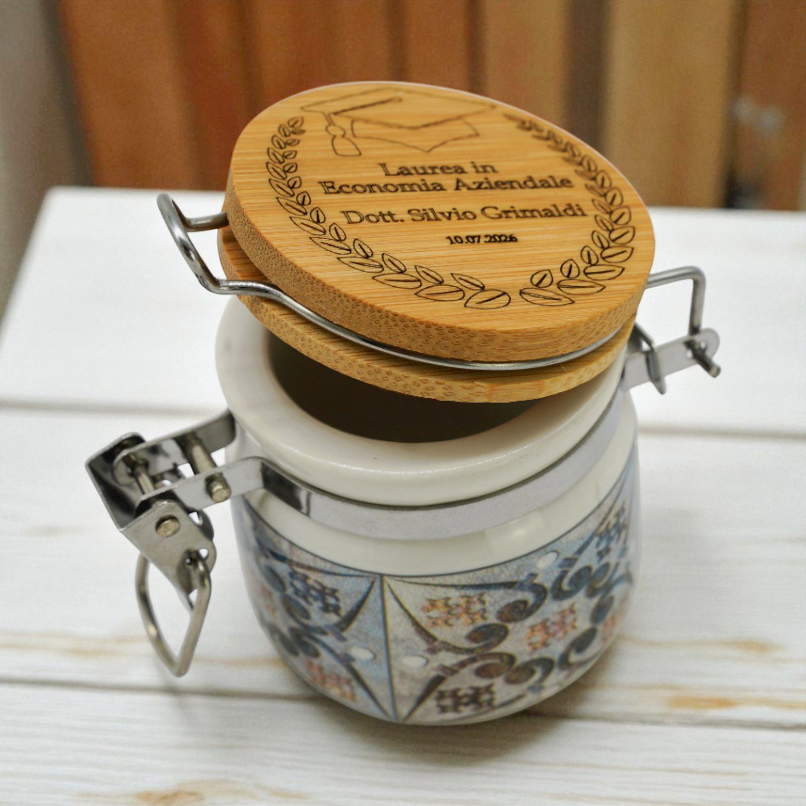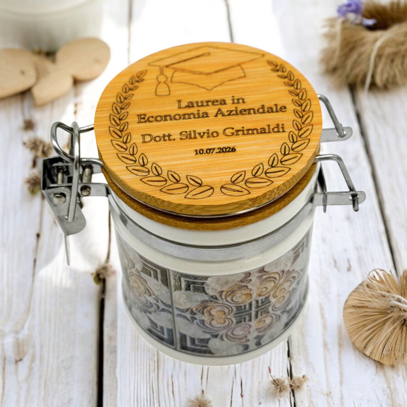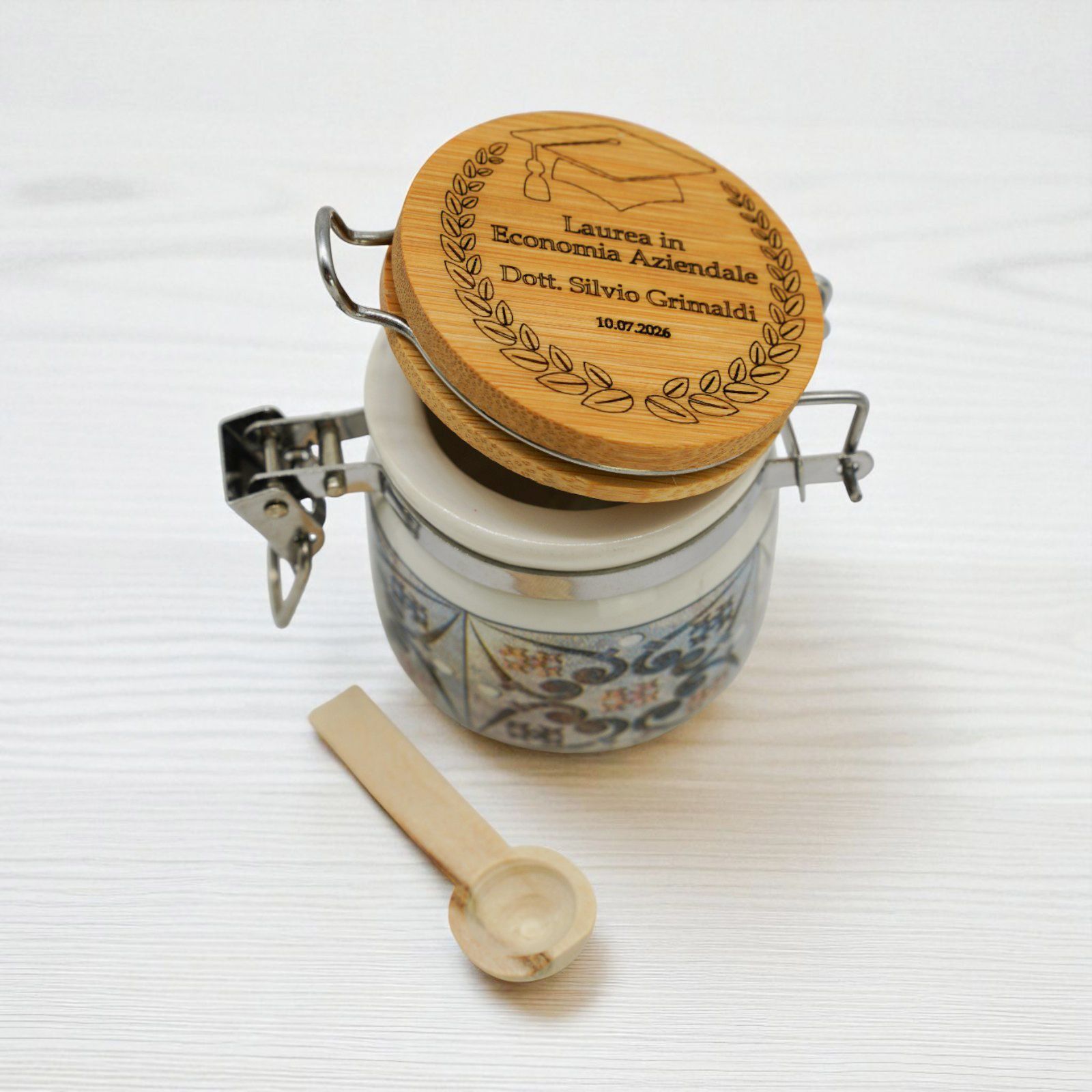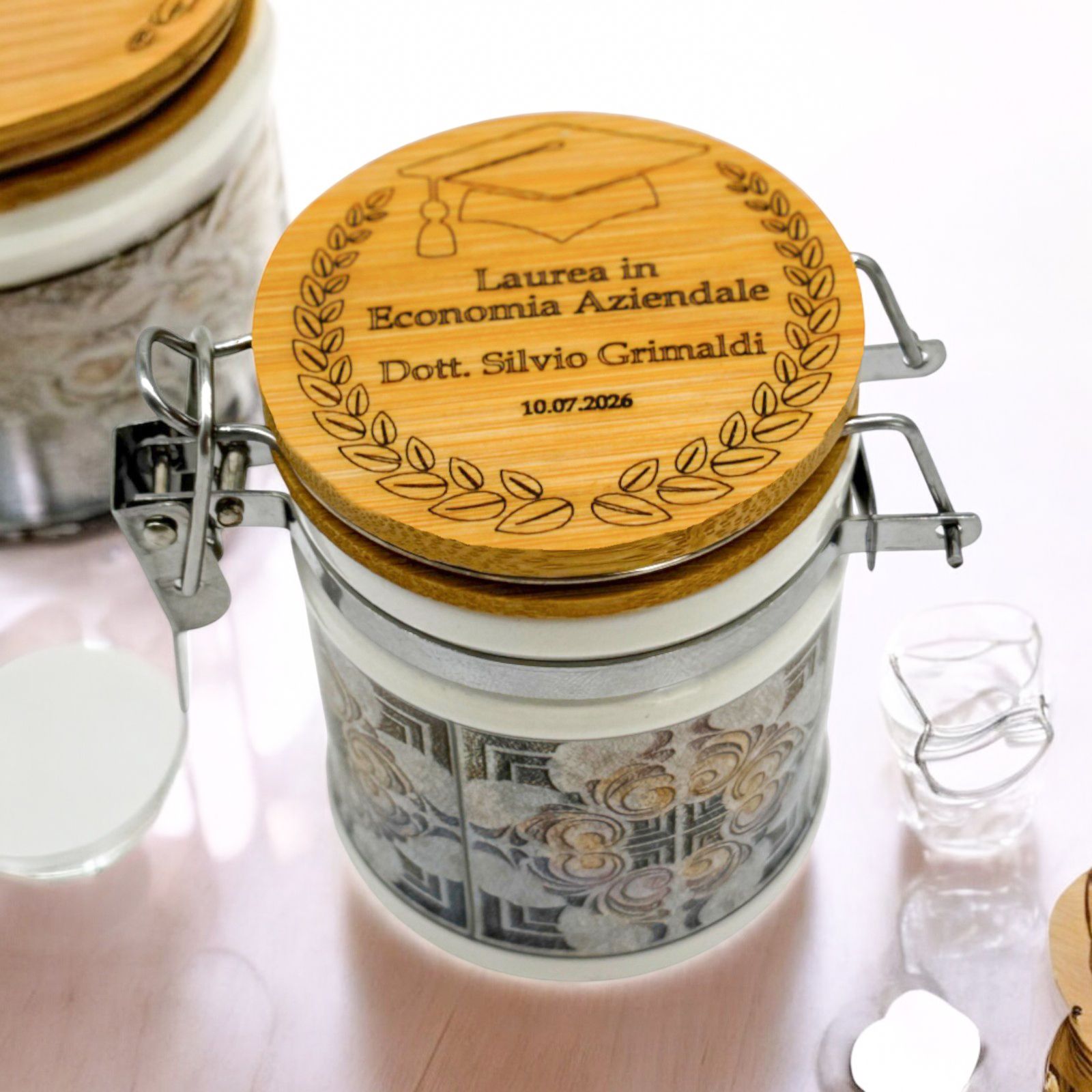 Festeggia un traguardo speciale con il nostro barattolino ermetico in ceramica con tappo in legno, pensato come raffinata bomboniera per la laurea. Impreziosito da una delicata incisione della corona d’alloro, simbolo di successo, può essere personalizzato con nome e data per renderlo unico.