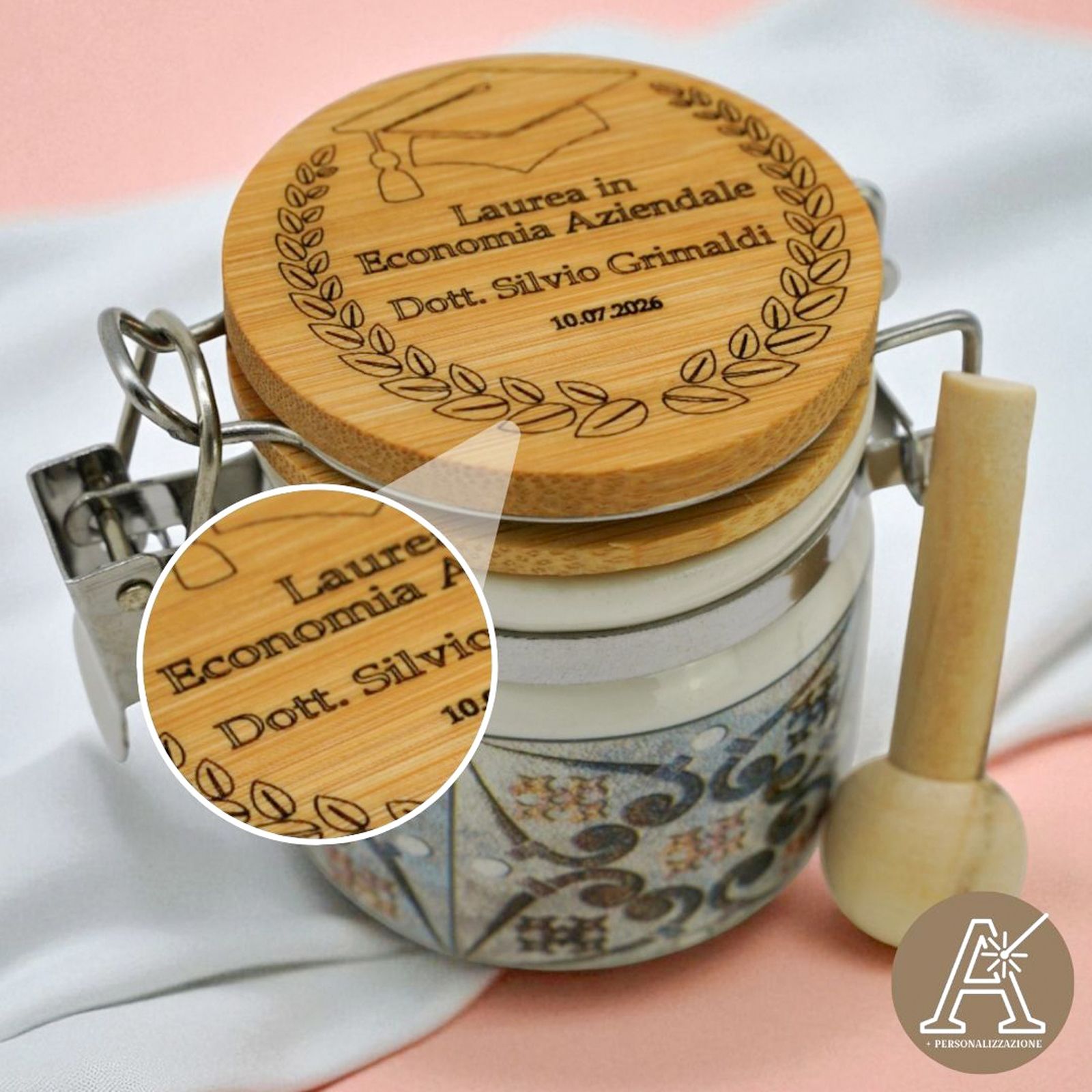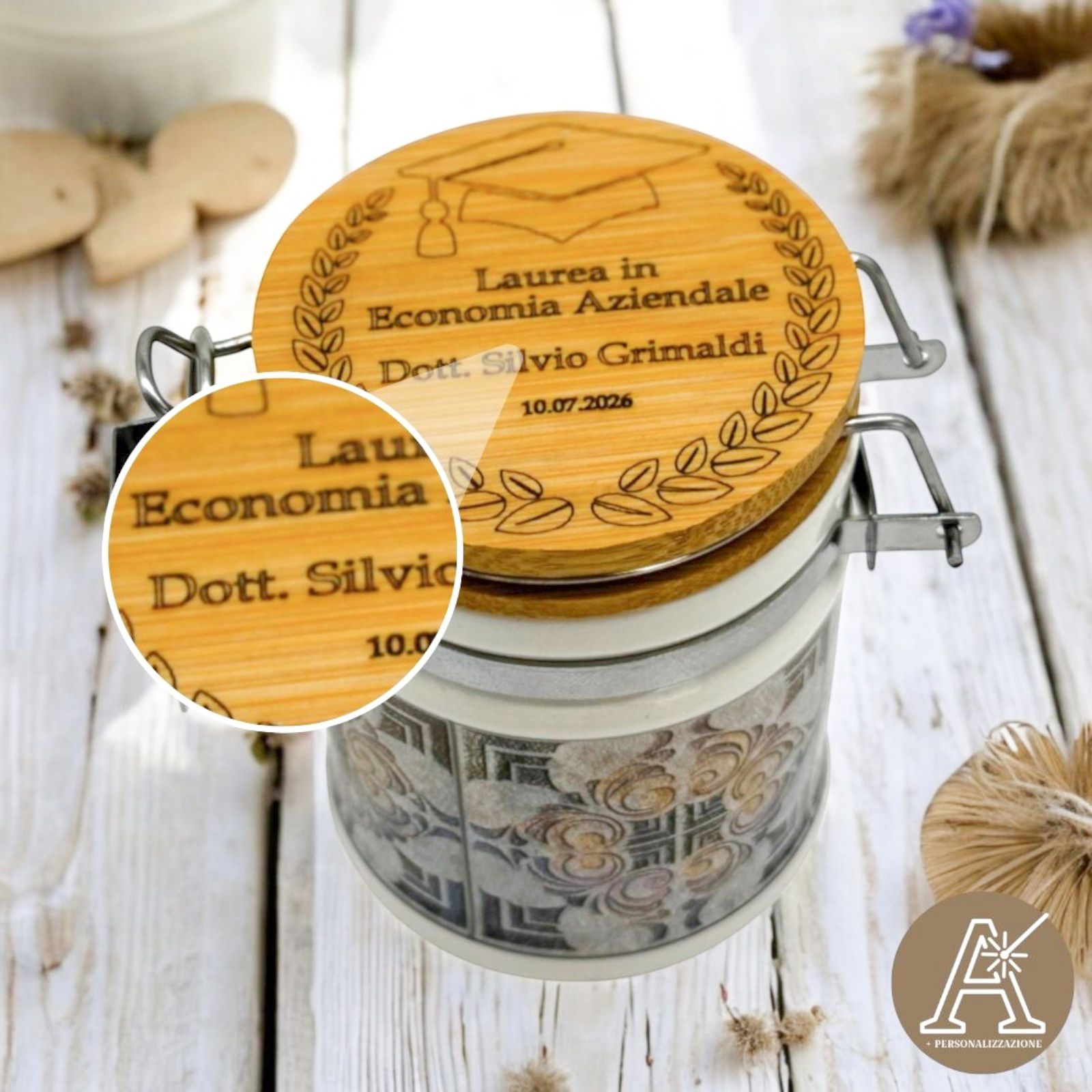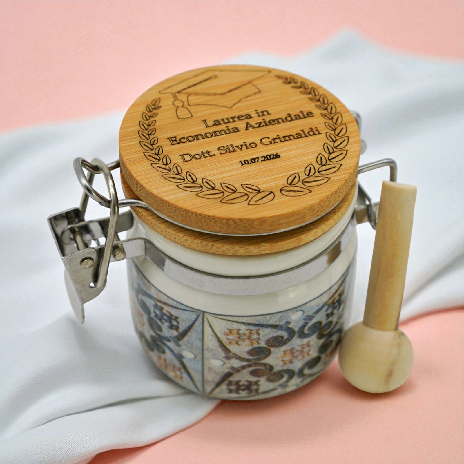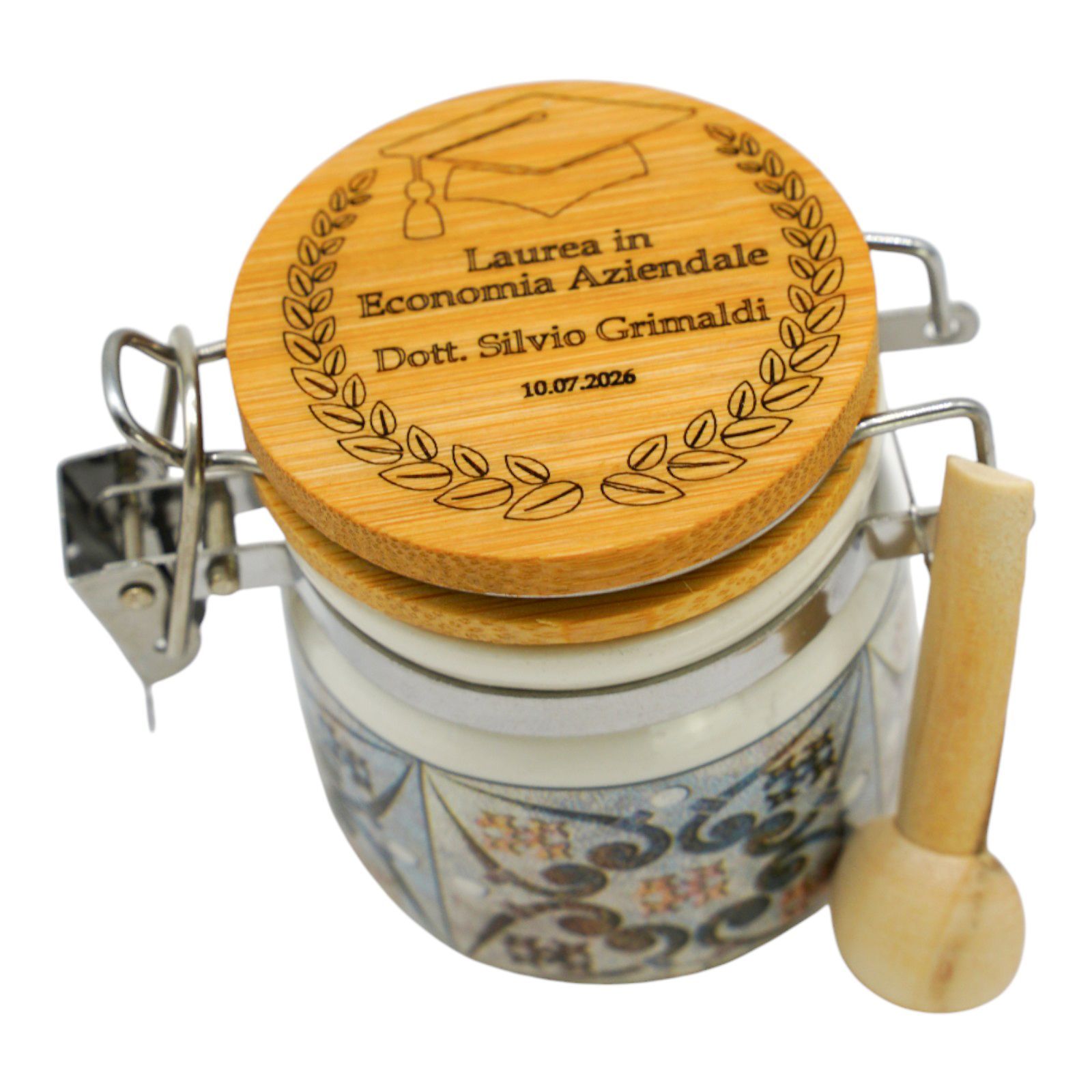 Festeggia un traguardo speciale con il nostro barattolino ermetico in ceramica con tappo in legno, pensato come raffinata bomboniera per la laurea. Impreziosito da una delicata incisione della corona d’alloro, simbolo di successo, può essere personalizzato con nome e data per renderlo unico.