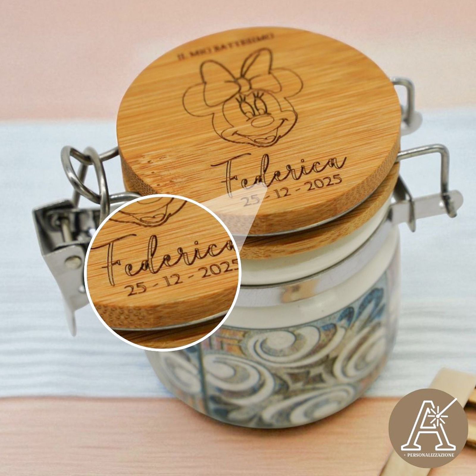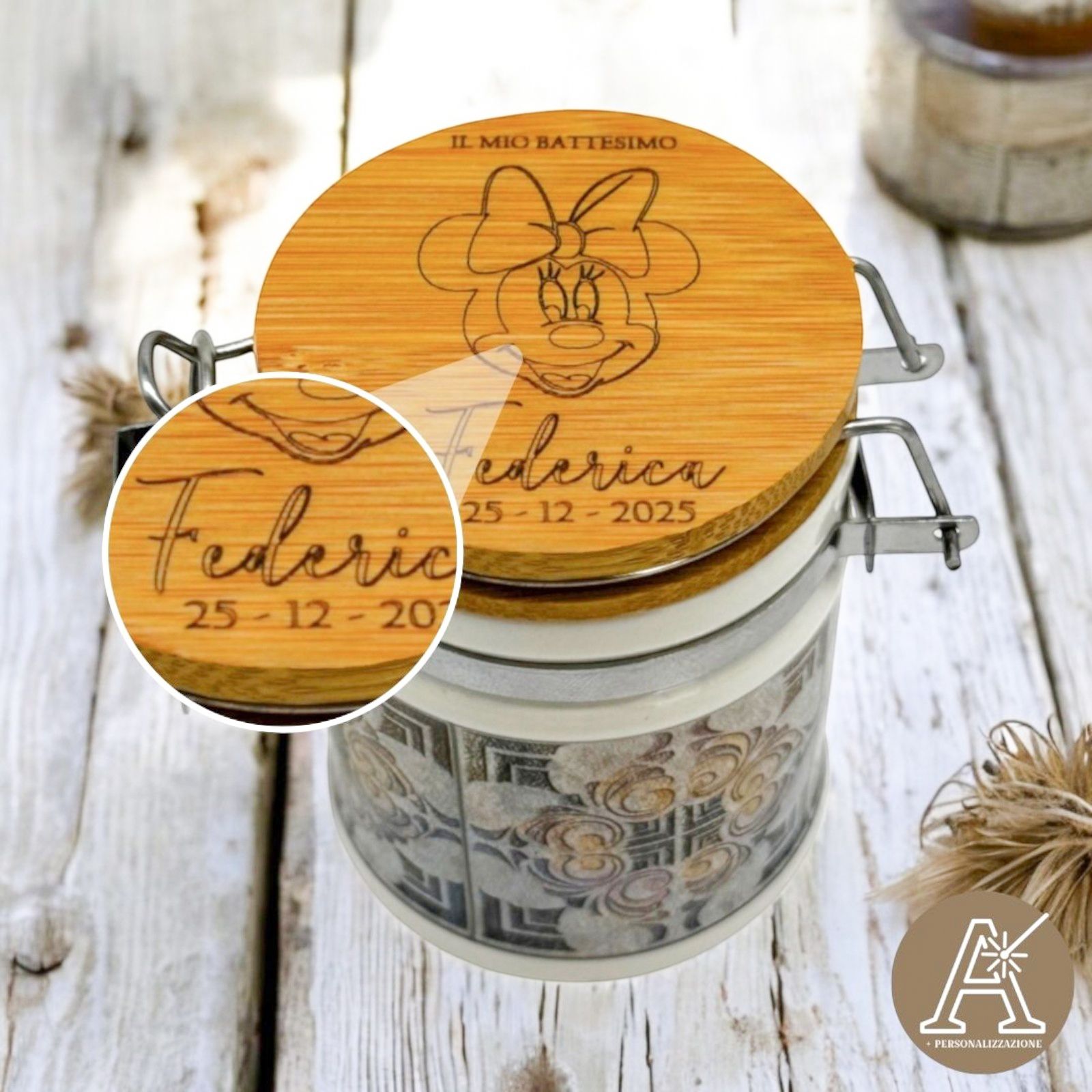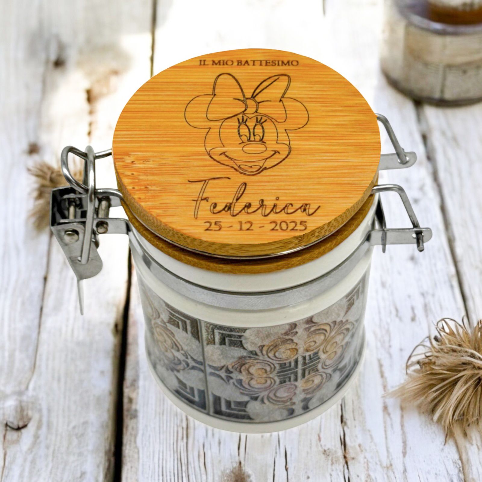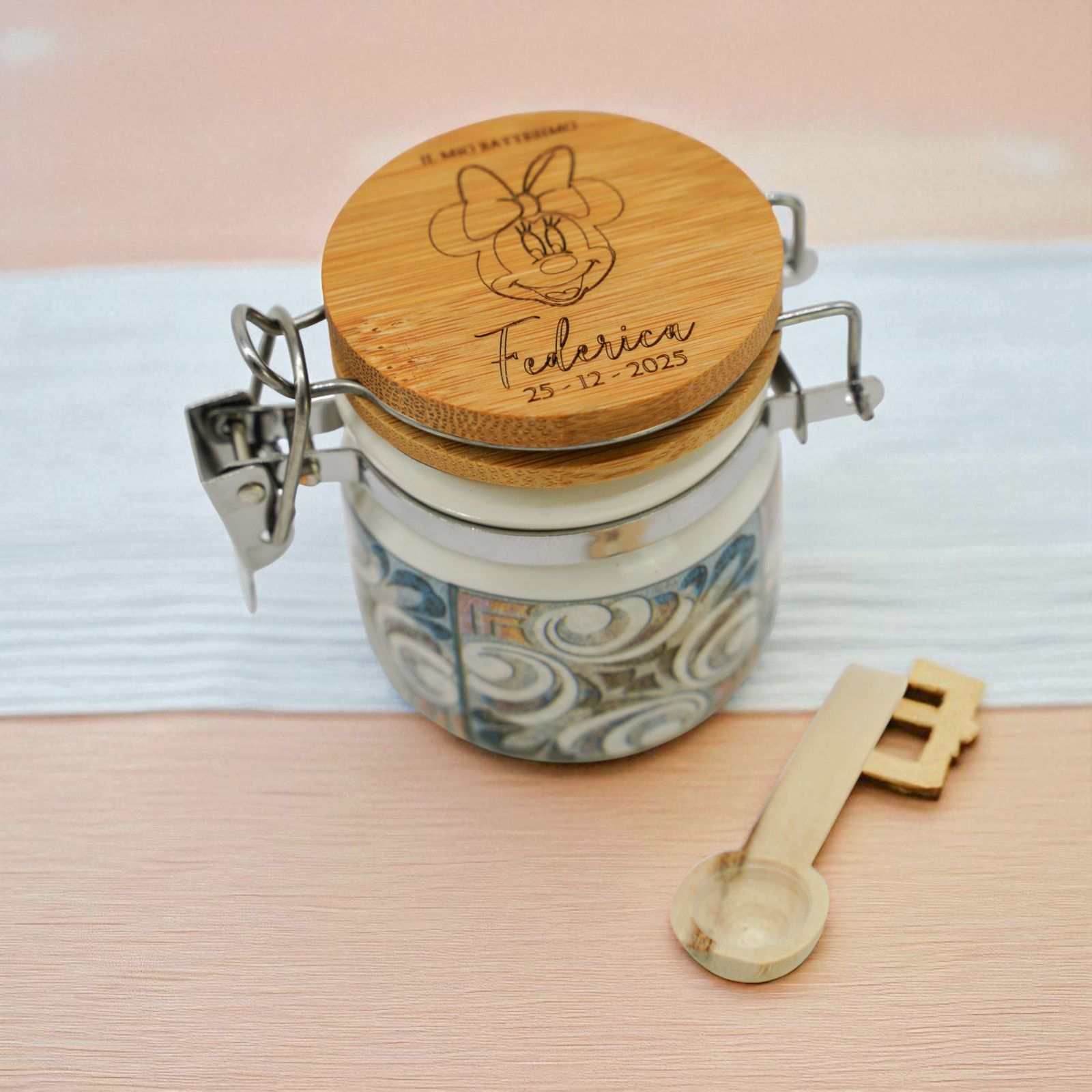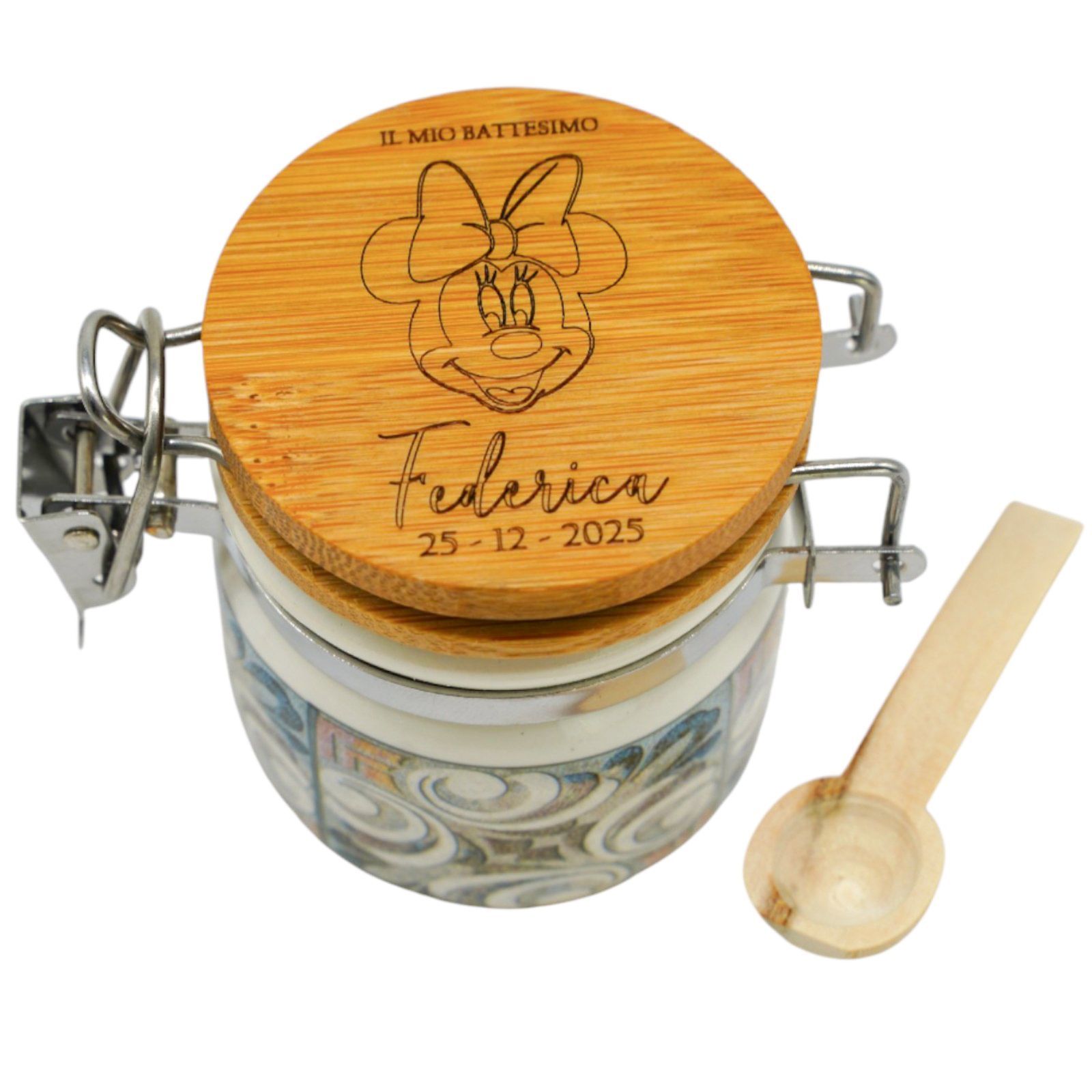 Nel giorno del tuo evento speciale, regala un tocco di dolcezza con il Barattolino Ermetico personalizzato Minnie. Realizzato in ceramica di alta qualità con tappo in legno, è perfetto per nascita, battesimo, prima comunione o compleanno.