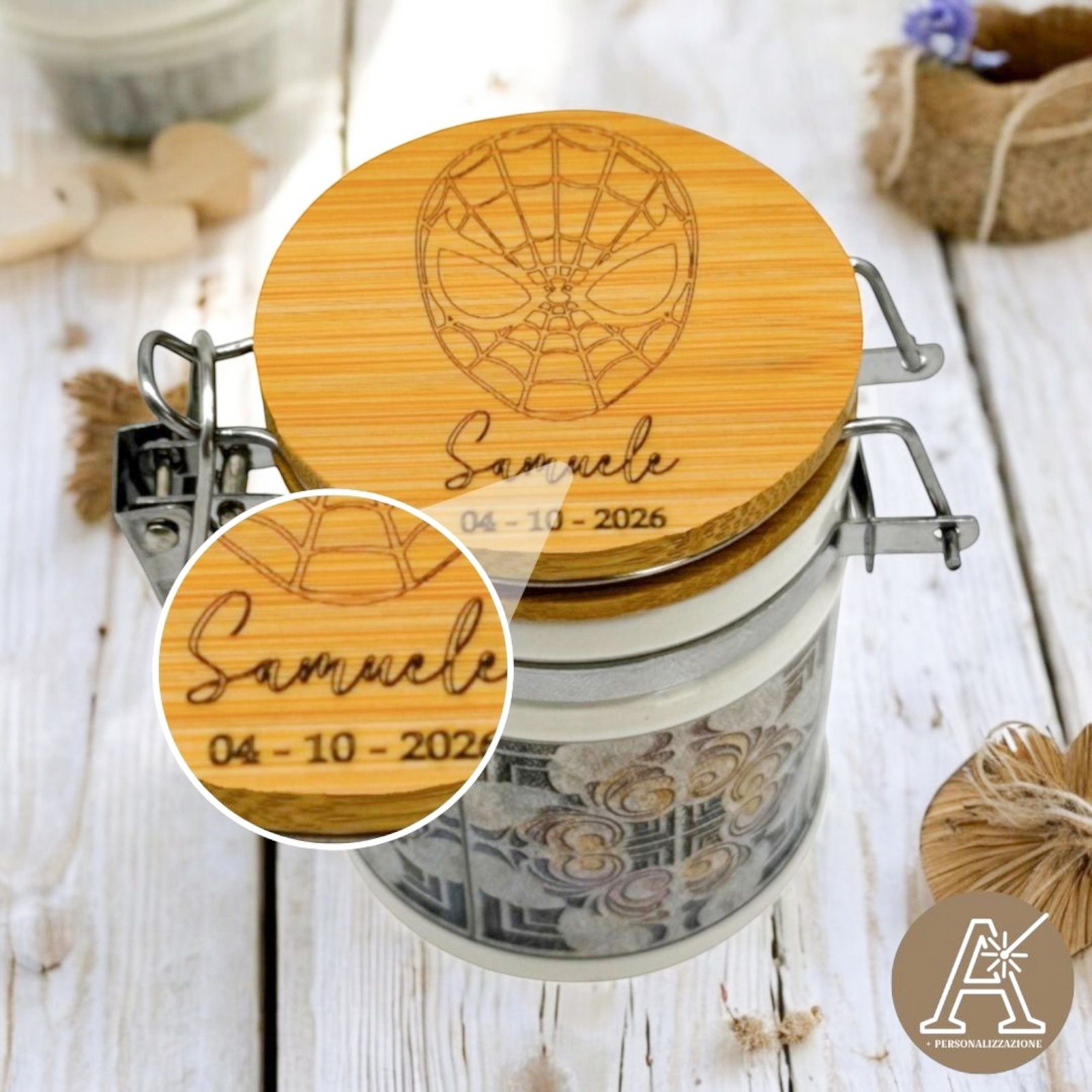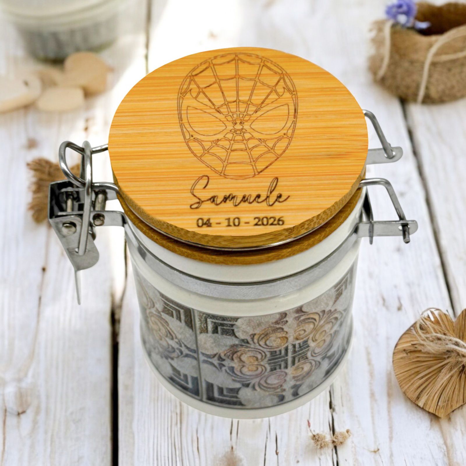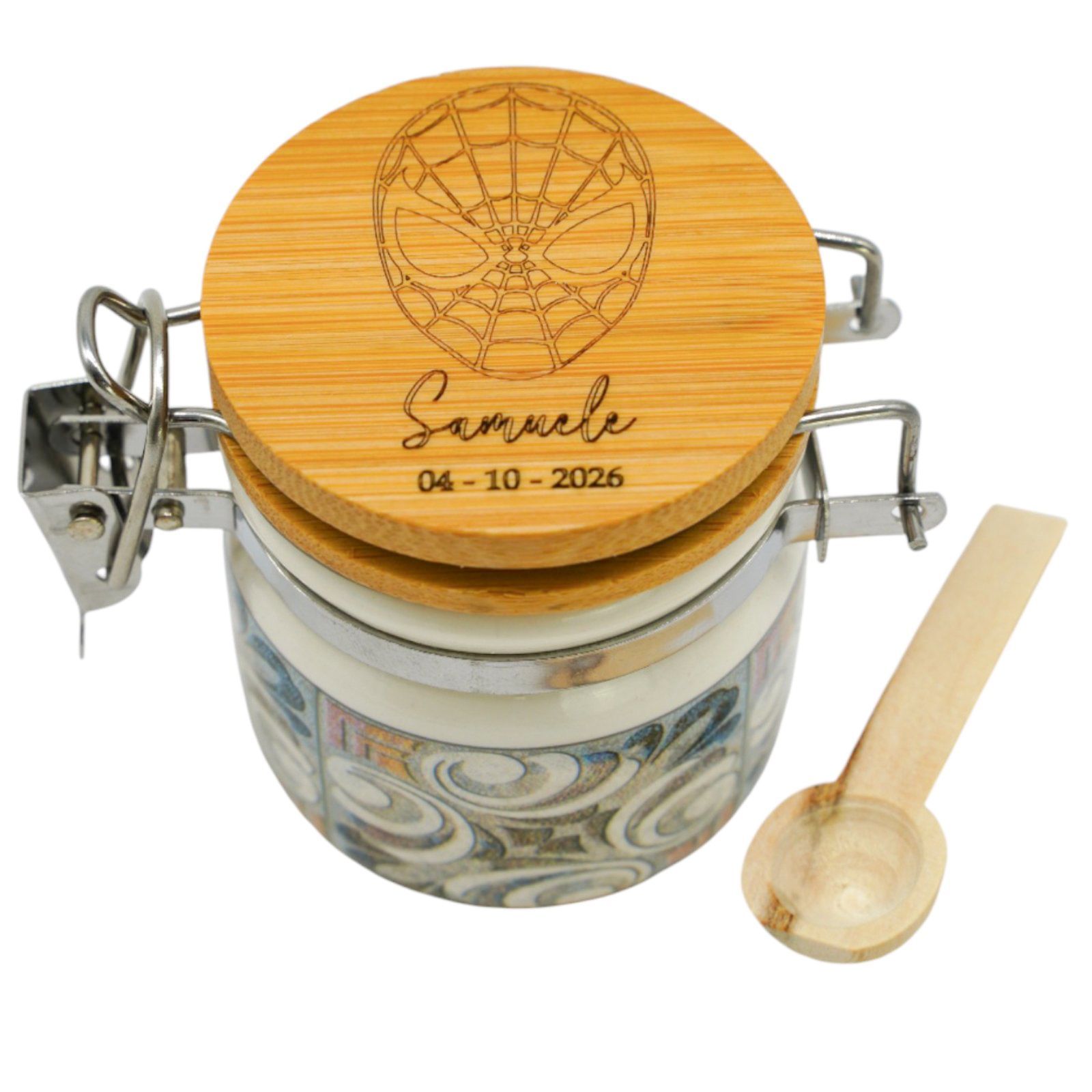 Ideale per festeggiare una cerimonia come nascita, battesimo, prima comunione o compleanno, questo grazioso barattolo ermetico con chiusura in legno e inciso con il volto di Spiderman sarà un pensiero originale che renderà l’occasione ancora più speciale.