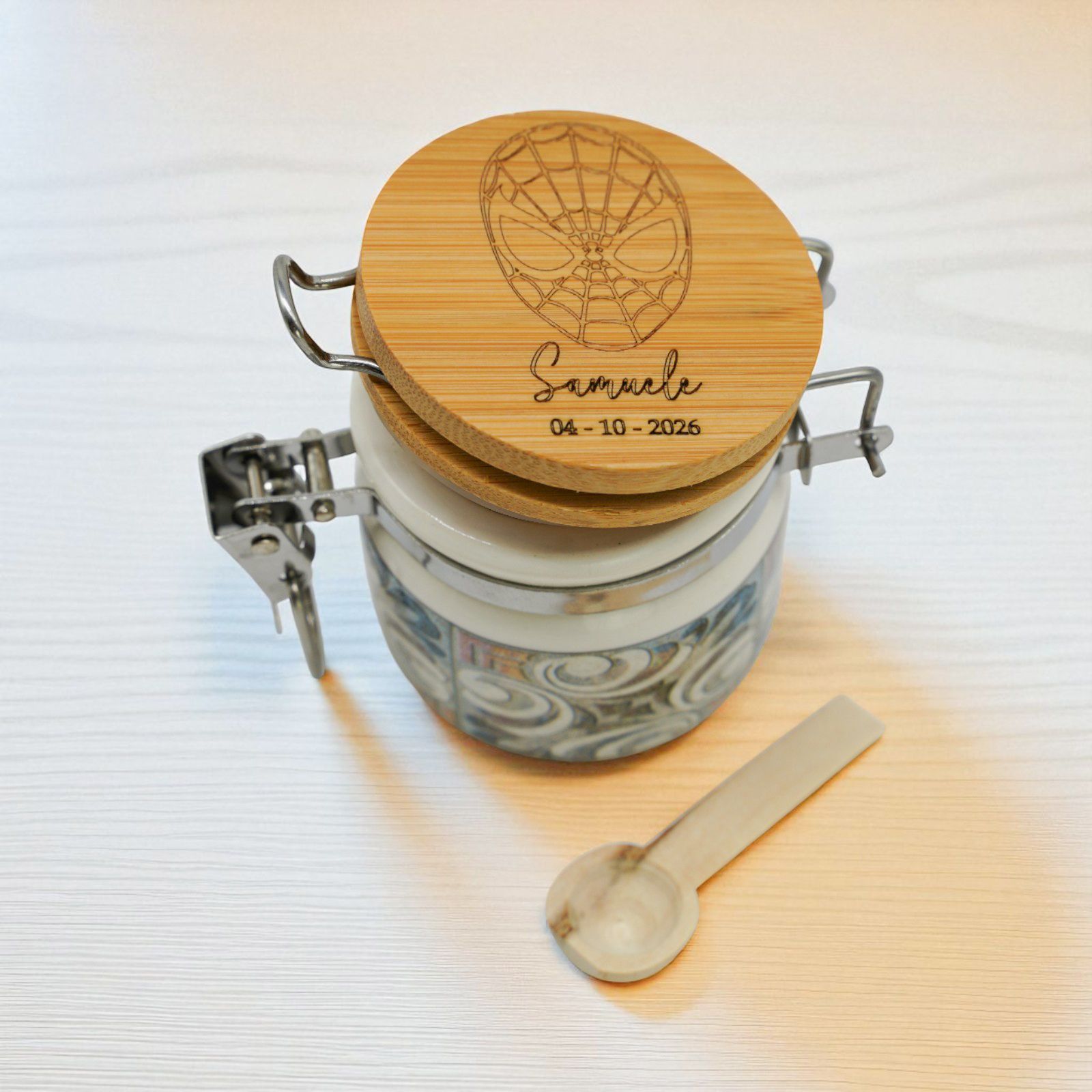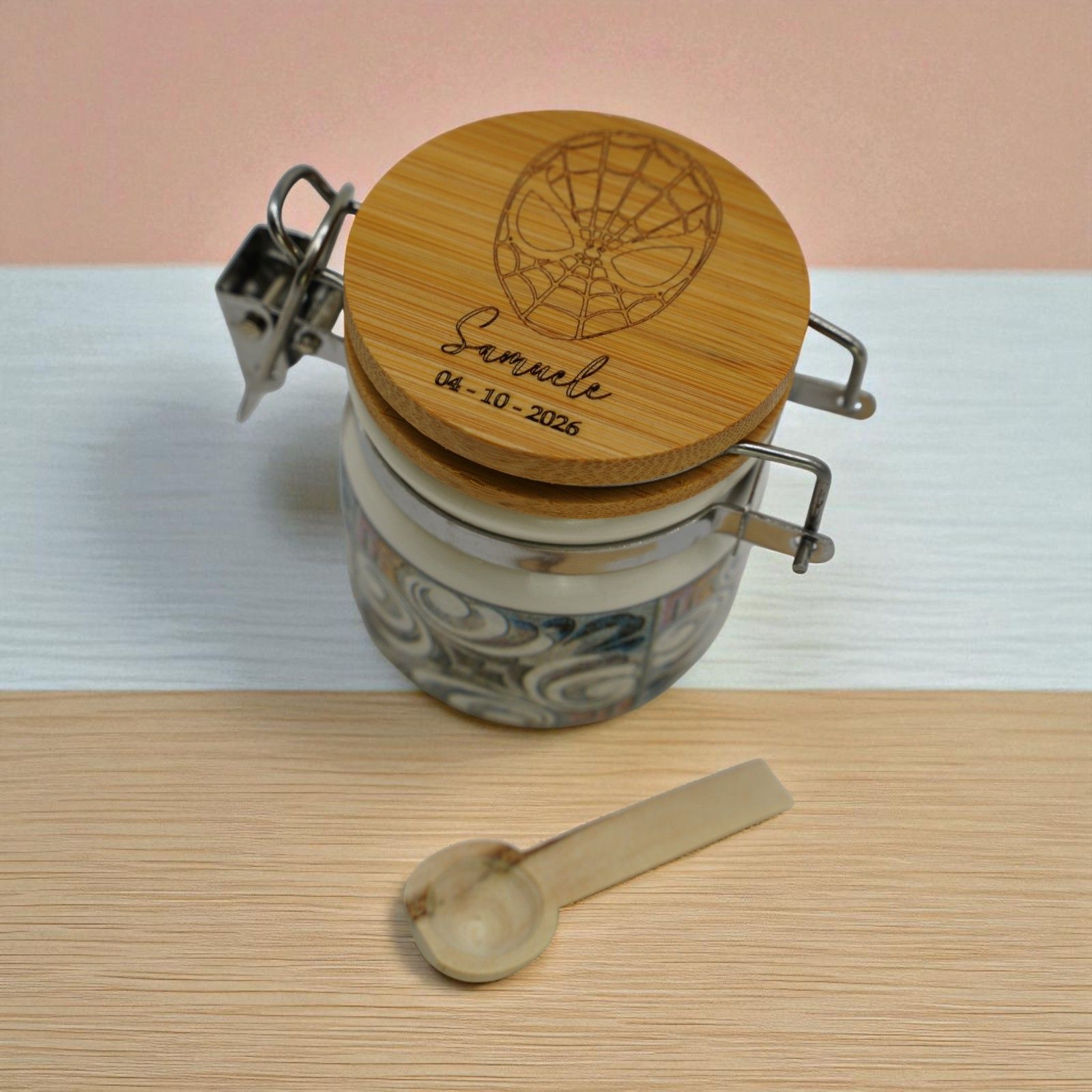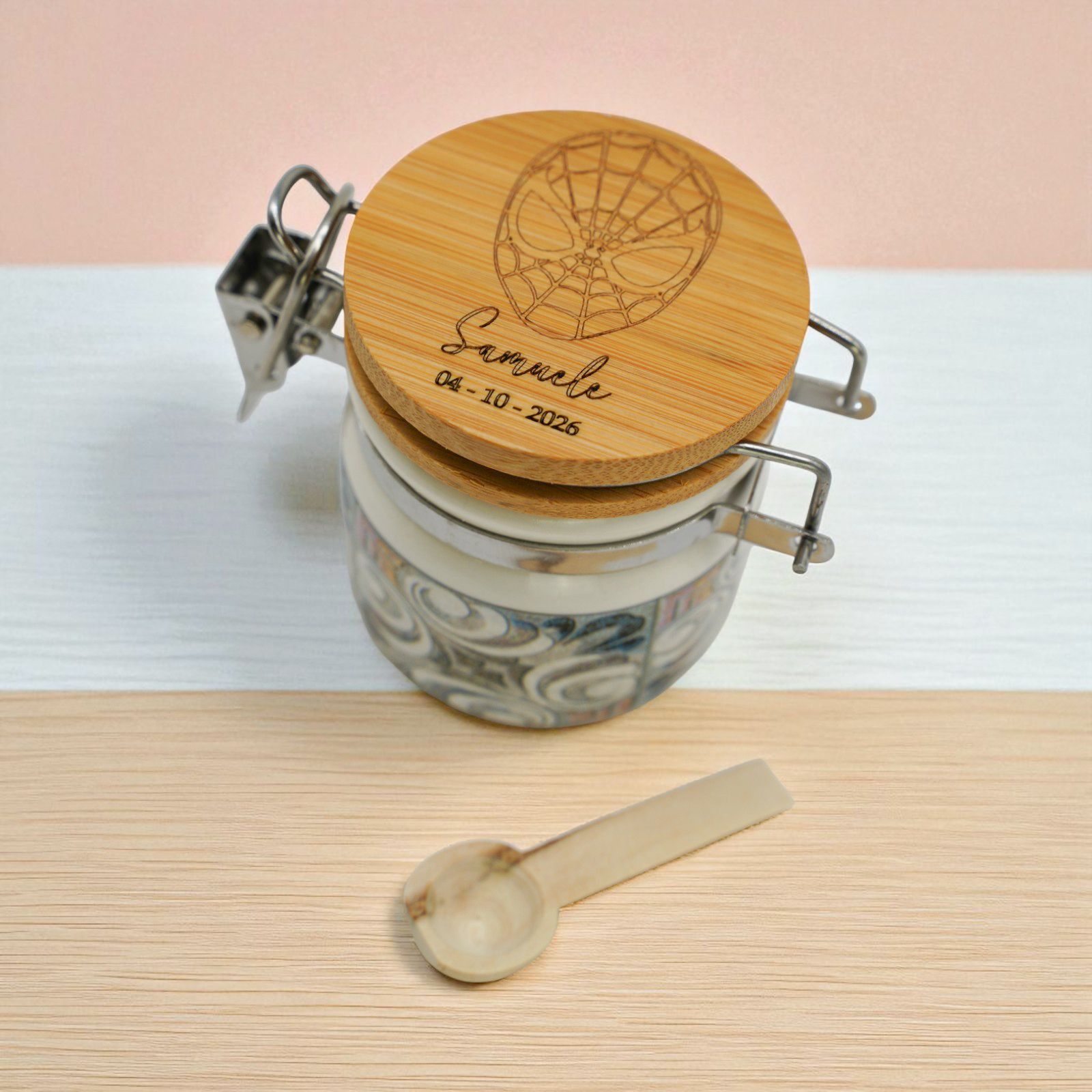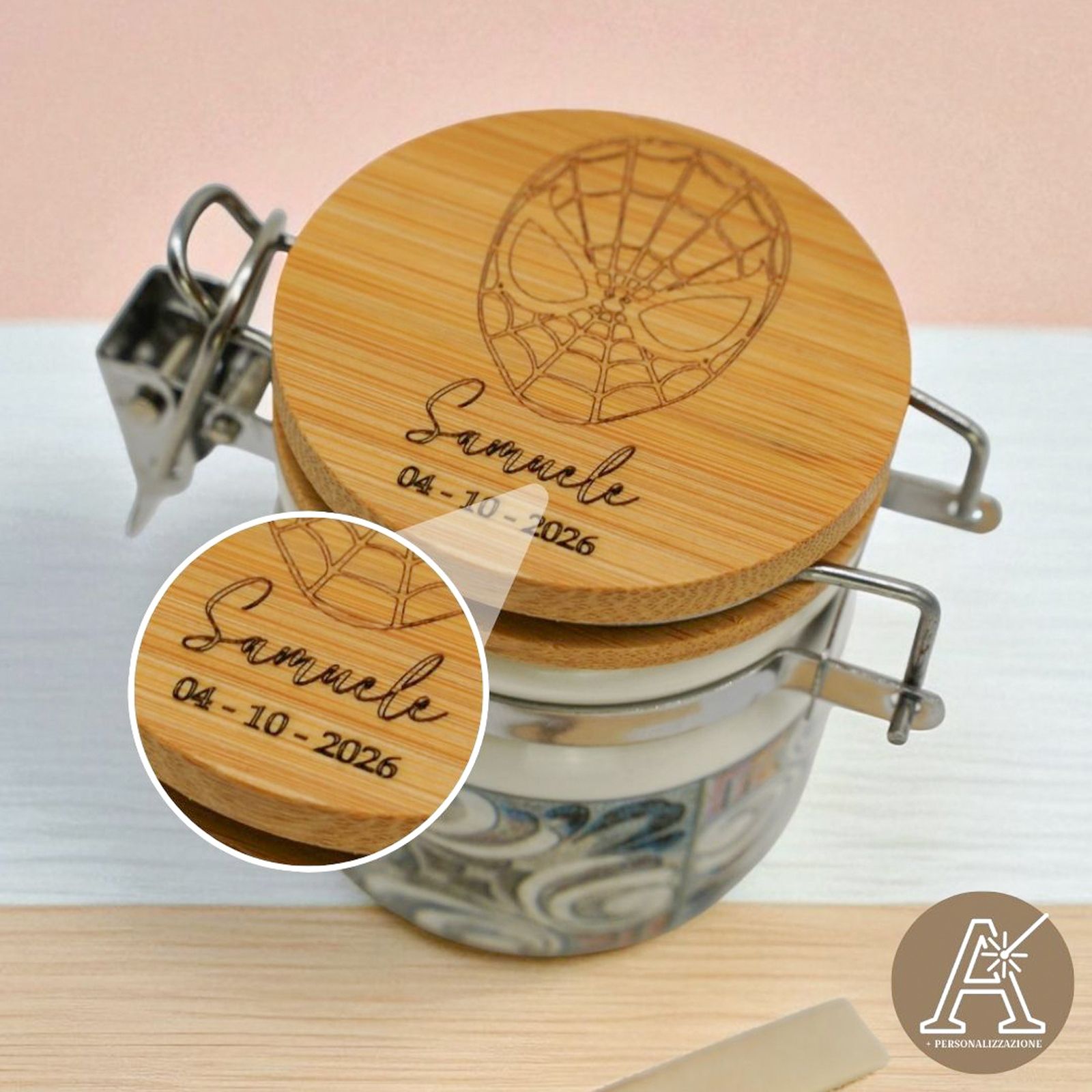 Ideale per festeggiare una cerimonia come nascita, battesimo, prima comunione o compleanno, questo grazioso barattolo ermetico con chiusura in legno e inciso con il volto di Spiderman sarà un pensiero originale che renderà l’occasione ancora più speciale.
