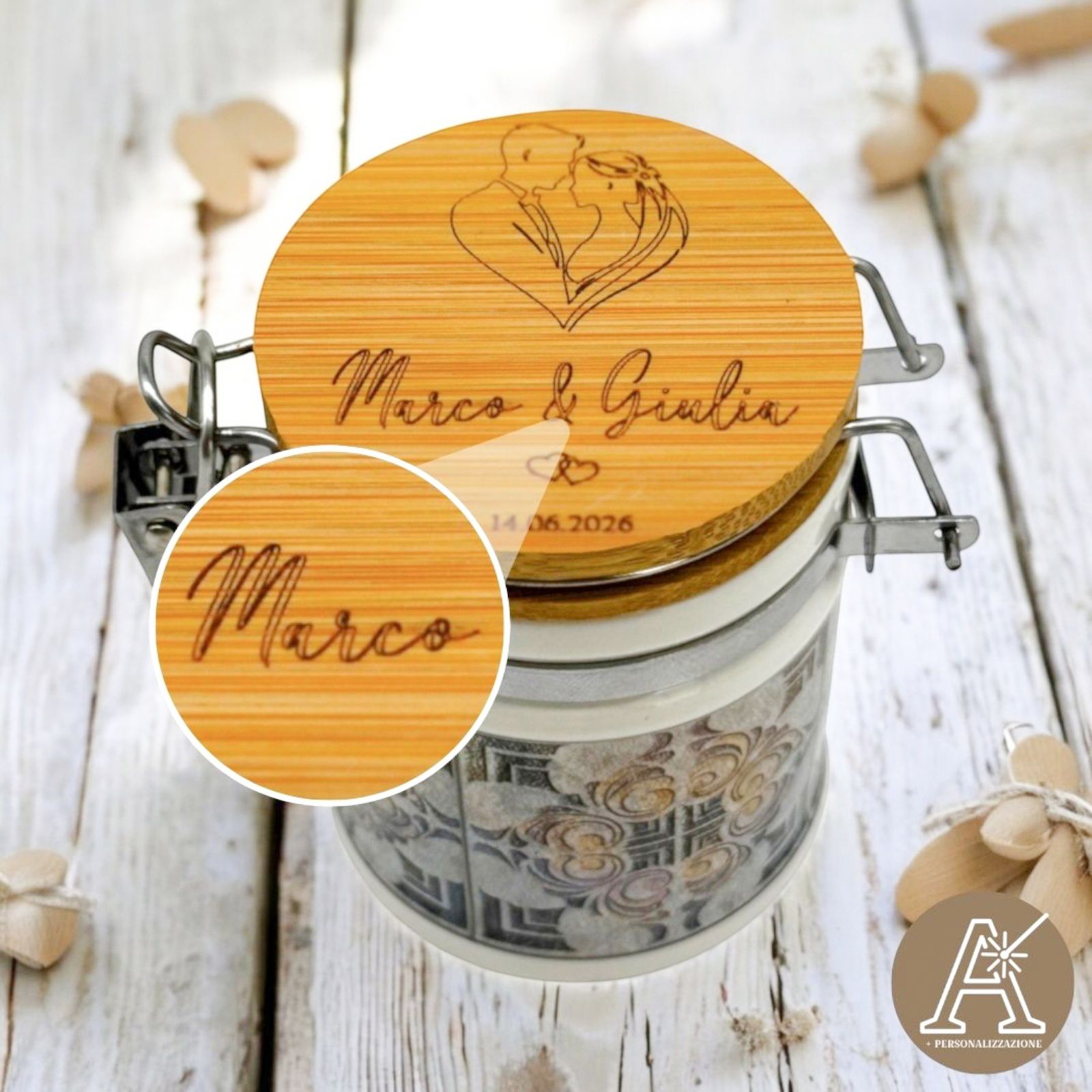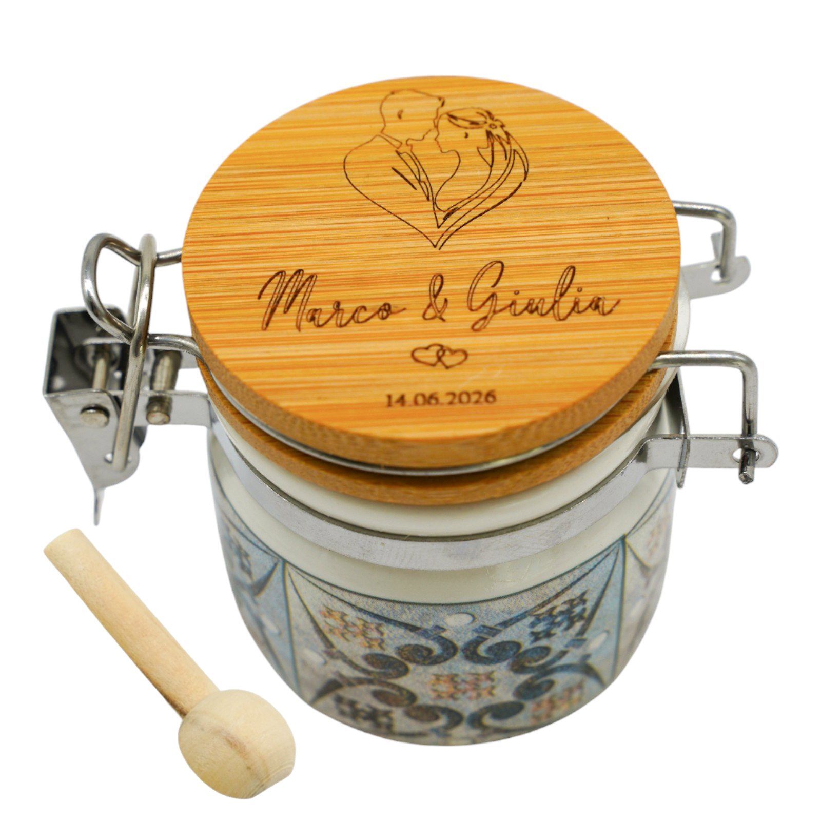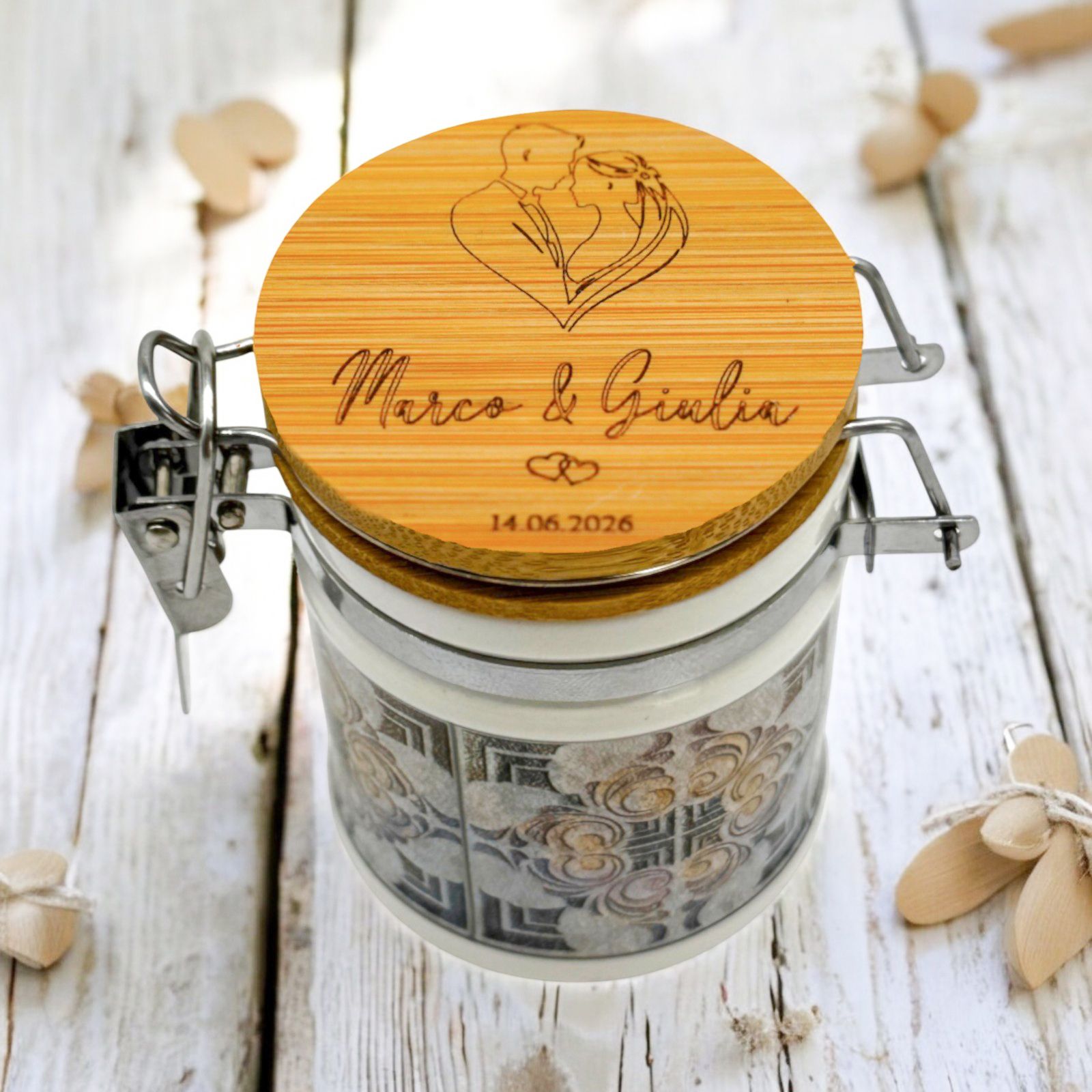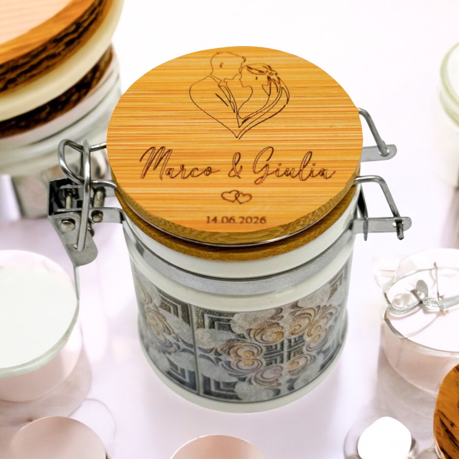 Rendete indimenticabile il vostro giorno speciale con questo barattolino ermetico unico: una bomboniera personalizzabile con una coppia di sposi abbracciati a formare un cuore, che porterà un tocco di romanticismo e dolcezza.