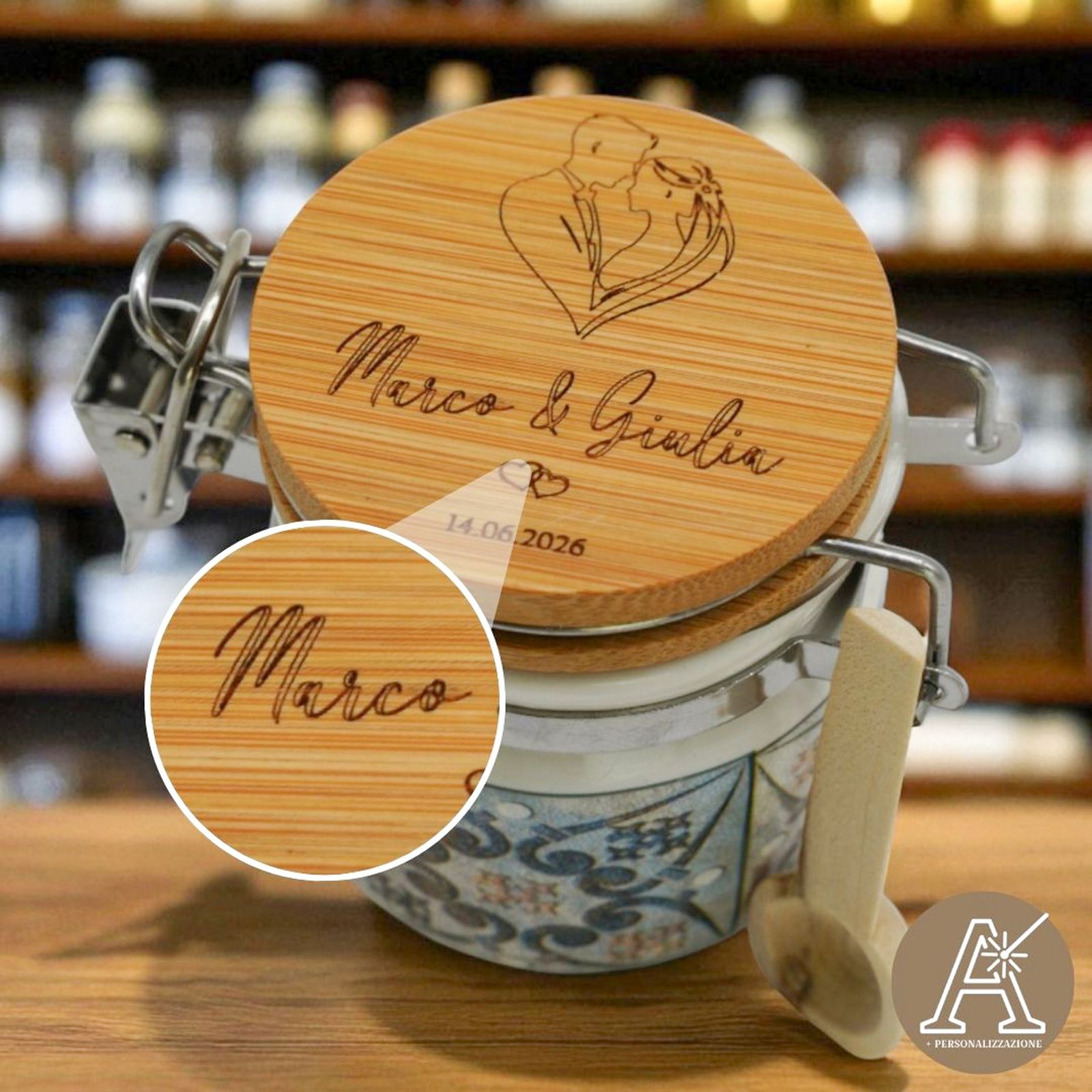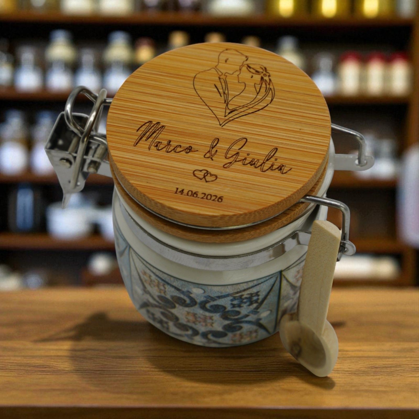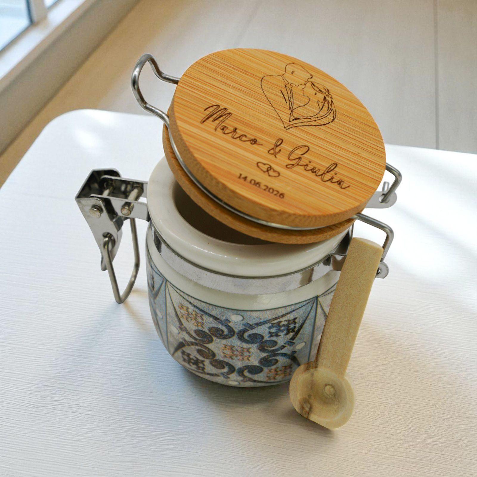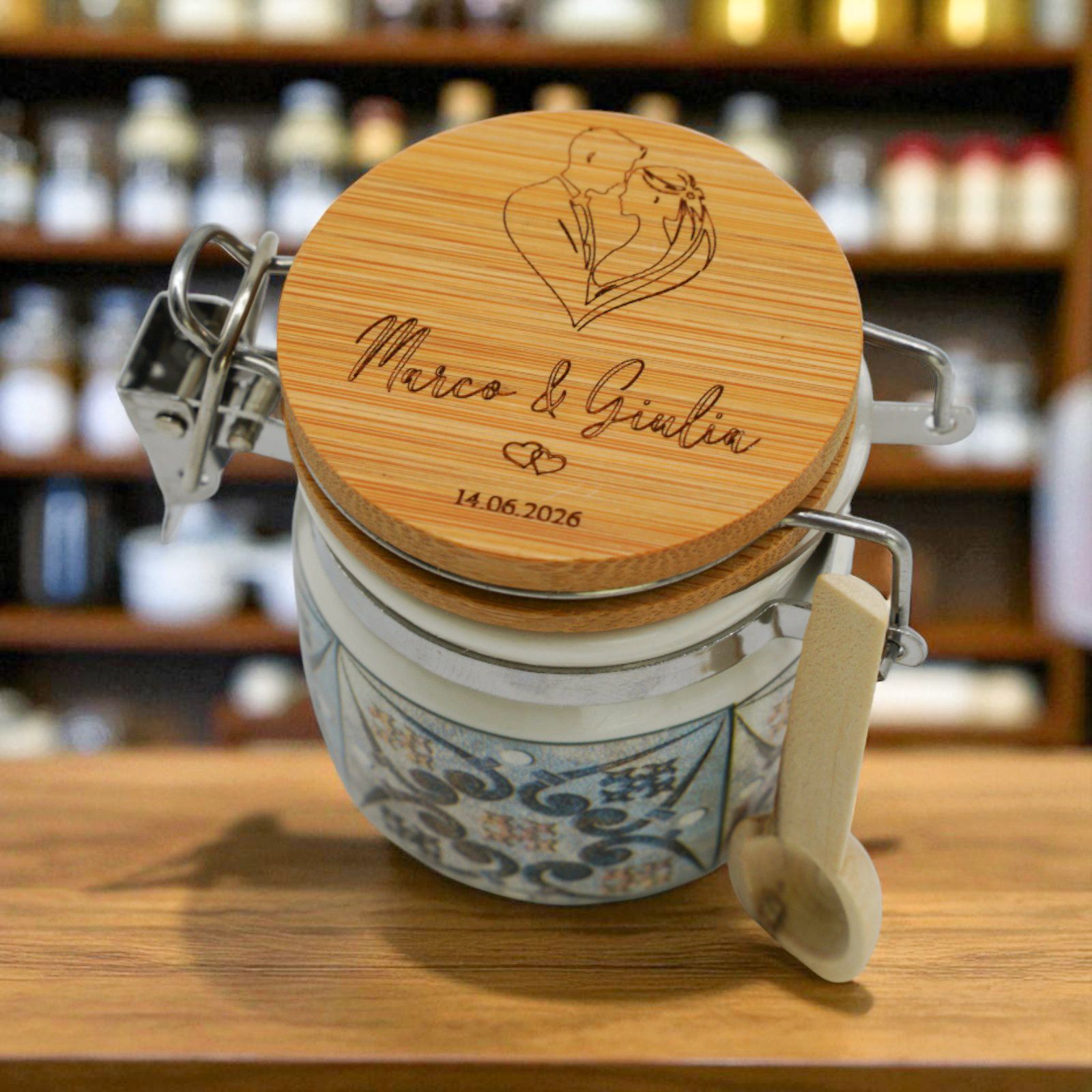 Rendete indimenticabile il vostro giorno speciale con questo barattolino ermetico unico: una bomboniera personalizzabile con una coppia di sposi abbracciati a formare un cuore, che porterà un tocco di romanticismo e dolcezza.