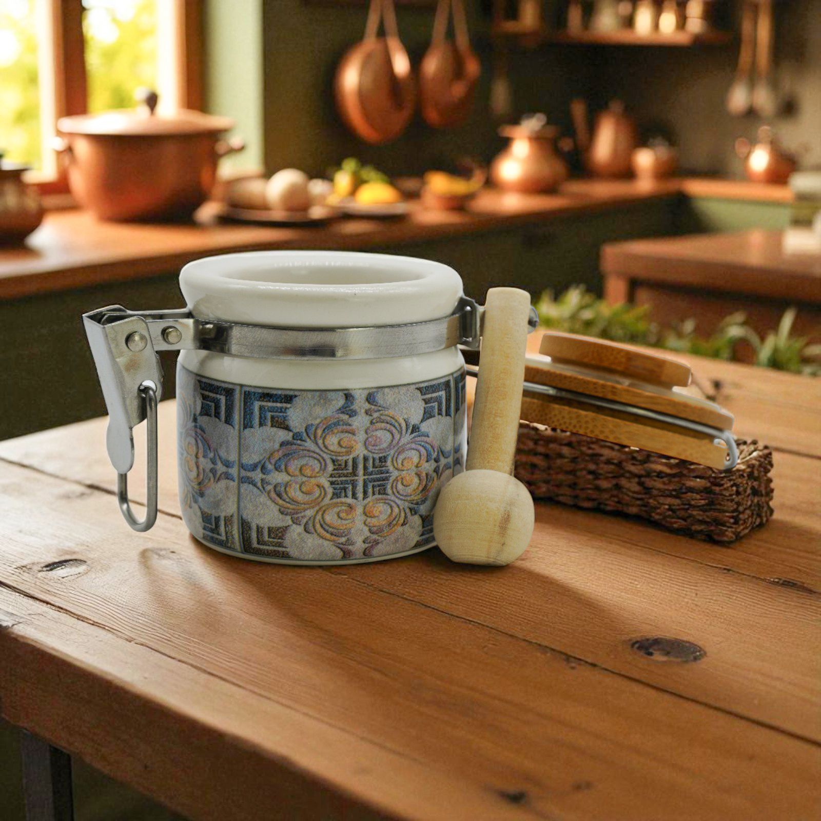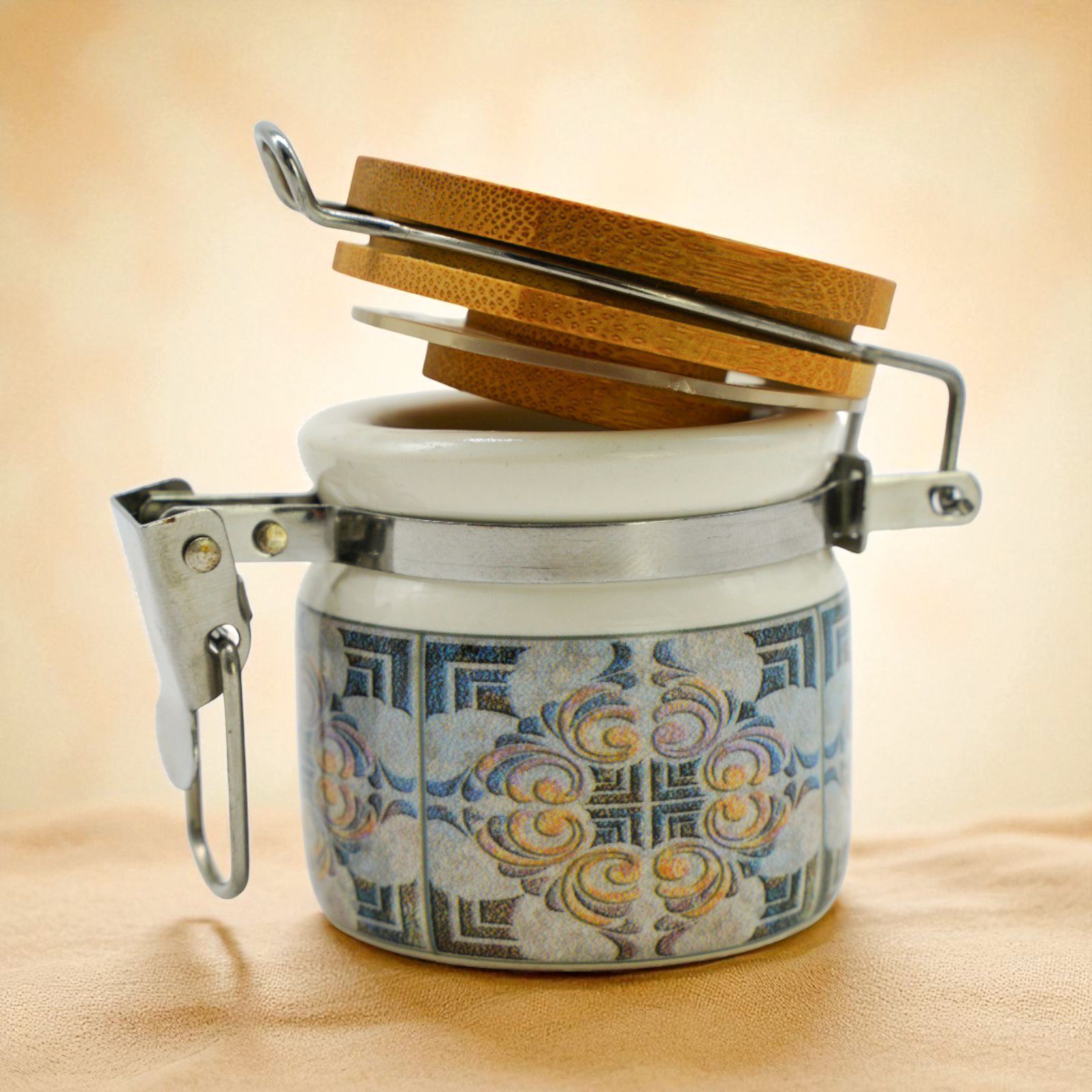 Disponibile in due dimensioni: - Standard: h. 6 cm circa; Grande: h. 8 cm circa, il barattolino non è solo bello, ma anche pratico: può contenere spezie o altri piccoli oggetti, diventando un portaspezie versatile da usare ogni giorno. La fantasia maiolica e il tappo in legno conferiscono un tocco rustico ed elegante, adatto a qualsiasi stile di arredamento.
