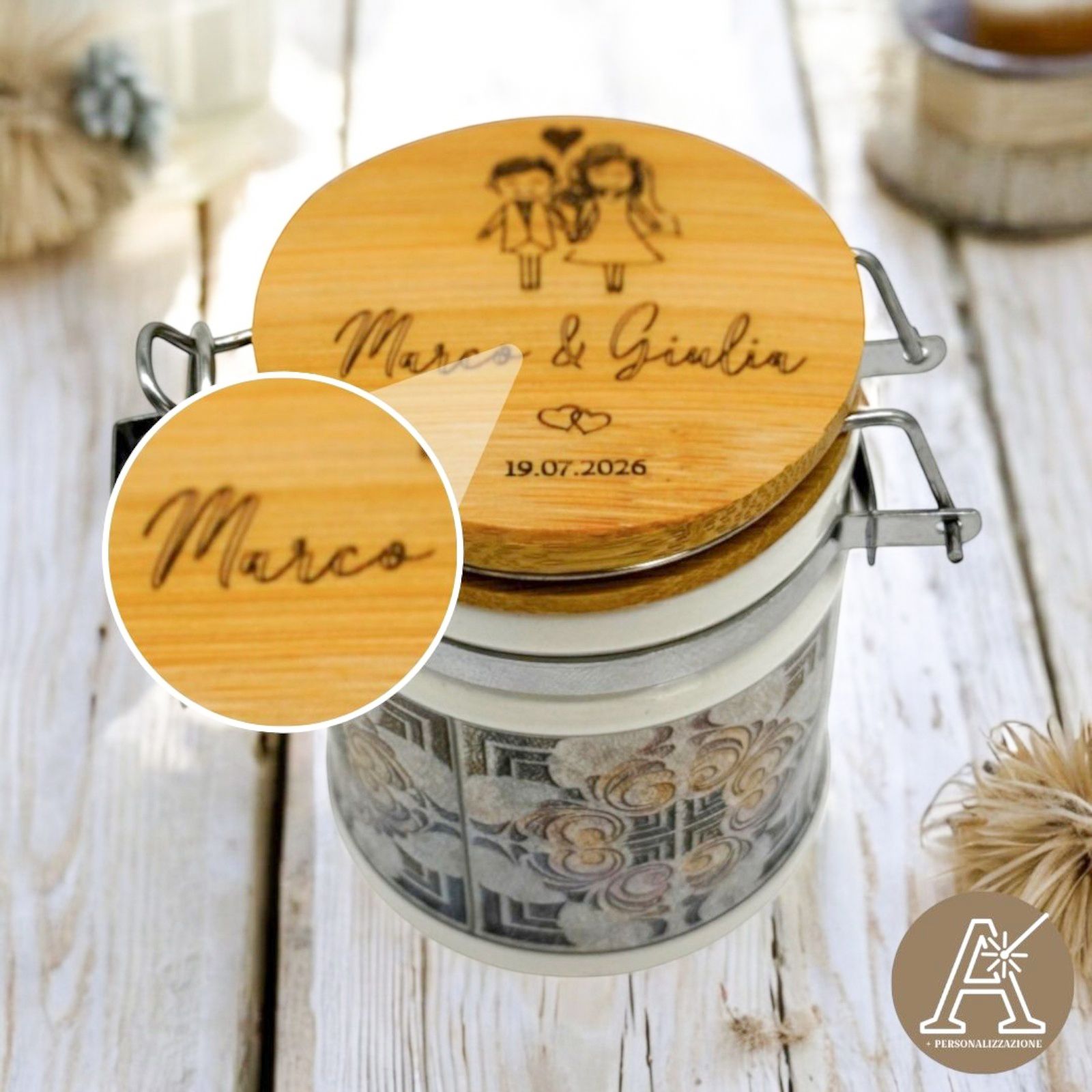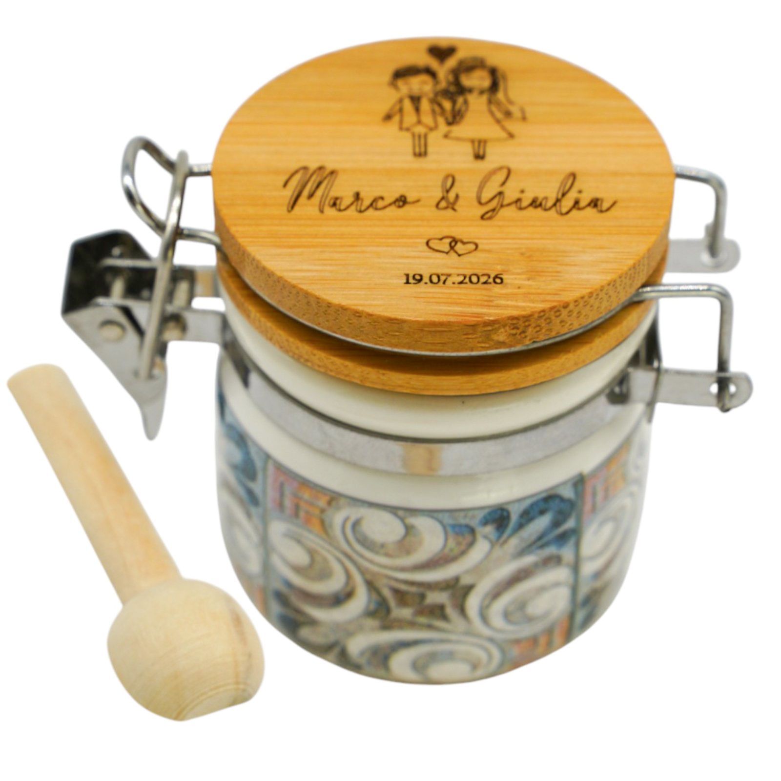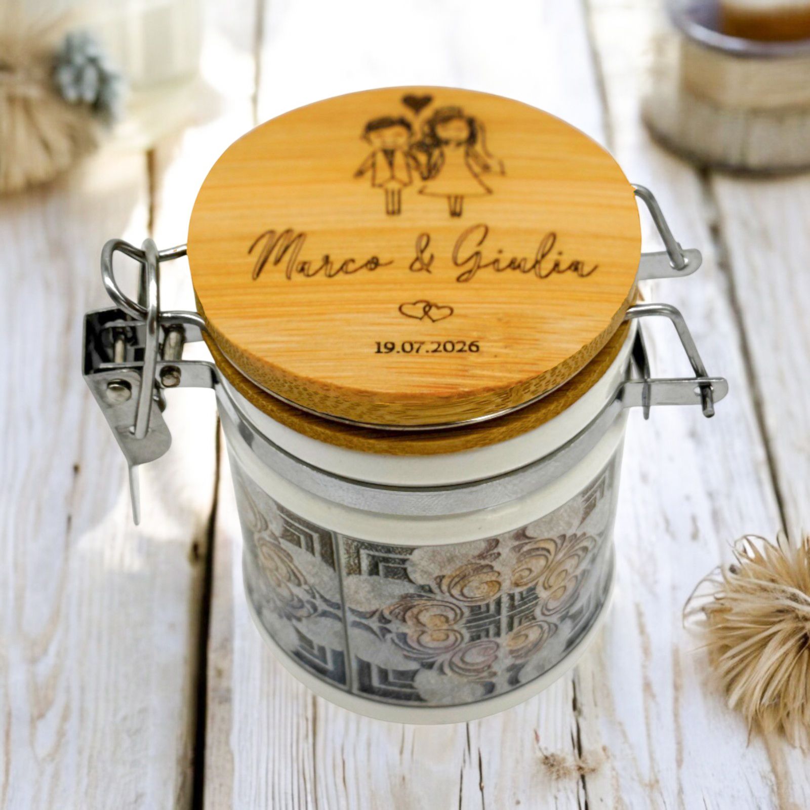 Sposi incisi su un barattolino ermetico personalizzabile: sorprendi i tuoi ospiti con questa dolcissima bomboniera! Decorata con una coppia di sposi mano nella mano e un cuoricino, è personalizzabile con nomi e data ed è perfetta per matrimonio e anniversario.