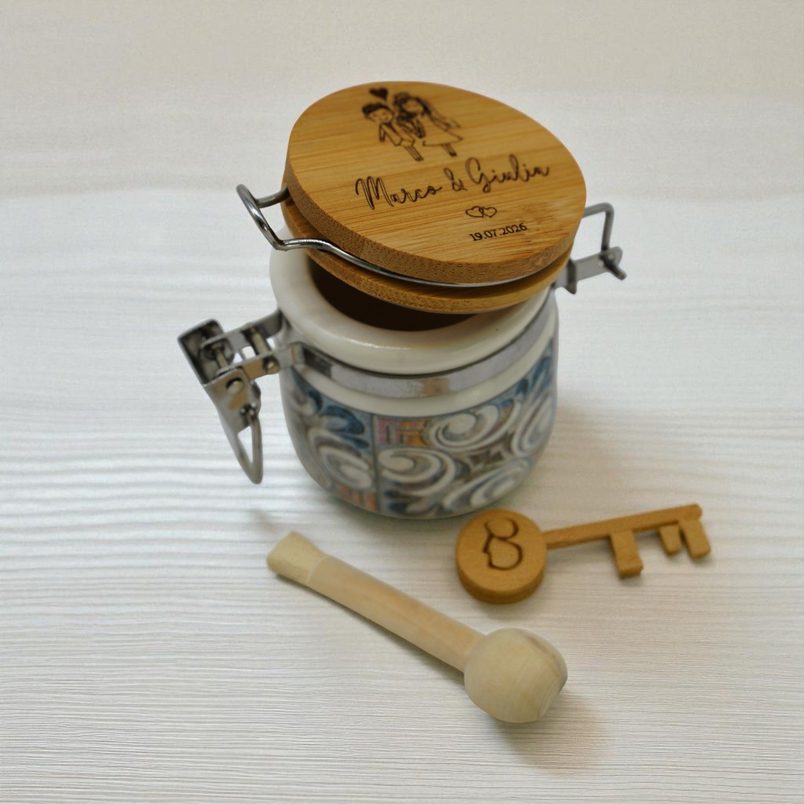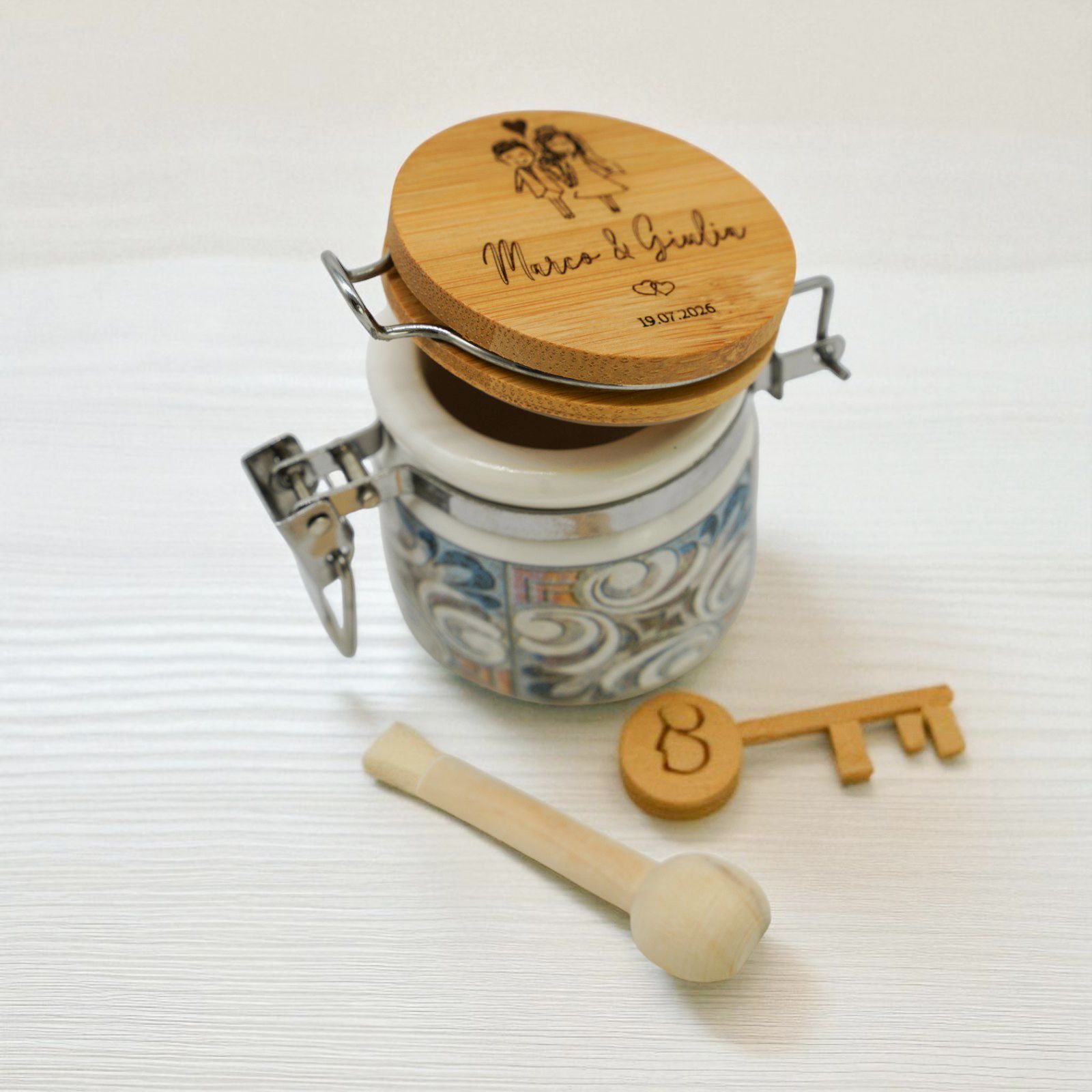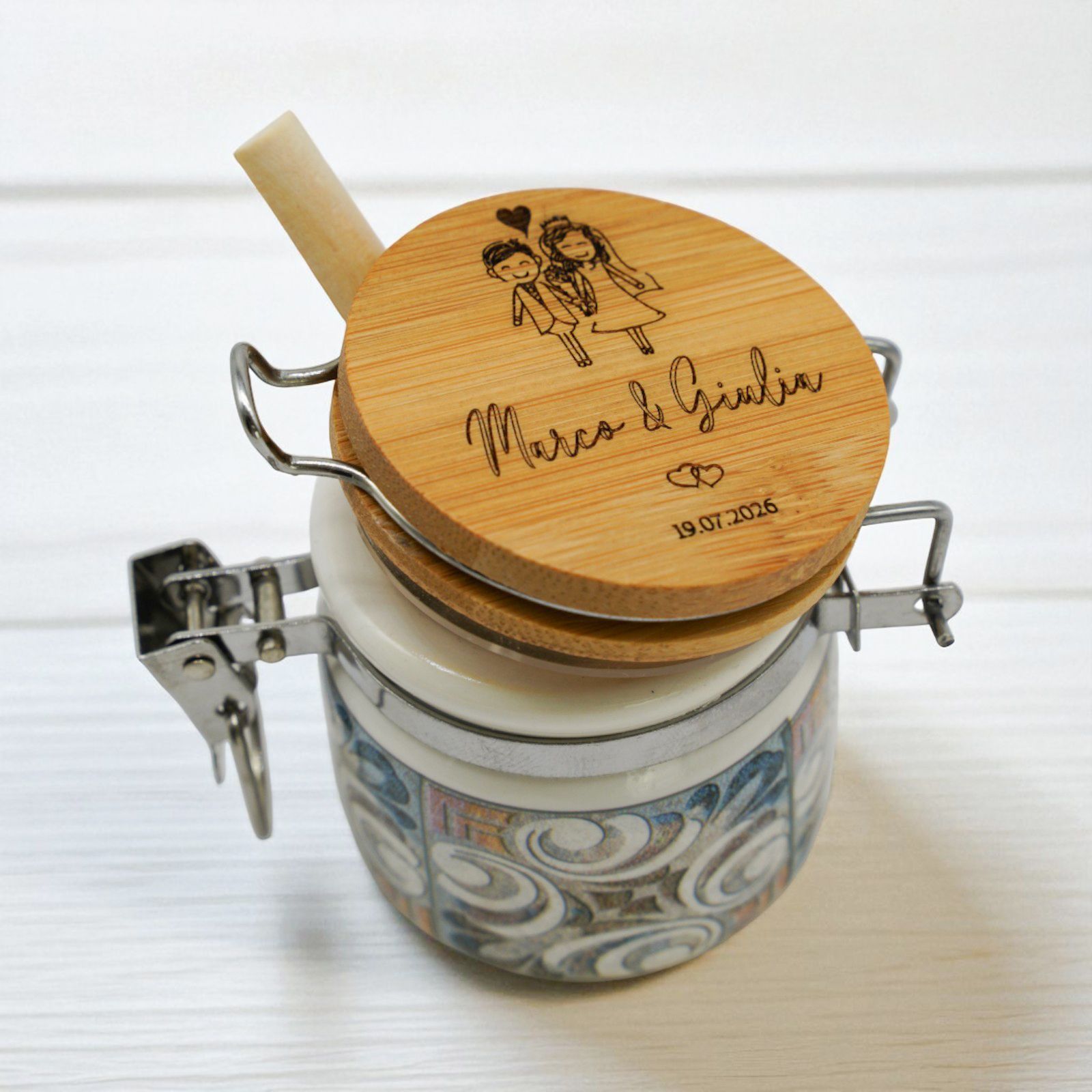 Sposi incisi su un barattolino ermetico personalizzabile: sorprendi i tuoi ospiti con questa dolcissima bomboniera! Decorata con una coppia di sposi mano nella mano e un cuoricino, è personalizzabile con nomi e data ed è perfetta per matrimonio e anniversario.