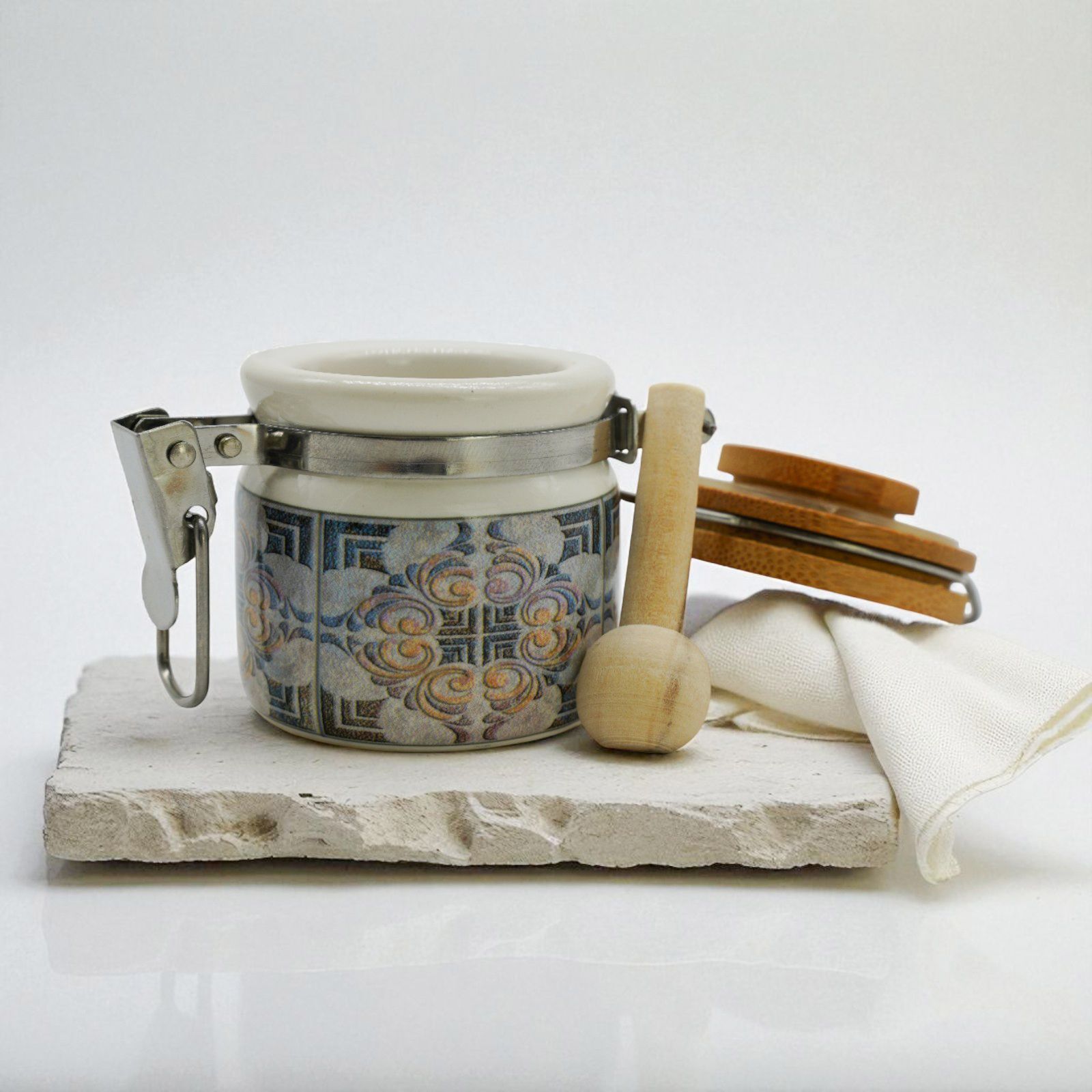 Realizzato in ceramica con fantasia maiolica e tappo in legno naturale, disponibile in due dimensioni: - Standard: h. 6 cm circa; Grande: h. 8 cm circa, questo piccolo gioiello può diventare anche un pratico portaspezie. Bellezza e funzionalità in un unico oggetto!