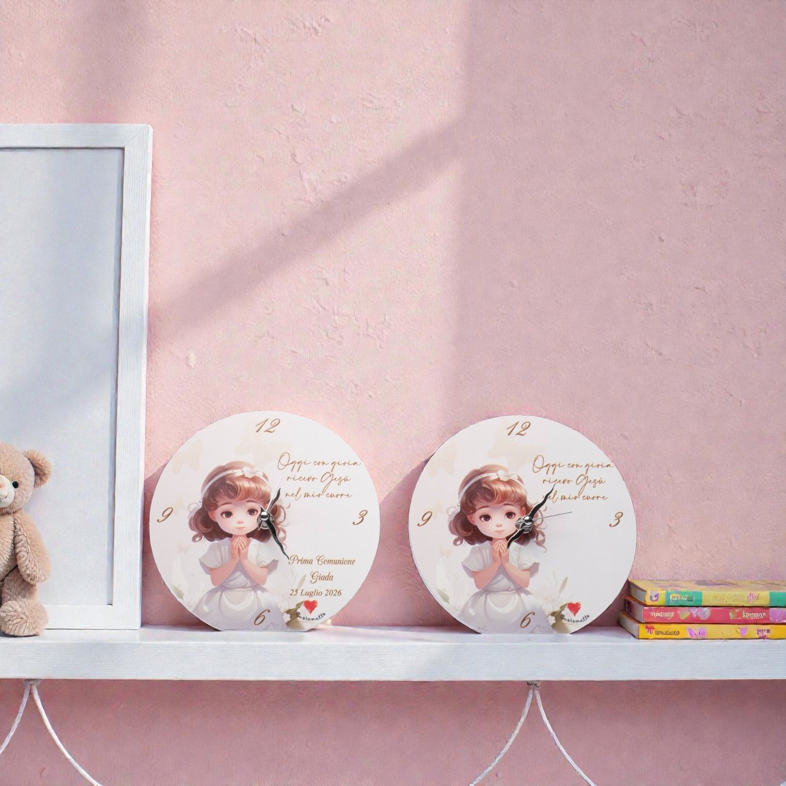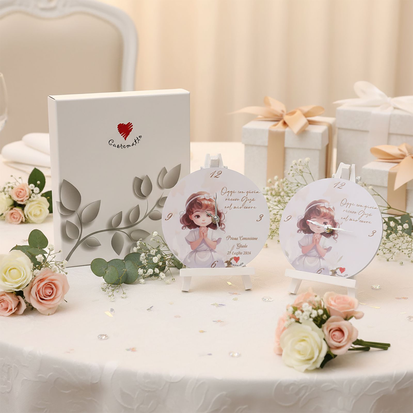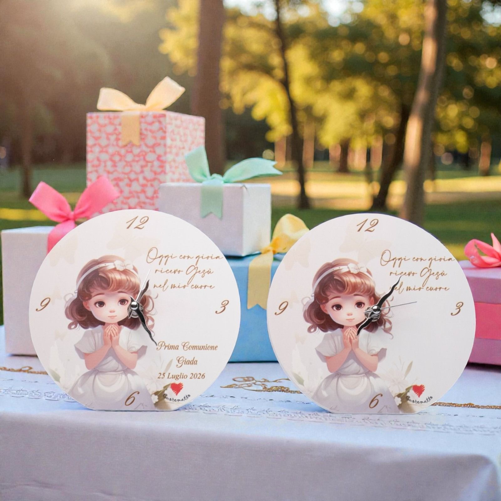 Regala un'emozione unica con le nostre bomboniere personalizzate per la prima comunione! Questo delizioso orologio con la dolce bimba dalle mani a giunte rappresenta un simbolo di crescita e gioia, perfetto per celebrare un momento così speciale nella vita dei più piccoli. Ogni volta che lo si guarda, ricorderà ai bambini l'importanza del tempo e dei valori che accompagnano il loro cammino.