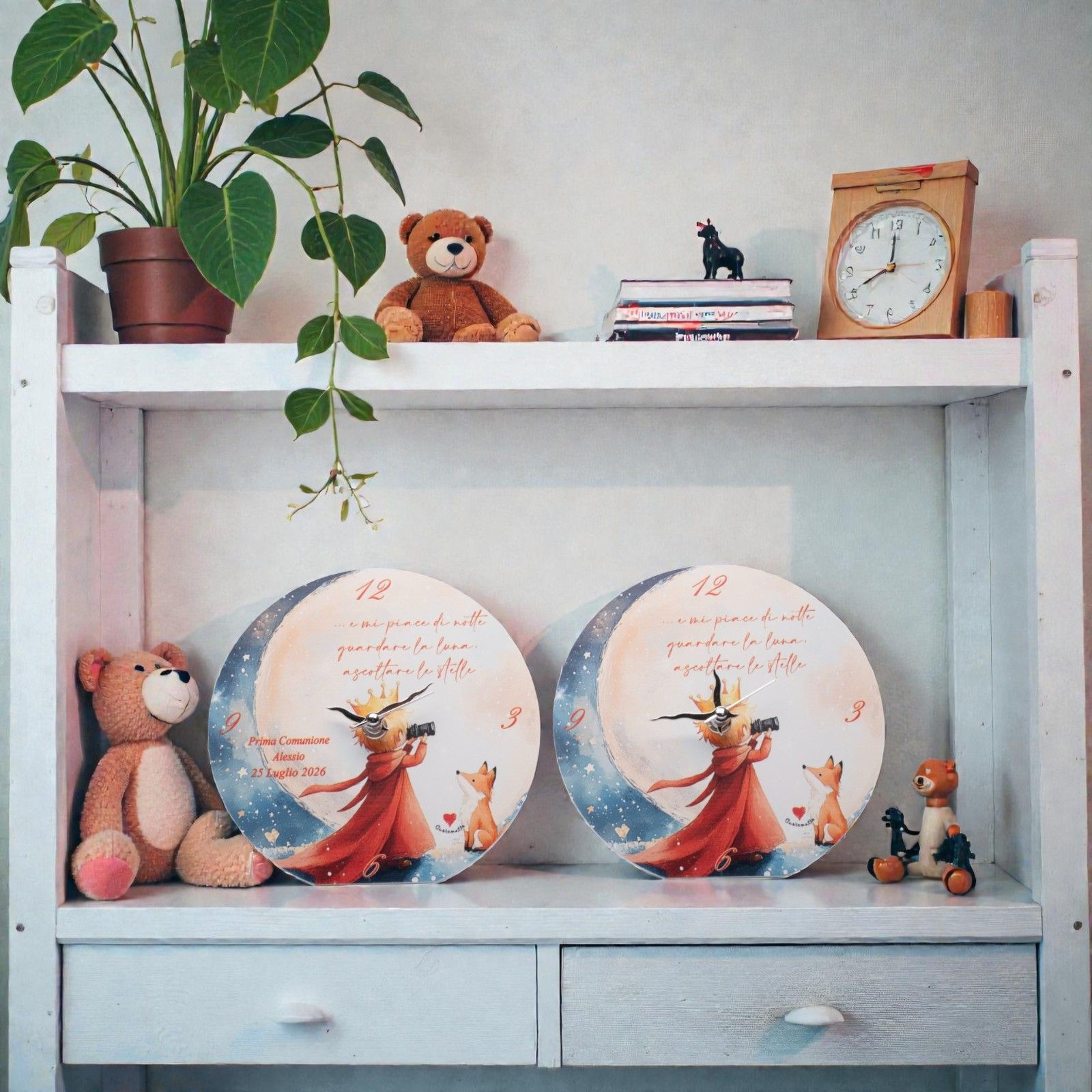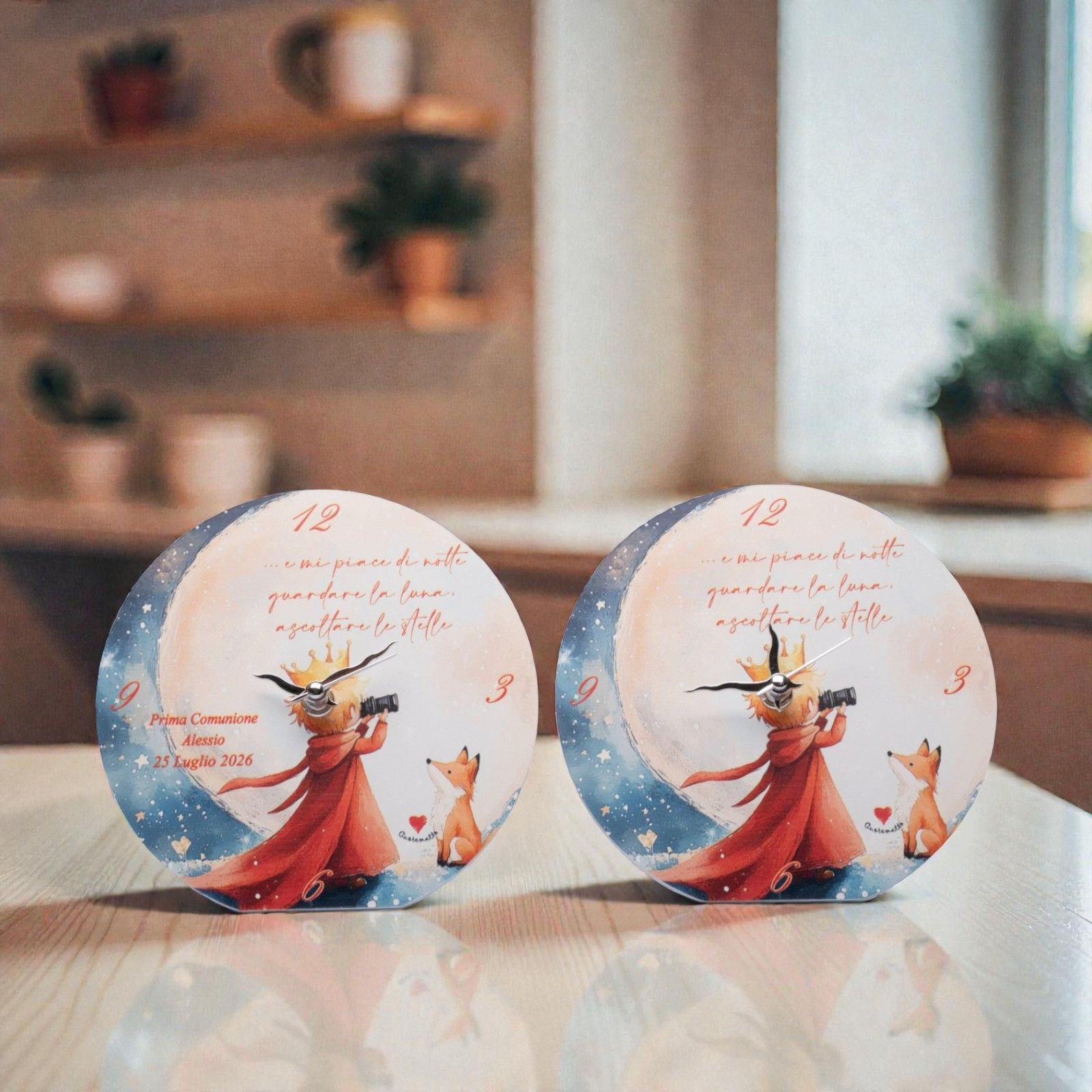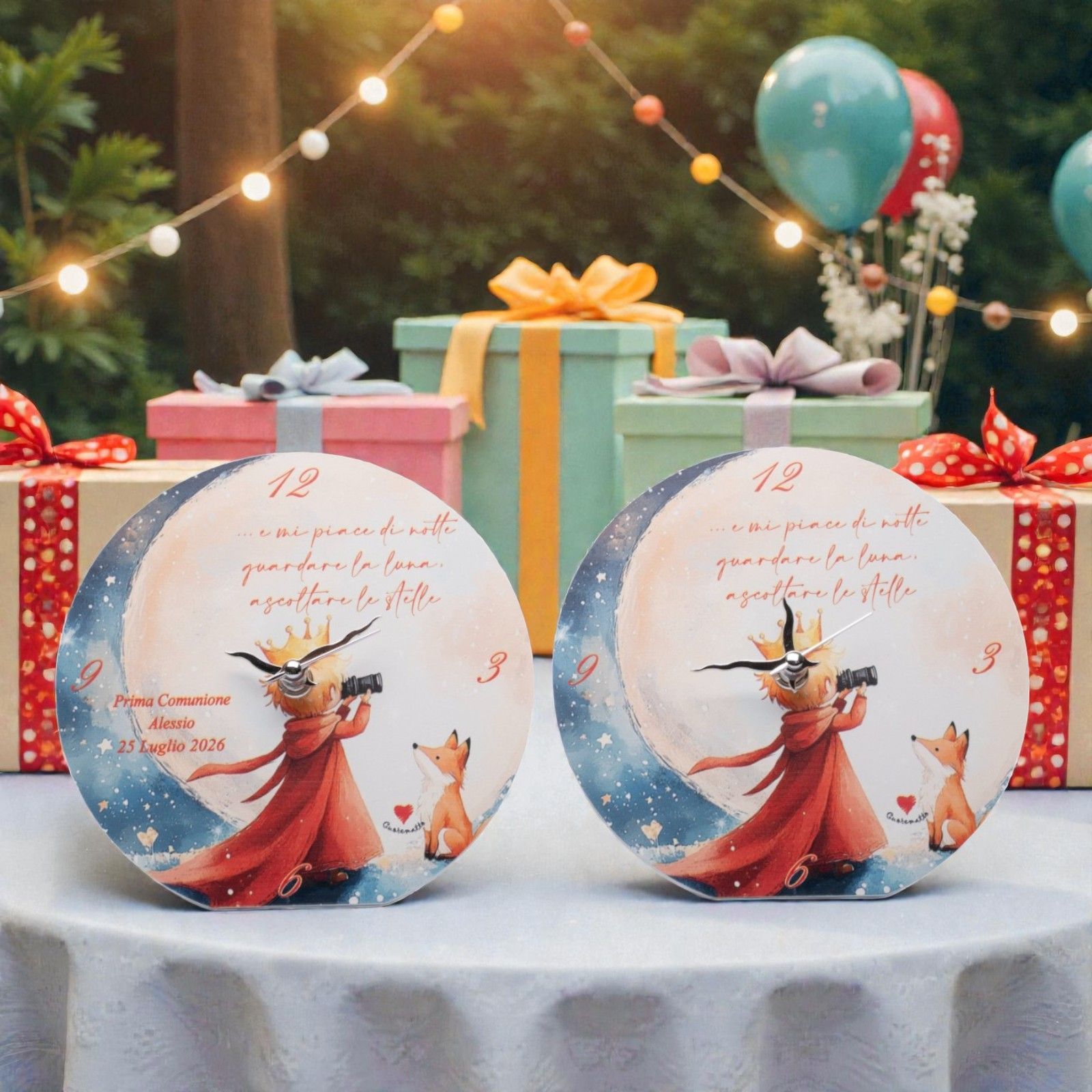 Tra stelle sognanti e simboli di amicizia, questo orologio con il Piccolo Principe che osserva il cielo con il cannocchiale accanto alla volpe diventa una bomboniera dal forte valore emozionale, pensata per ringraziare gli invitati di momenti unici come battesimo e prima comunione. Le delicate tonalità pastello e il tema favola rendono queste bomboniere personalizzate ideali come ricordo poetico e senza tempo per i più piccoli, perfette per chi cerca bomboniere bimbo raffinate e significative.
