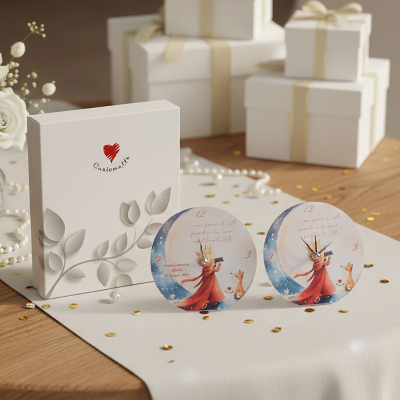 Ogni dettaglio racconta una storia di crescita, purezza e legami autentici: donare una bomboniera a tema favola significa lasciare agli ospiti un messaggio di meraviglia e affetto che dura nel tempo. L’orologio è personalizzabile per rendere ogni evento davvero unico, con un acquisto minimo di 10 pezzi, trasformando la tua celebrazione in un ricordo speciale condiviso con chi ami.