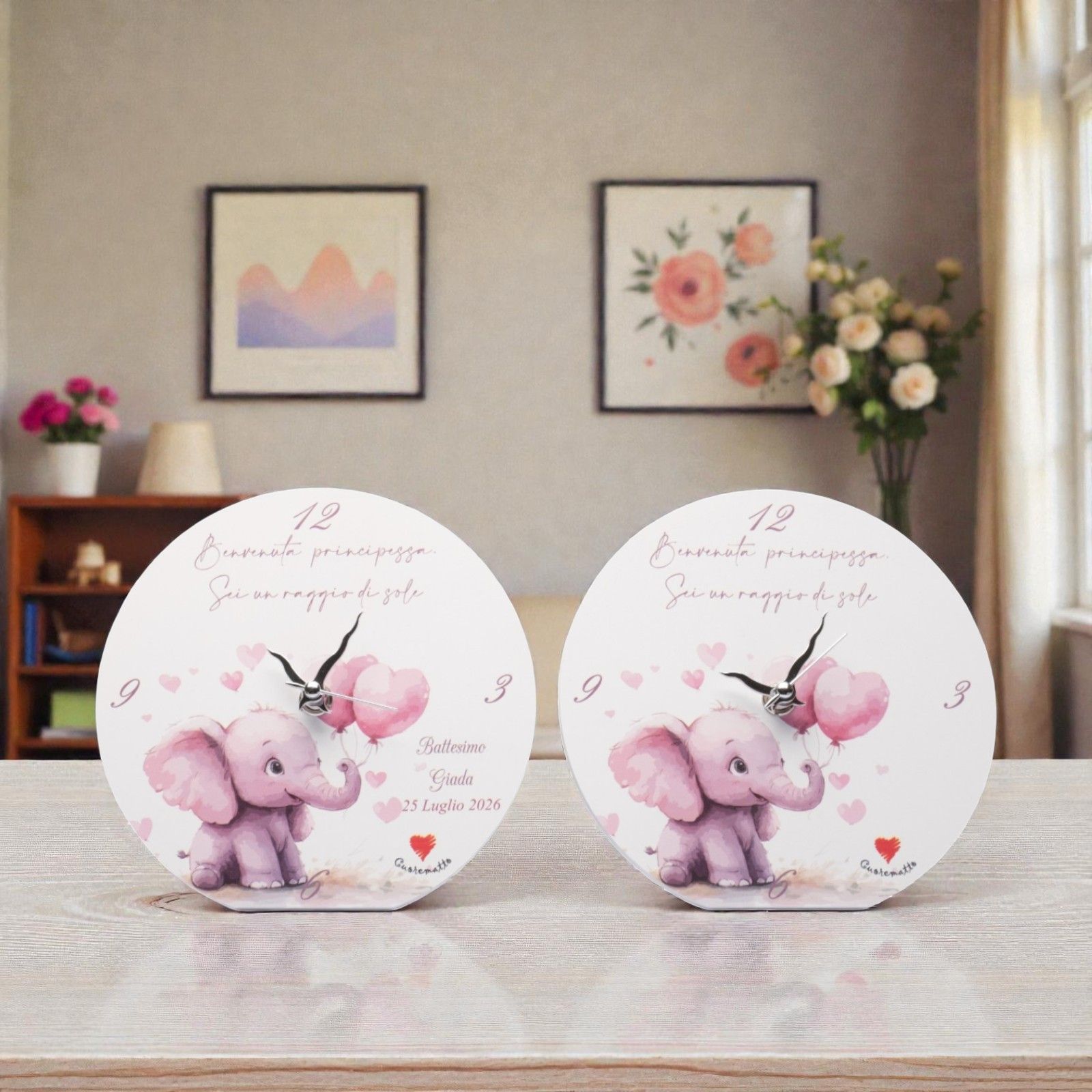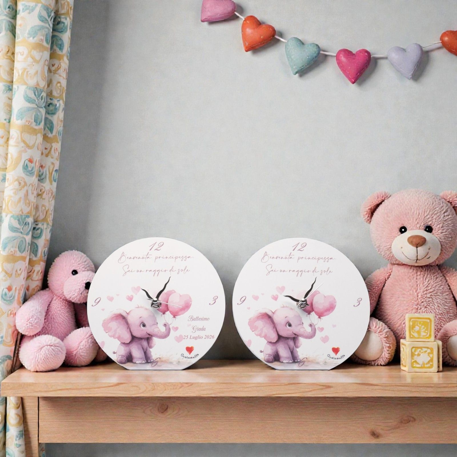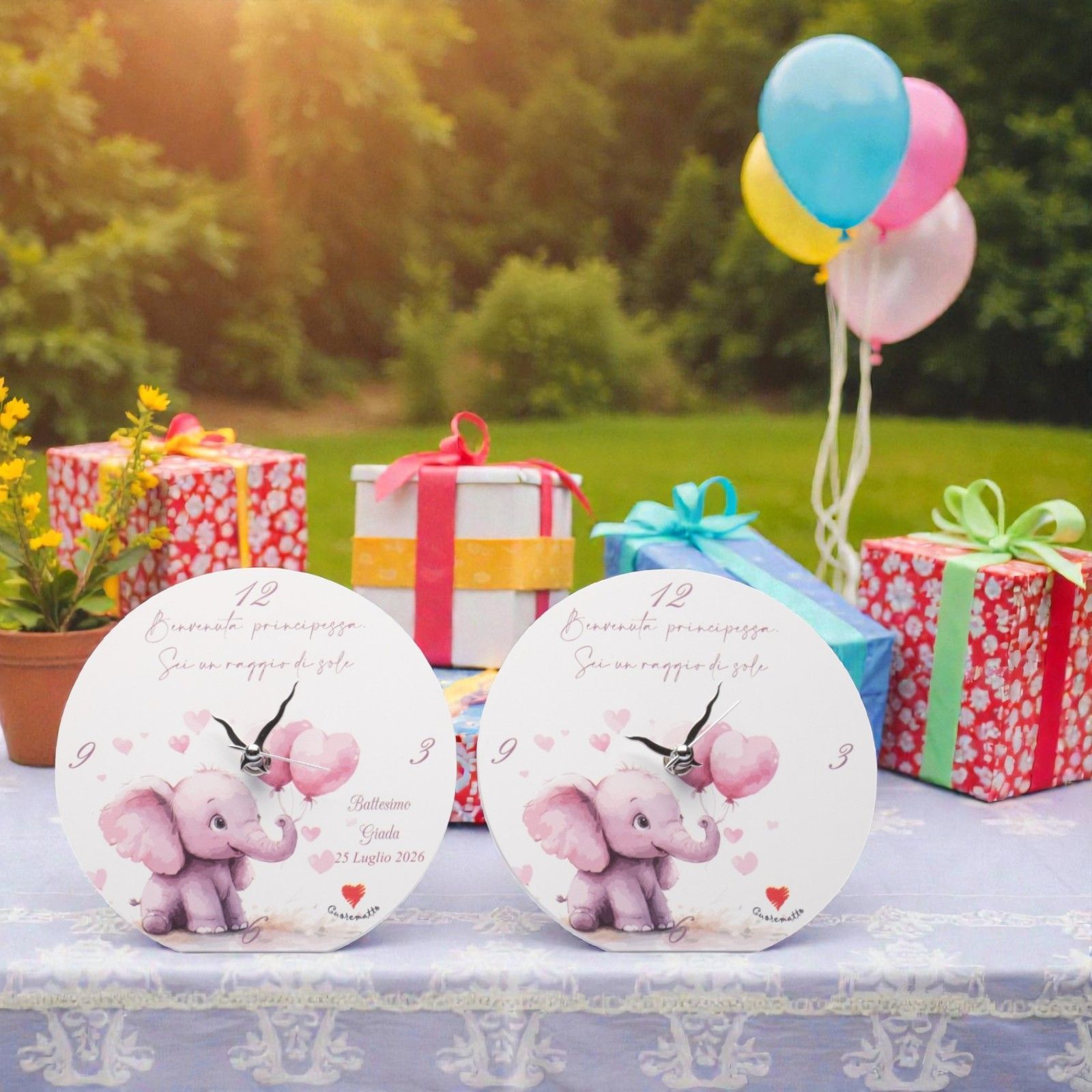 Un dolce elefantino che tiene tra la proboscide palloncini a forma di cuore rende questo orologio una bomboniera tenera e indimenticabile, perfetta per festeggiare un battesimo femminile. I dettagli rosa aggiungono un tocco di delicatezza e tenerezza, trasformando ogni pezzo in una delle bomboniere personalizzate più affascinanti per chi desidera bomboniere bimba dolci e significative.