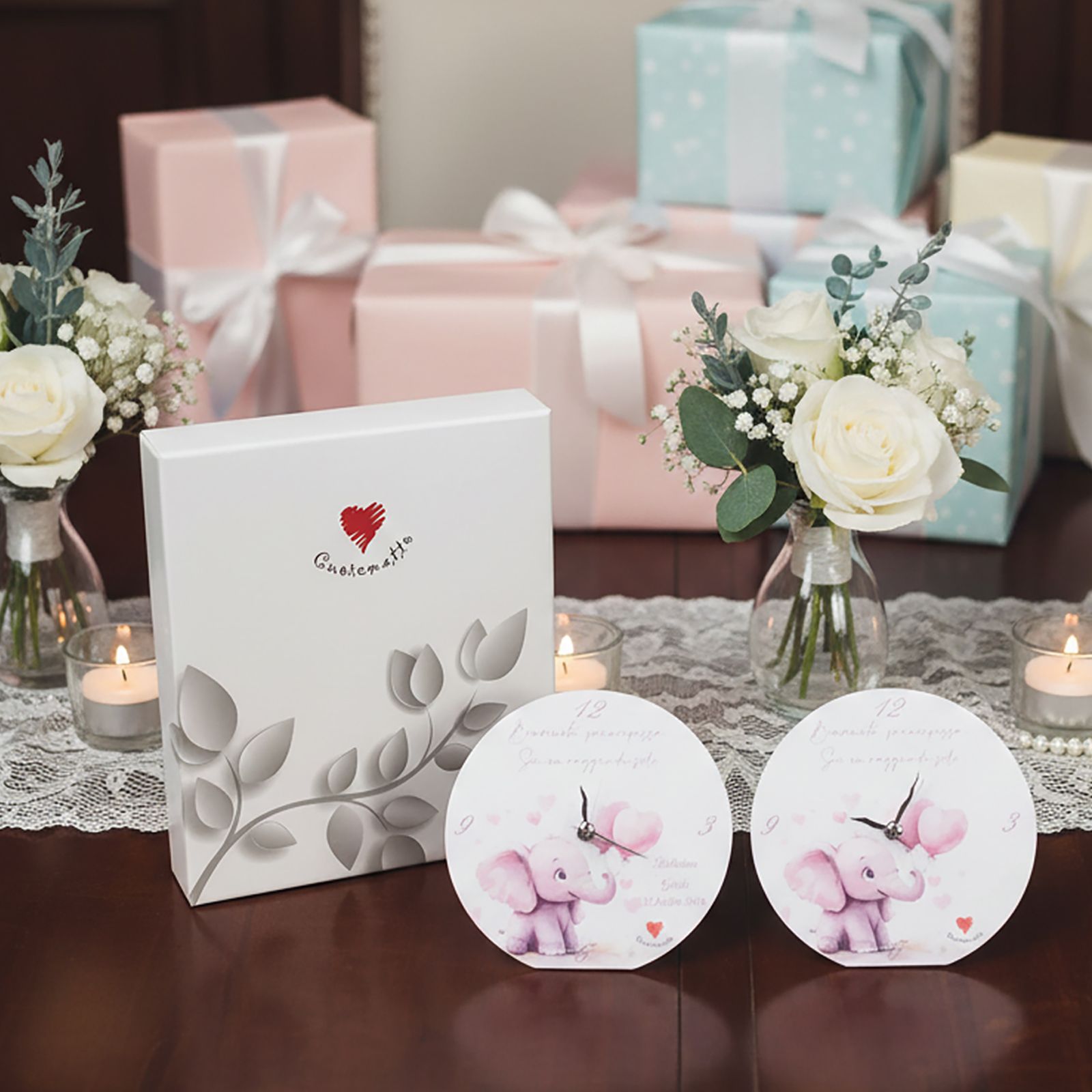 Donare una bomboniera come questa significa condividere con gli invitati un messaggio di amore, gioia e protezione. L’elefantino simboleggia forza e affetto, mentre i cuori esprimono emozione pura: un ricordo che rimane nel tempo. L’orologio è personalizzabile con nomi e data, con un acquisto minimo di 10 pezzi, rendendo ogni celebrazione unica e speciale.