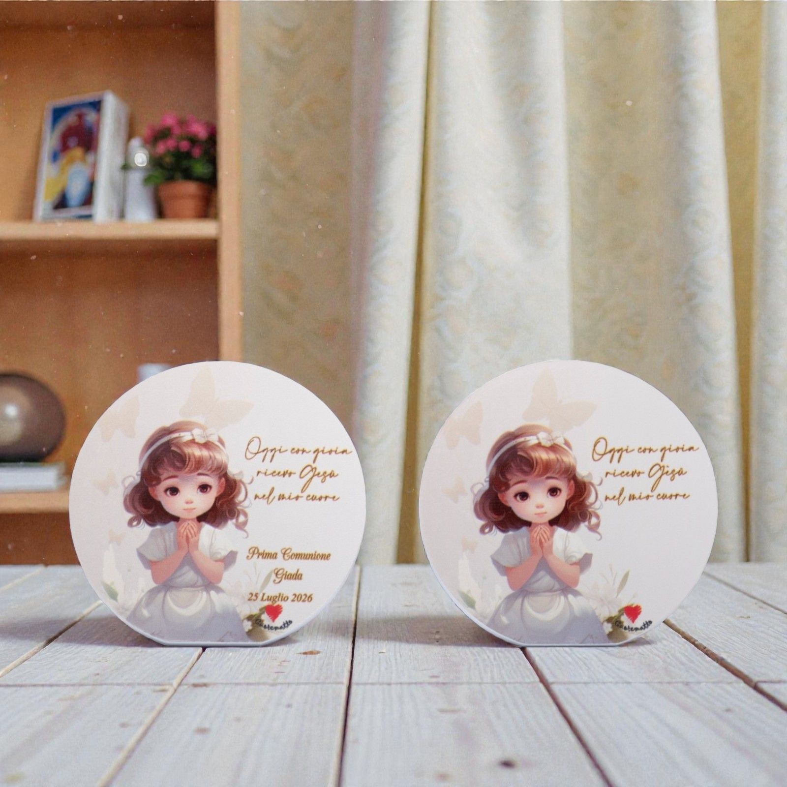 Lascia che il tuo evento speciale brilli con le nostre bomboniere personalizzate, pensate per celebrare la prima comunione della tua bimba. Questo delizioso quadretto, che raffigura una dolce bimba con le mani giunte in preghiera, rappresenta non solo un simbolo di fede, ma anche di amore e gratitudine. Ogni dettaglio è realizzato con cura per rendere questo regalo un ricordo indelebile del giorno più importante.