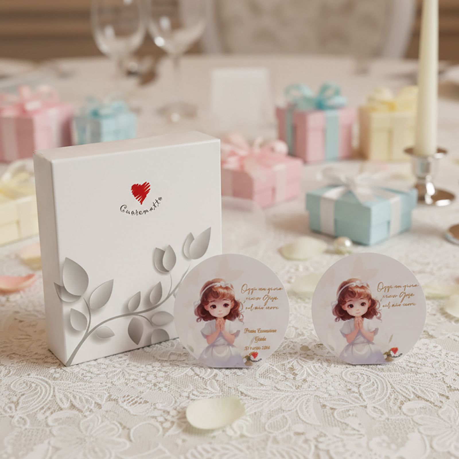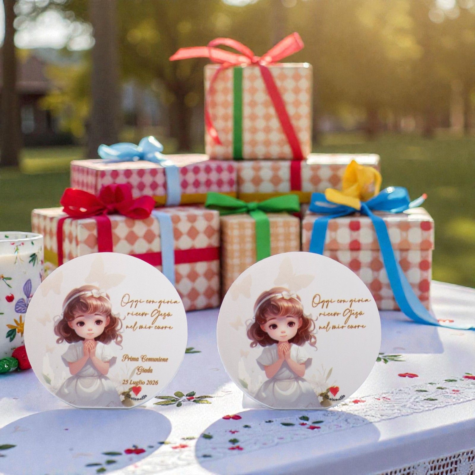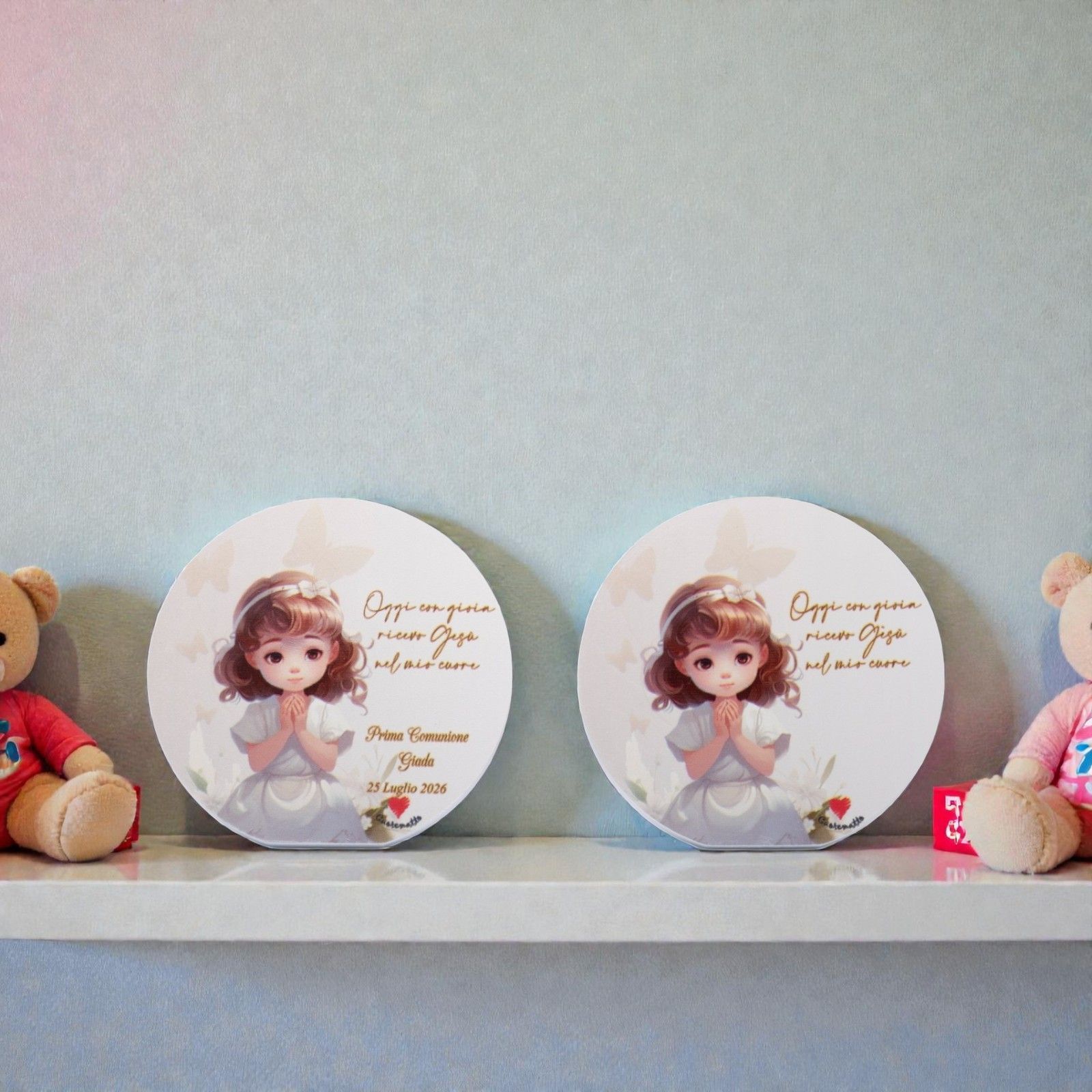 Immagina la gioia nei volti degli invitati quando riceveranno questa bomboniera unica, perfetta per le bomboniere prima comunione bimba. Realizzata con colori pastello delicati, il quadretto si adatta a qualsiasi tema e arredamento, diventando così un elemento prezioso in ogni casa. Inoltre, ogni acquisto include una scatola regalo elegante, pronta per essere donata.