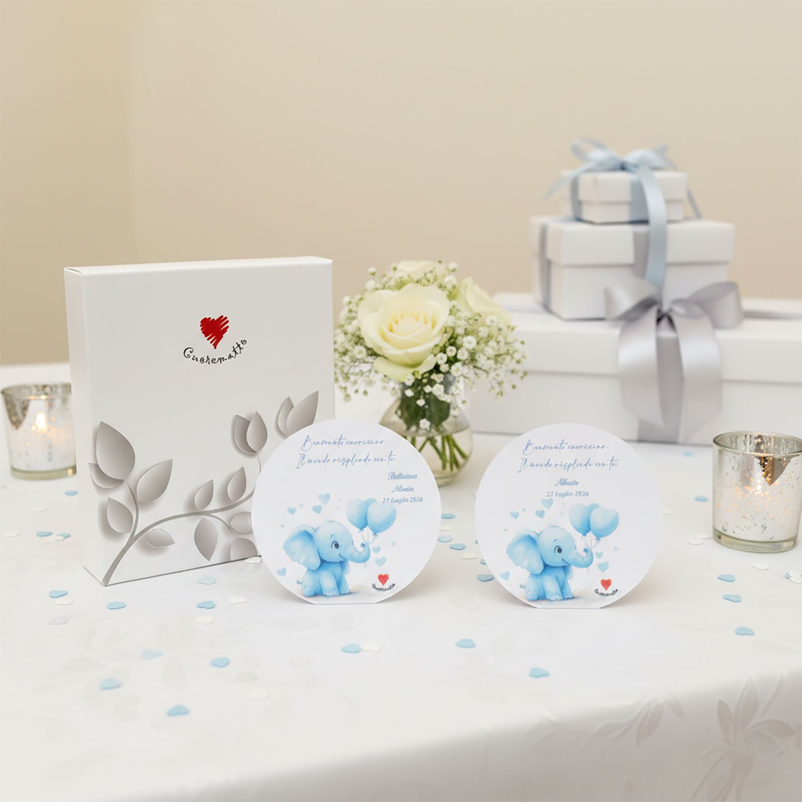 Immagina di donare un'emozione indimenticabile con le nostre bomboniere personalizzate. Il quaretto con il dolce elefantino, che tiene in equilibrio dei palloncini a forma di cuore, rappresenta l’amore e la dolcezza che circondano il battesimo del tuo piccolo. Ogni dettaglio è pensato per celebrare un momento unico, rendendo il tuo evento ancora più speciale. Non è solo un regalo, è un ricordo che resterà nel cuore di chi lo riceve!