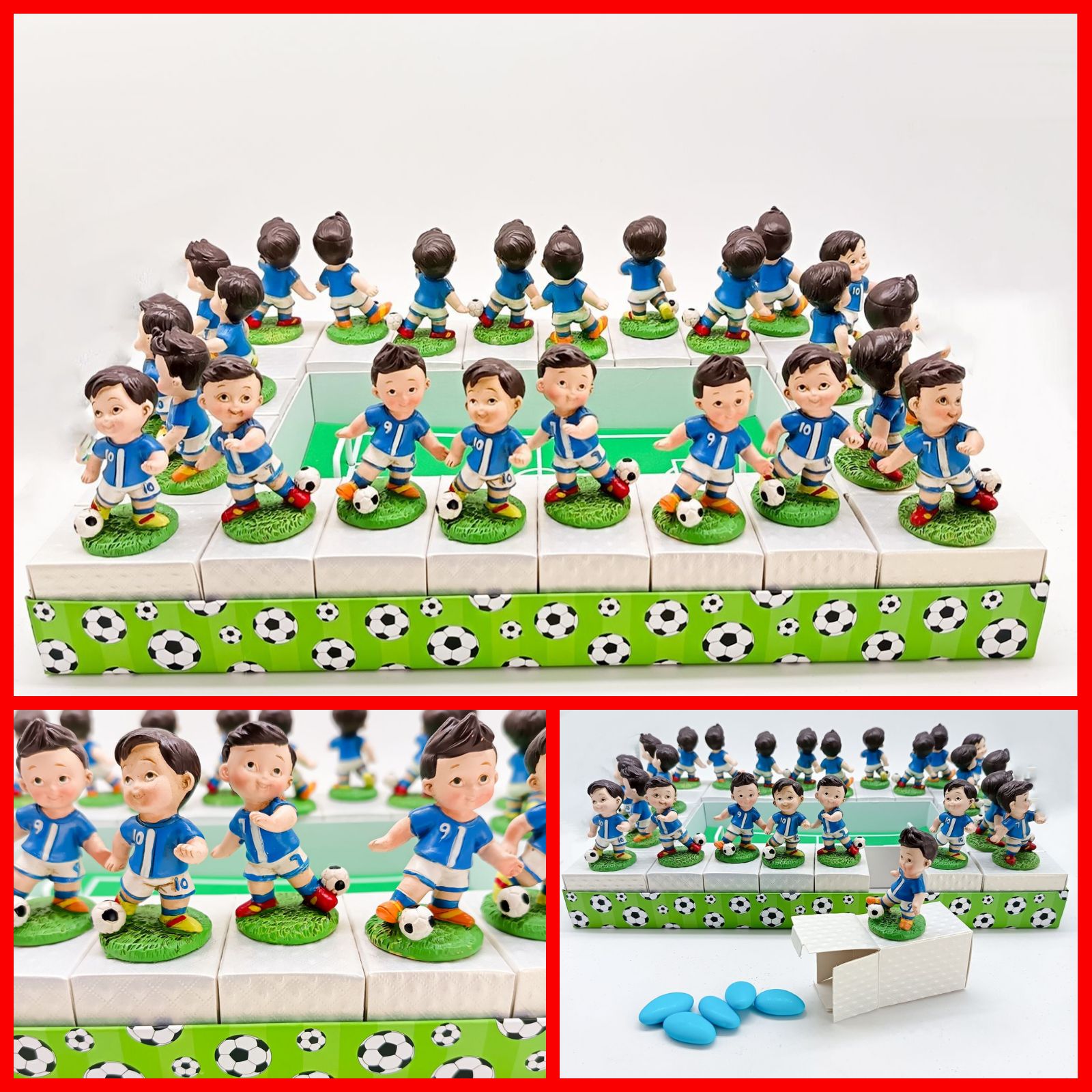 Le torte di bomboniere a tema sono perfette per arricchire la tavola della festa con dettagli decorativi unici, capaci di conquistare gli appassionati di calcio di tutte le età. La torta misura circa 24x37 cm, mentre ogni scatolina singola misura circa 5,8x4x4 cm, mentre il calciatore ha un altezza di 6.5 cm circa.