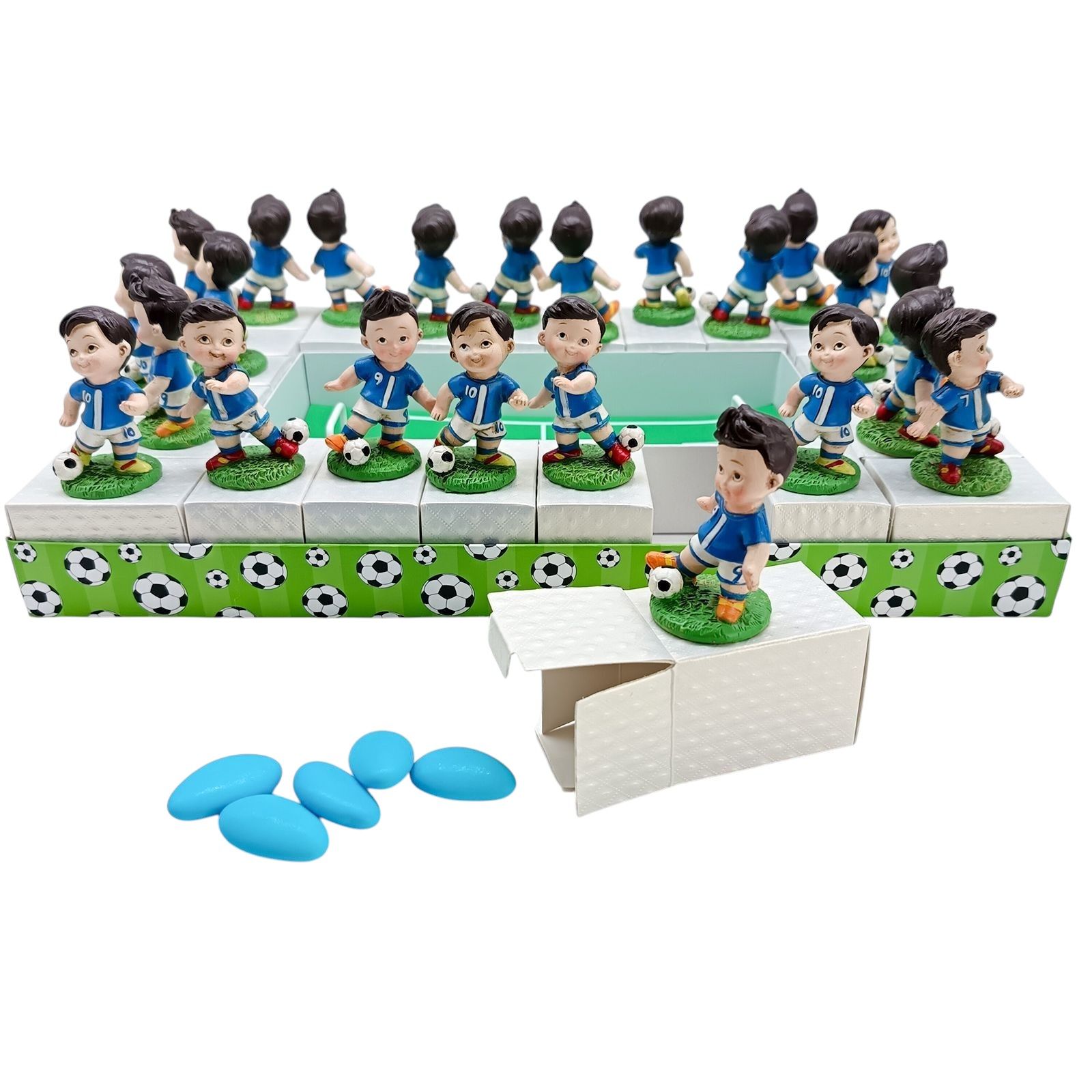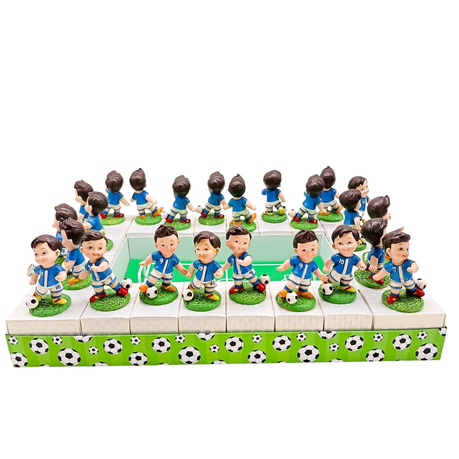 Vuoi stupire gli invitati con un’idea diversa dal solito? Scegli questa torta di bomboniere a tema calcio, perfetta per compleanni o comunioni. Una composizione rettangolare bianca e verde, con 24 scatoline in cartoncino decorate da palloni e porte centrali in metallo. Su ogni fetta, una statuina di calciatore in resina, proposta in tre modelli assortiti dai colori pastello.