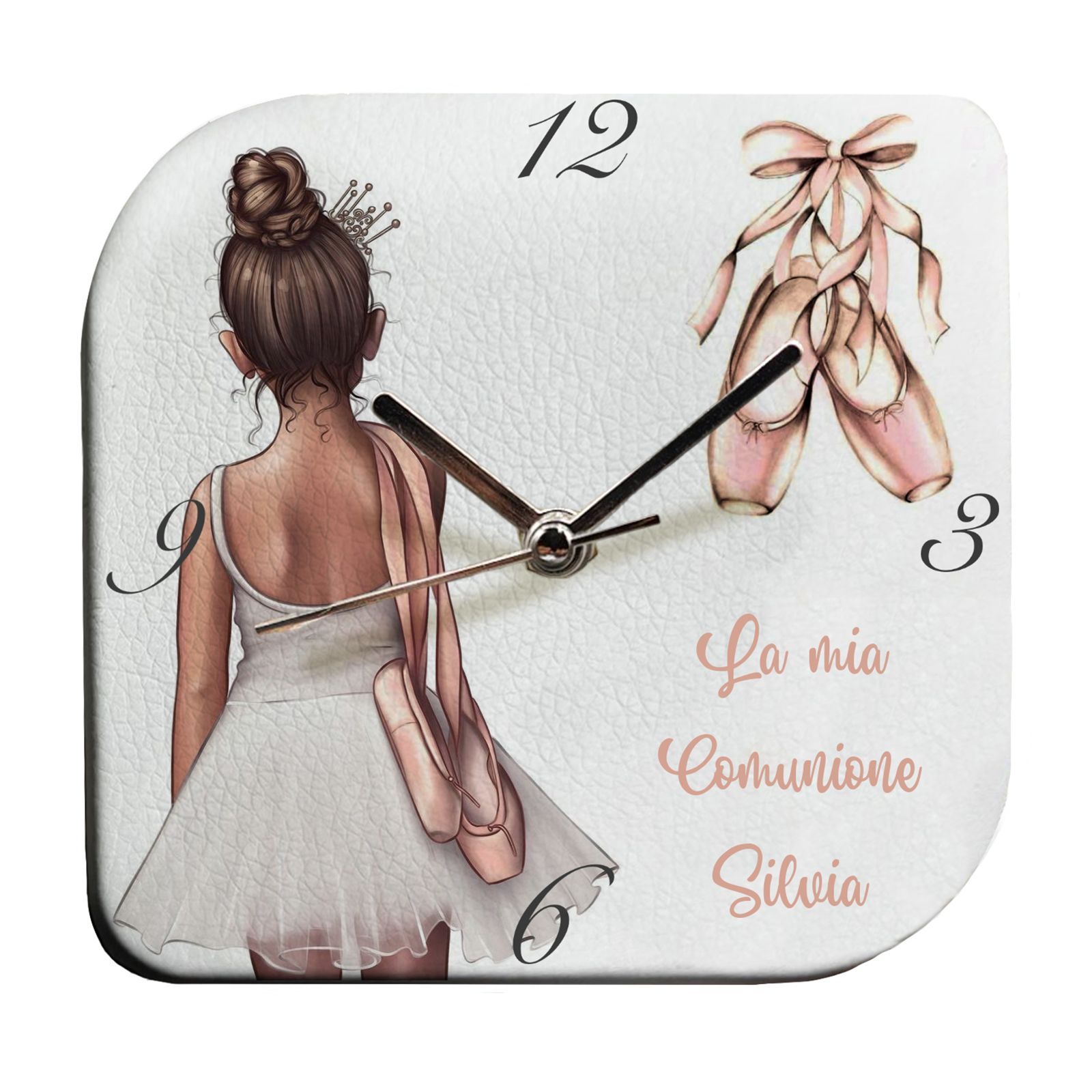 Se desideri bomboniere uniche ed eleganti per la prima comunione, la nostra nuova collezione saprà sorprenderti. Questo raffinato orologio in ecopelle raffigura una delicata ballerina di spalle, avvolta nel suo vaporoso tutù, con le scarpette da ballo adagiate sulle spalle. Un simbolo di grazia e passione che renderà il tuo evento ancora più speciale.